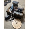 Job lot box, includes speaker, wooden clock, iron, lamp, headphones, technika dvd player with remote, hair tools and karaoke microphone