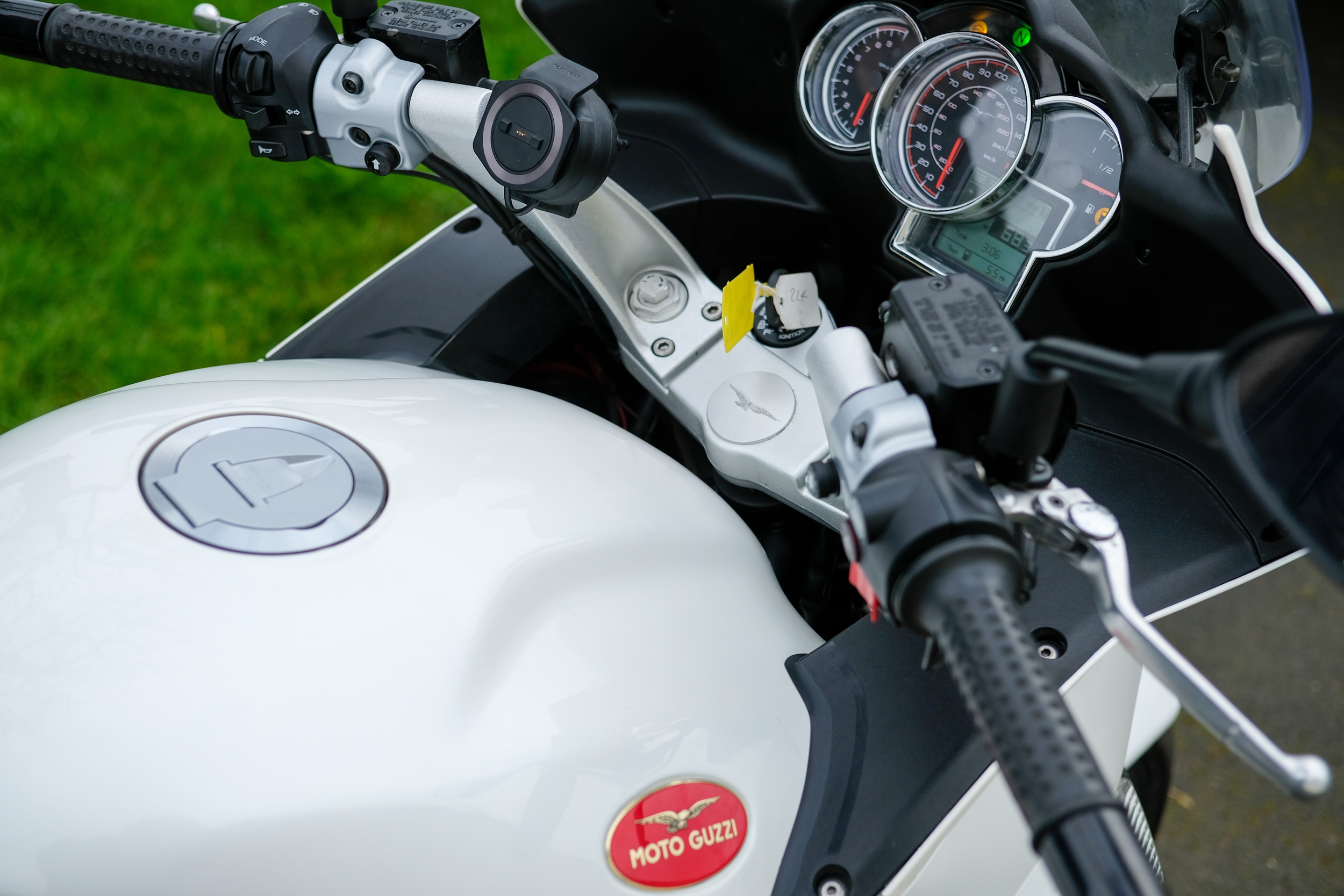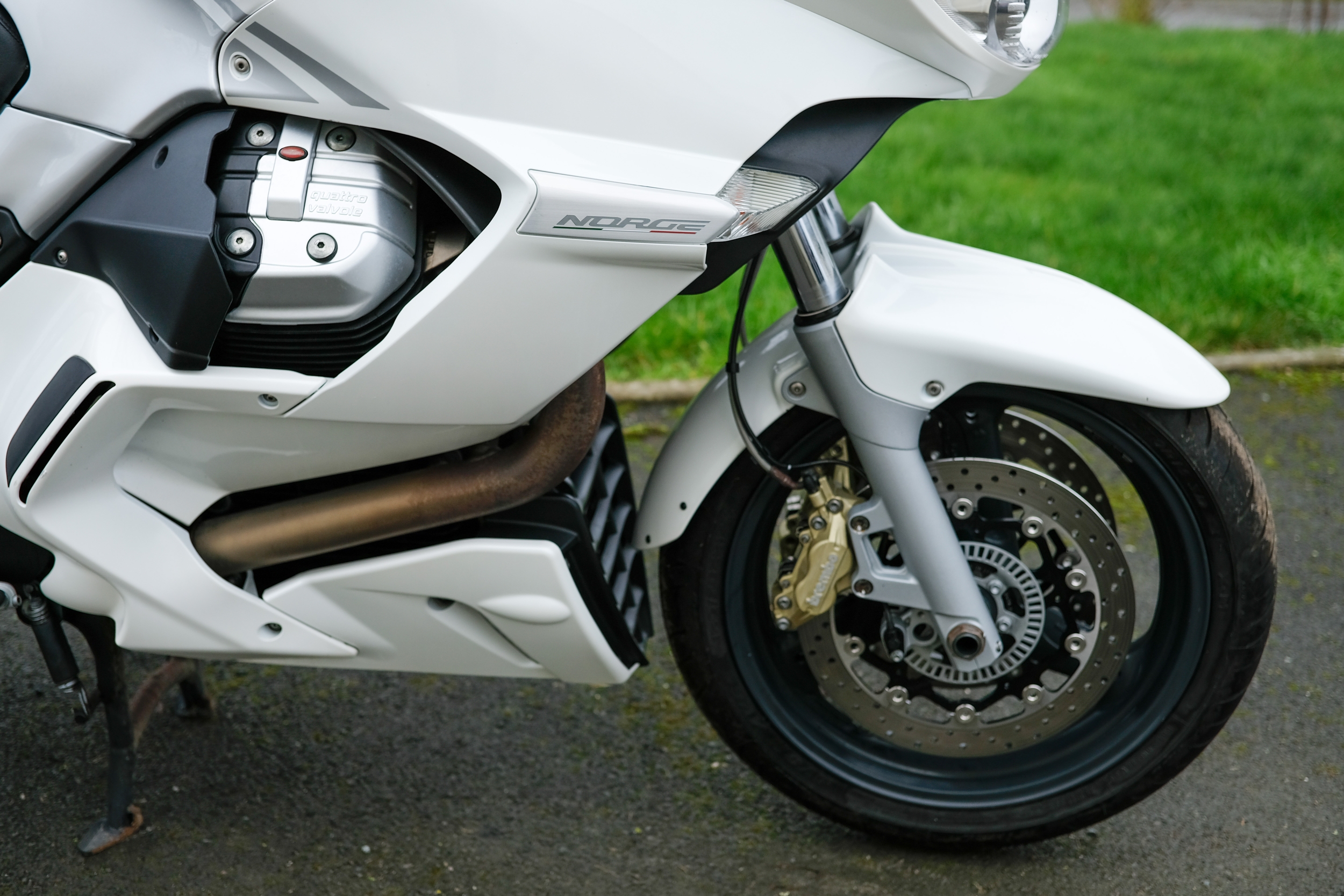 Designed for comfort on extended journeys, the Norge features an electrically adjustable windscreen, heated grips, and a plush seat with ample room for a pillion. Genuine Moto Guzzi panniers provide practical storage, making it a superb option for two-up touring. Suspension is managed by a 45mm telescopic fork and a rear monoshock, offering a stable, composed ride, while dual 320mm front discs with Brembo calipers provide strong braking performance.