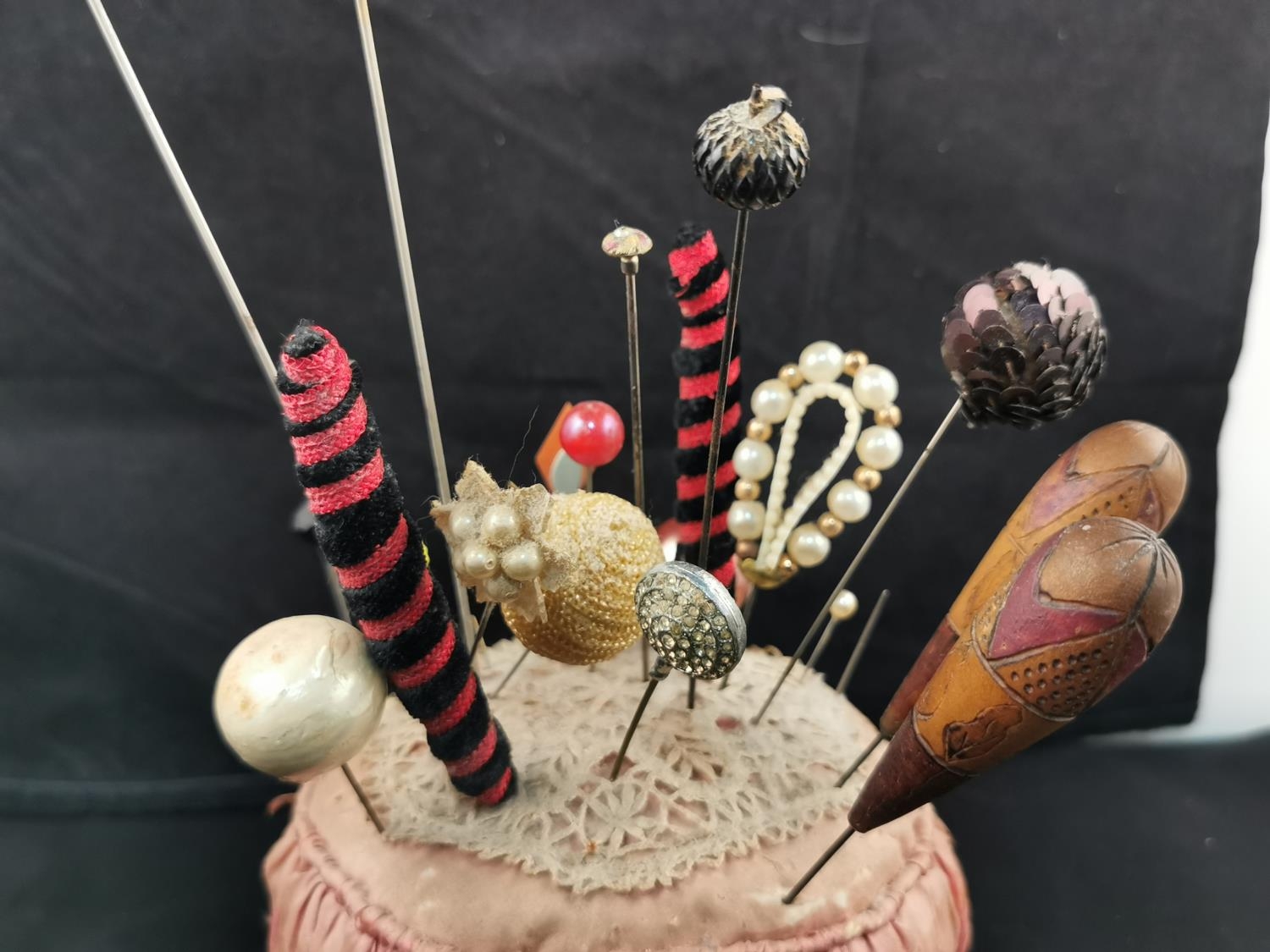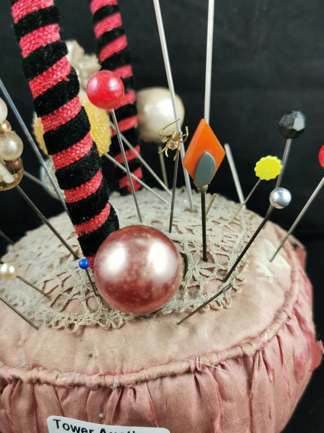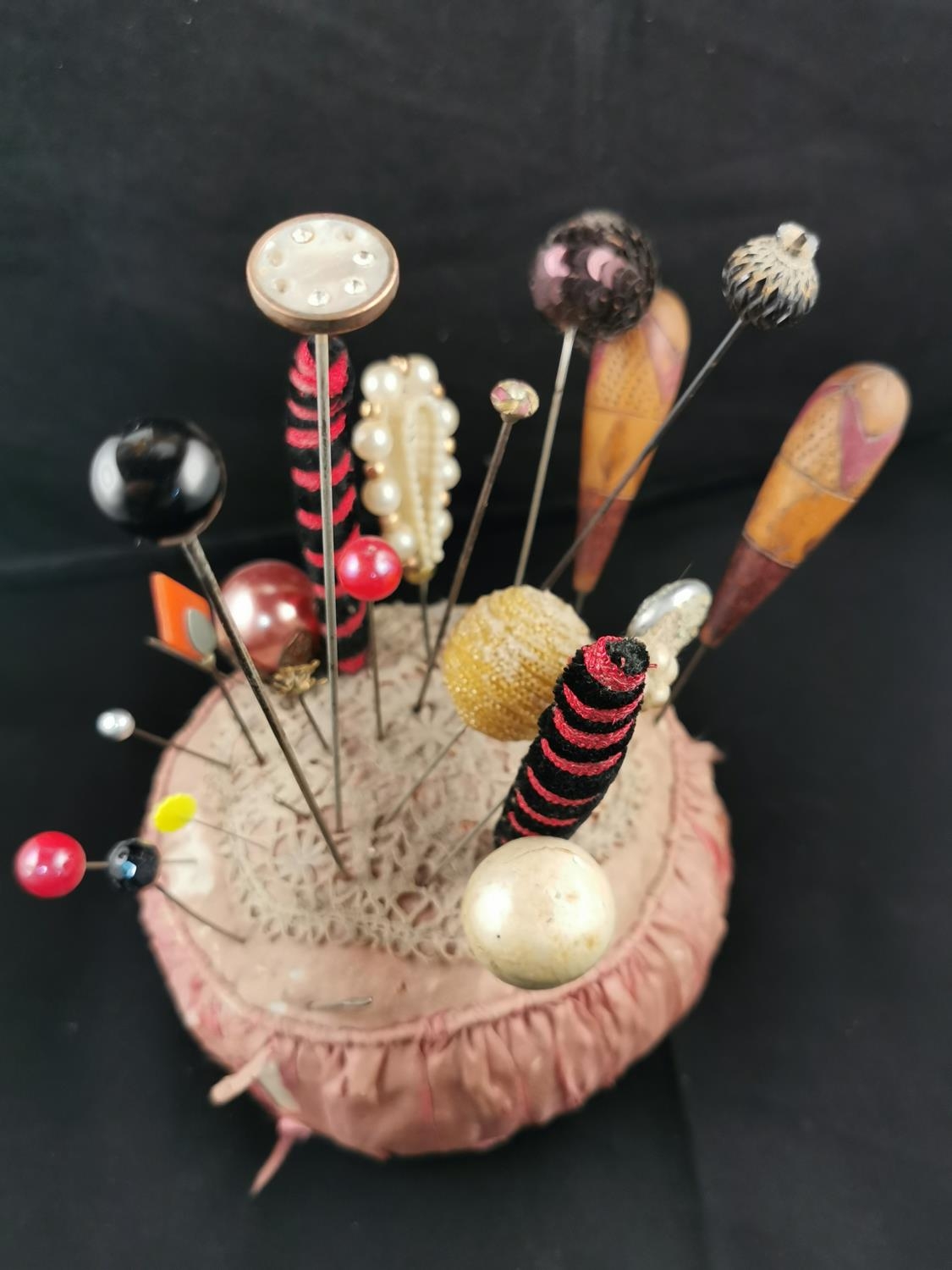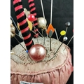 Large Victorian pin cushion containing a large quantity of various types of hat pins