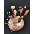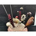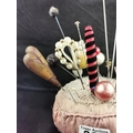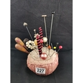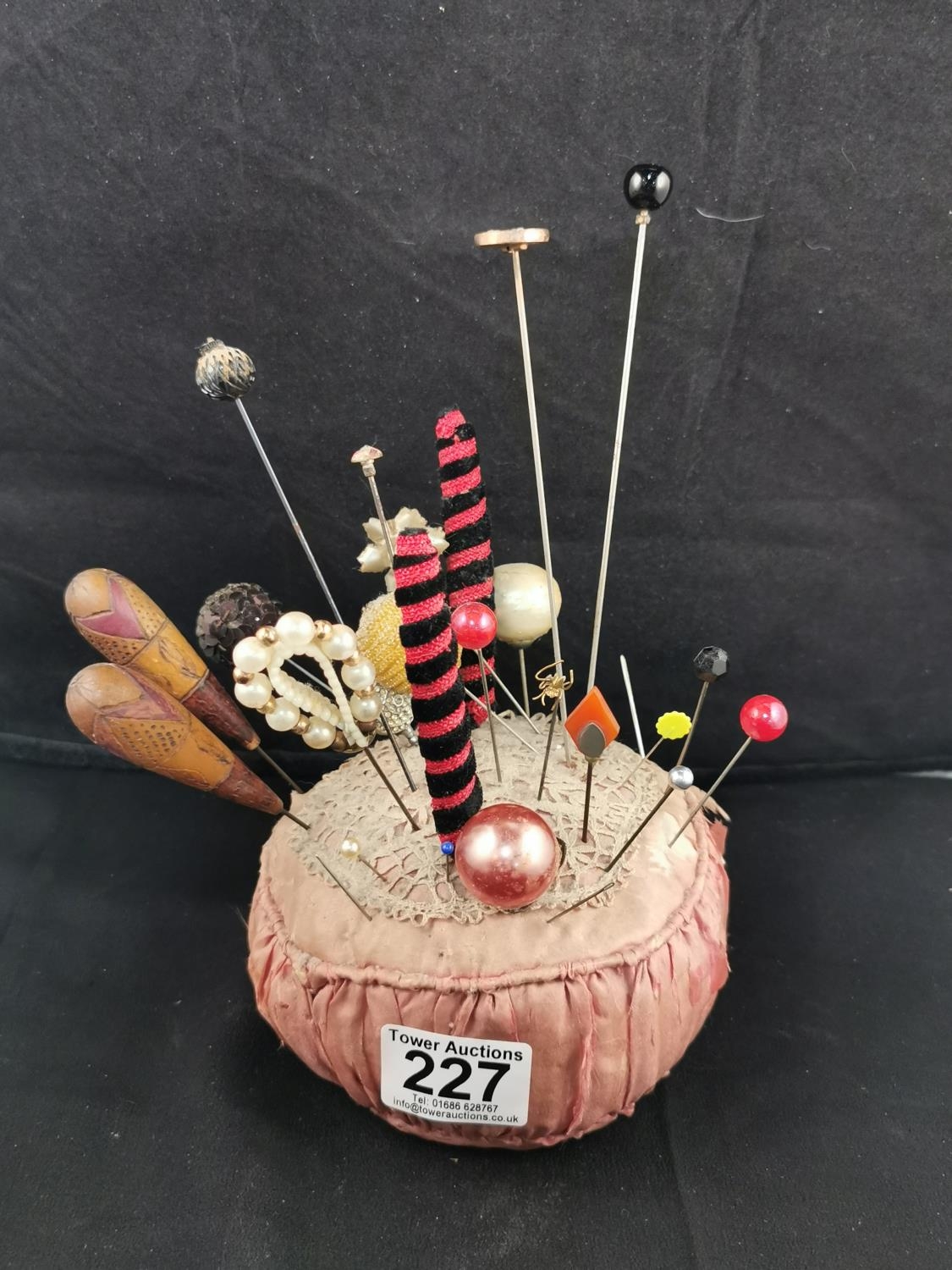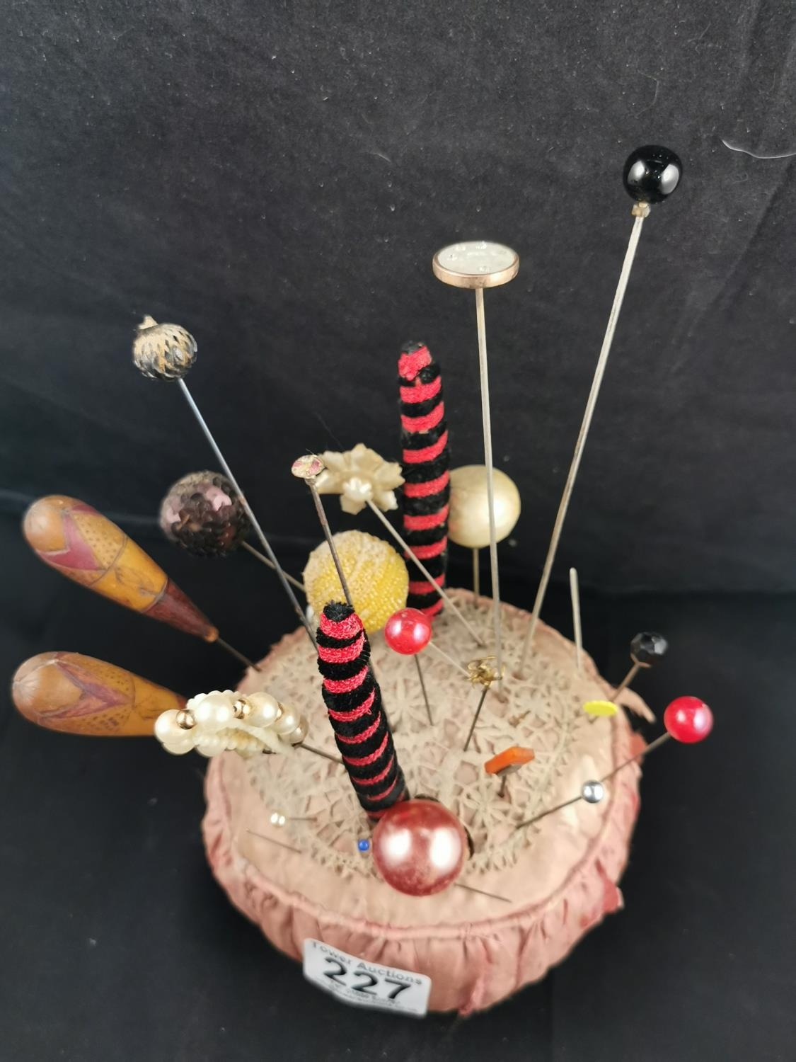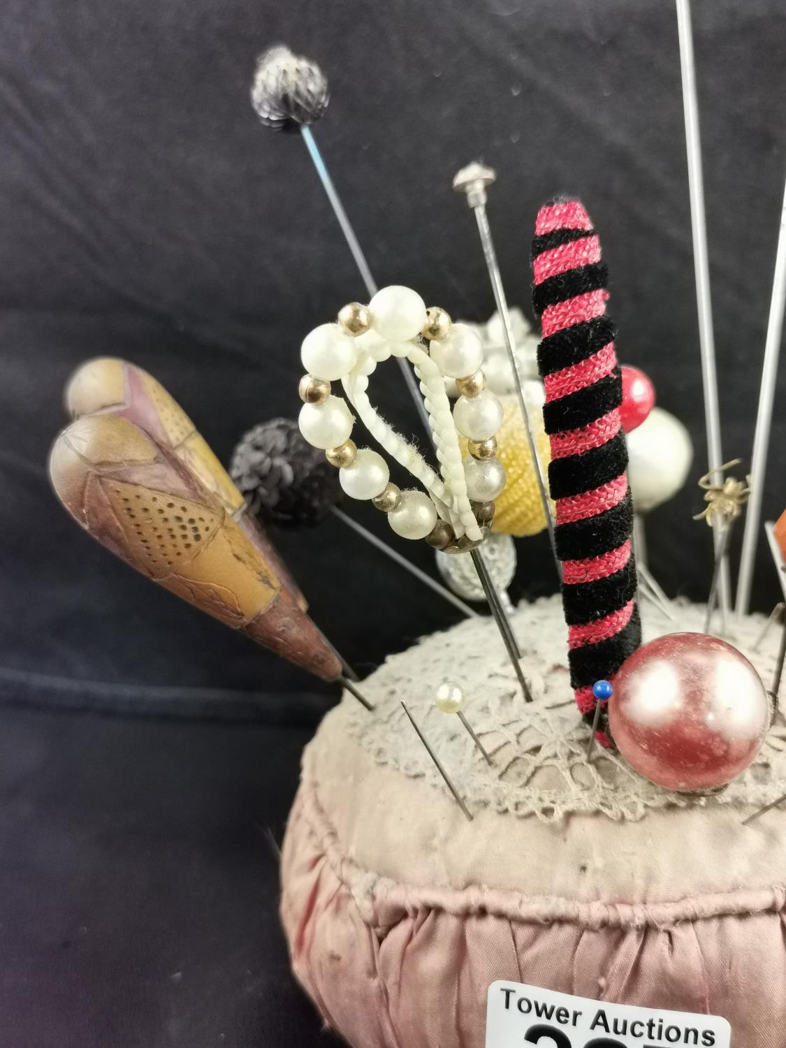 Large Victorian pin cushion containing a large quantity of various types of hat pins