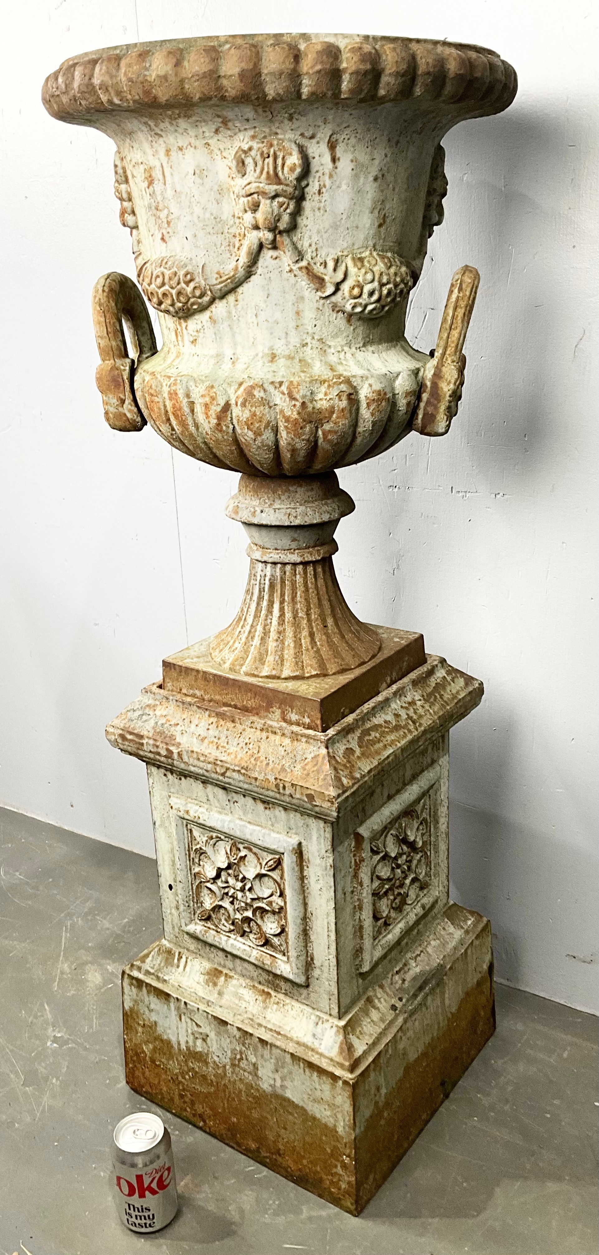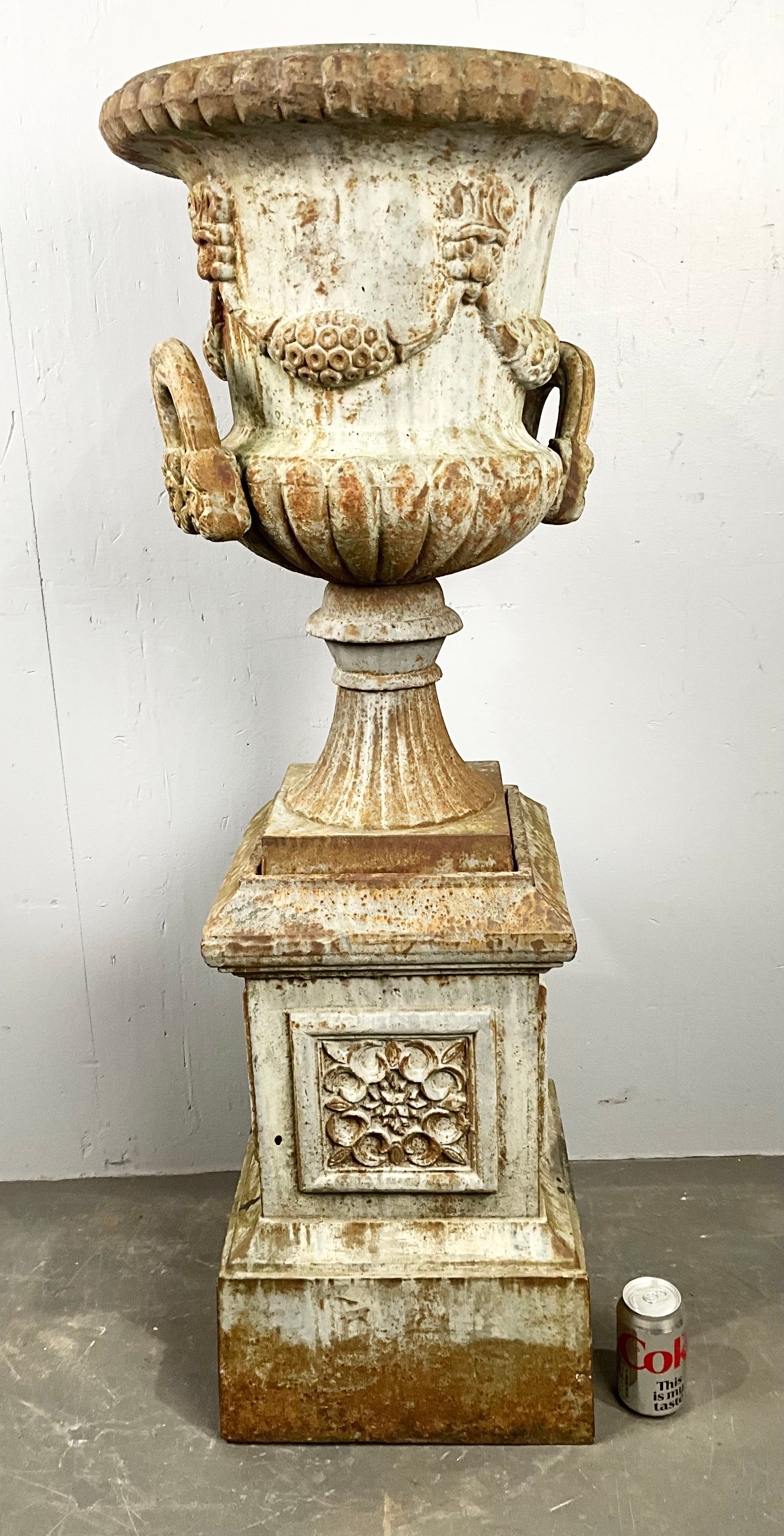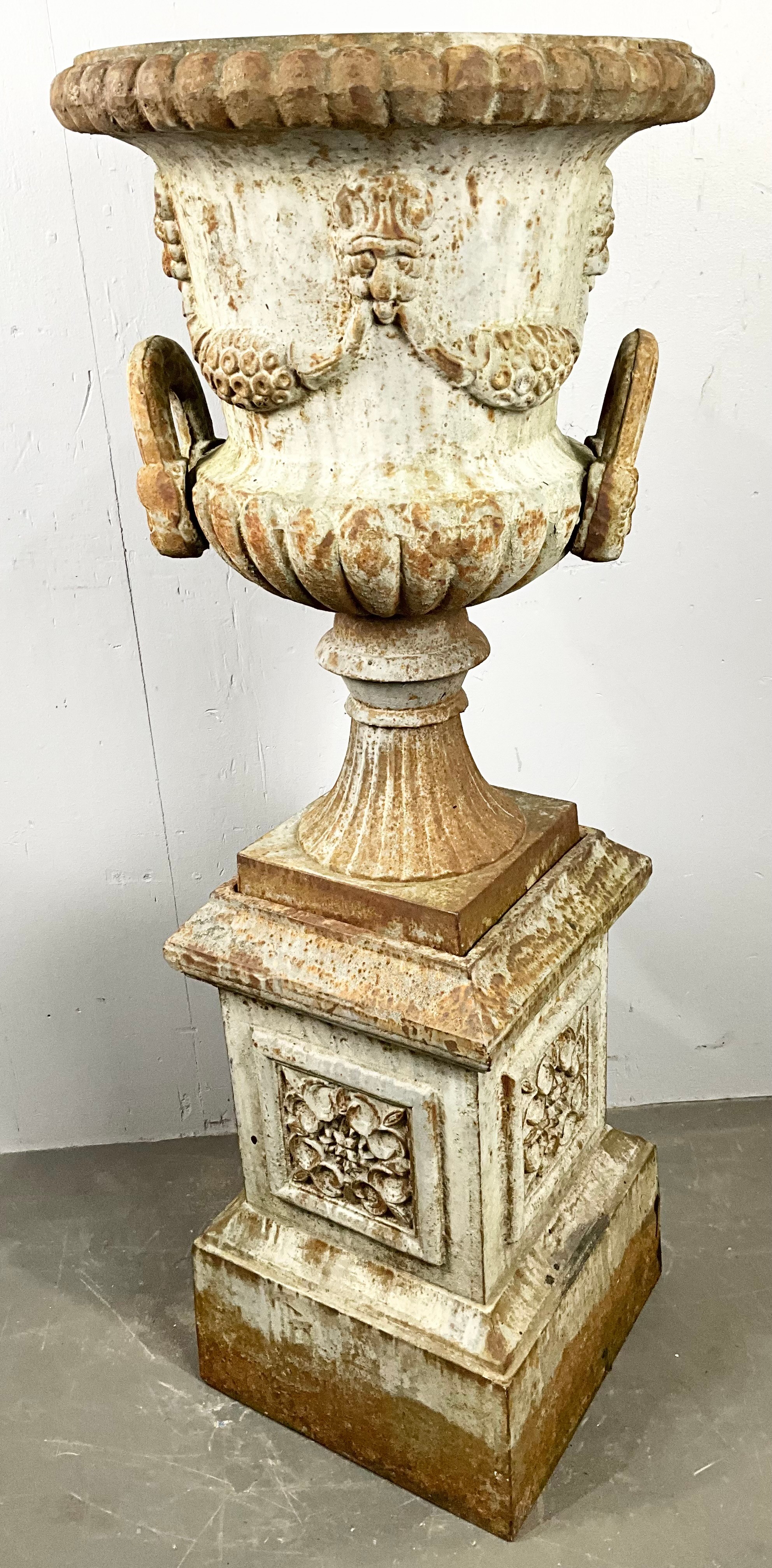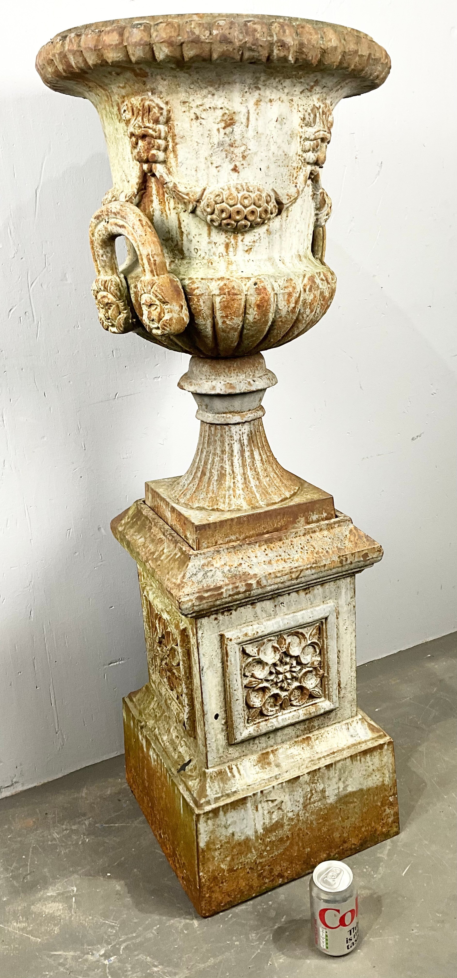 IMPRESSIVE CAST IRON COALBROOKE DALE STYLE CAMPANA URN WITH TWO HANDLES AND SWAG DECORATION ON MATCHING SQUARE SECTION PLINTH 116cm TALL GARDEN FEATURE