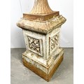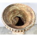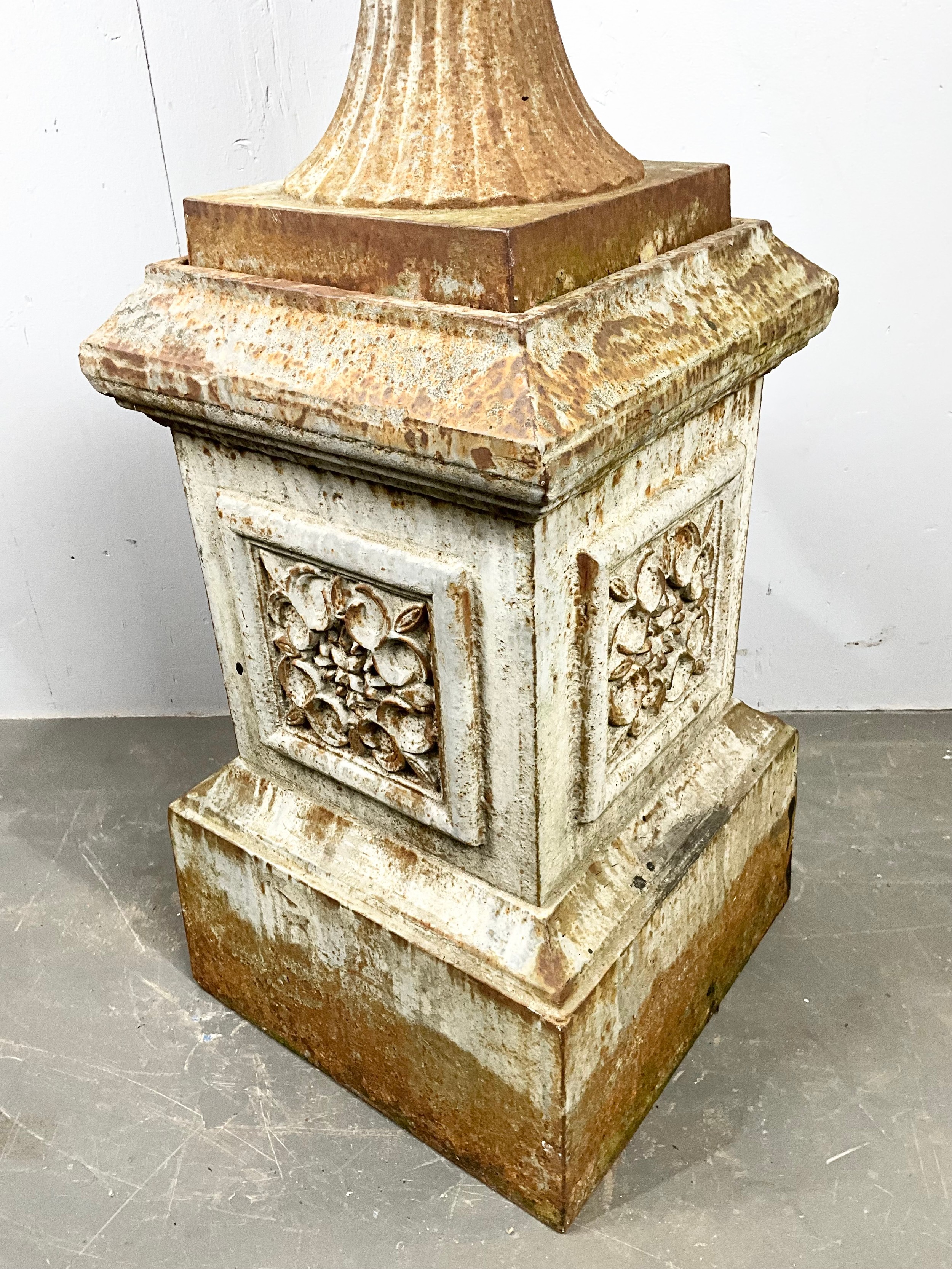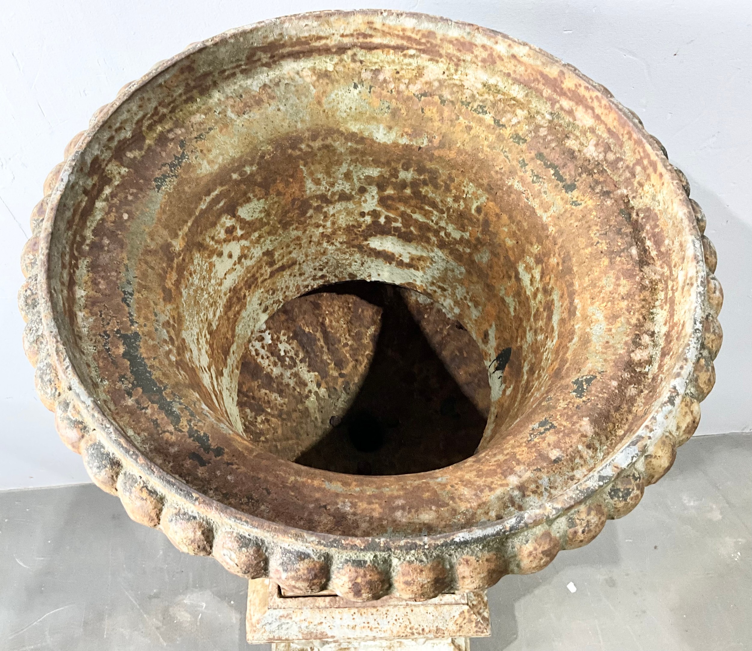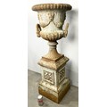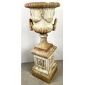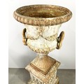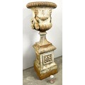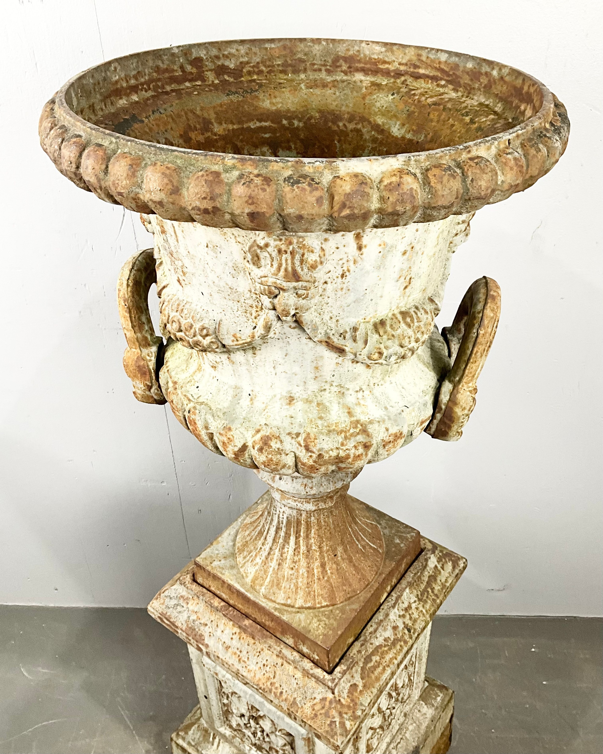 IMPRESSIVE CAST IRON COALBROOKE DALE STYLE CAMPANA URN WITH TWO HANDLES AND SWAG DECORATION ON MATCHING SQUARE SECTION PLINTH 116cm TALL GARDEN FEATURE