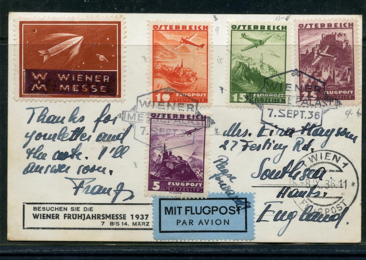 AUSTRIA 1936 postcard to Great Britain from the Vienna Fair, nicely stamped. Good condition.