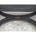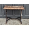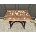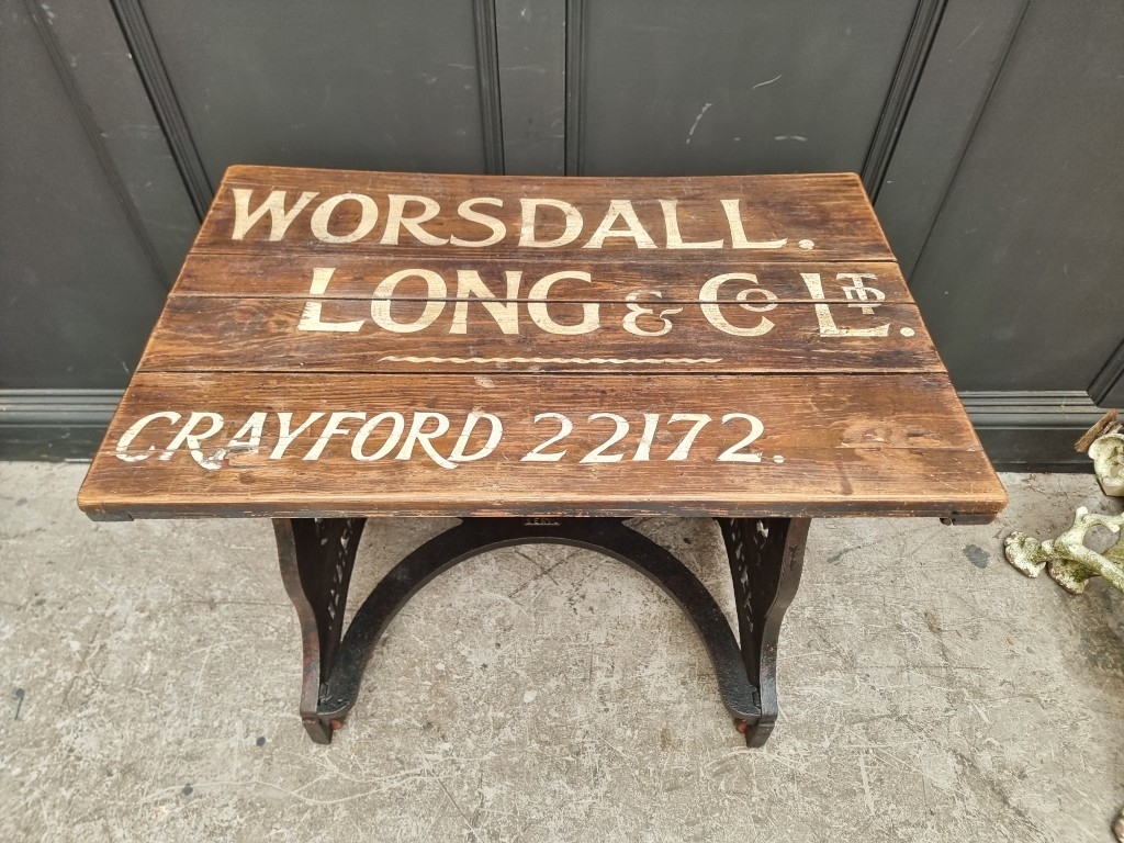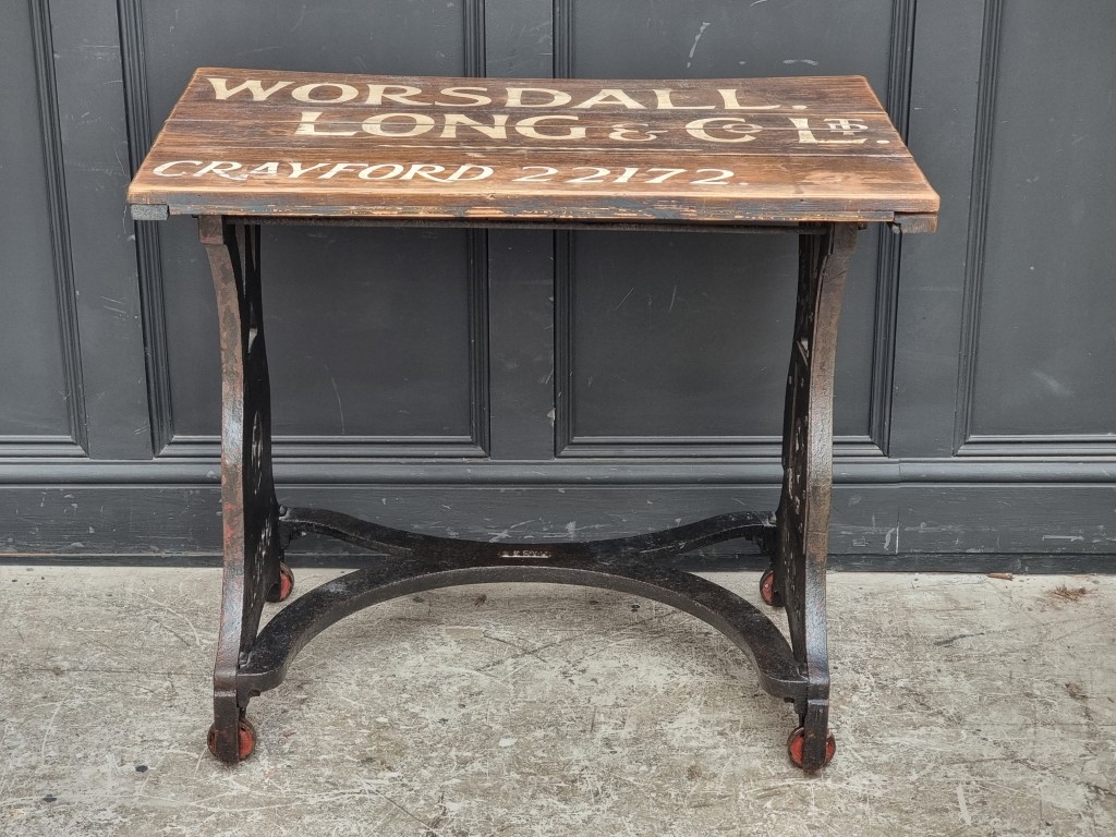 An interesting antique cast iron machinist's table, inscribed 'Servu' and with fouled anchor decoration, the pine plank top inscribed 'Worsdall, Long & Co Ltd...', 91cm wide.