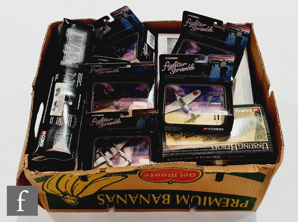 A collection of Corgi military related diecast models, to include three A Century of War (CS90025, CS90023, CS90024), two Unsung Heroes (US51101, US50303), Forgotten Heroes US51003, and six Fighter Scramble models, all boxed. (12)
