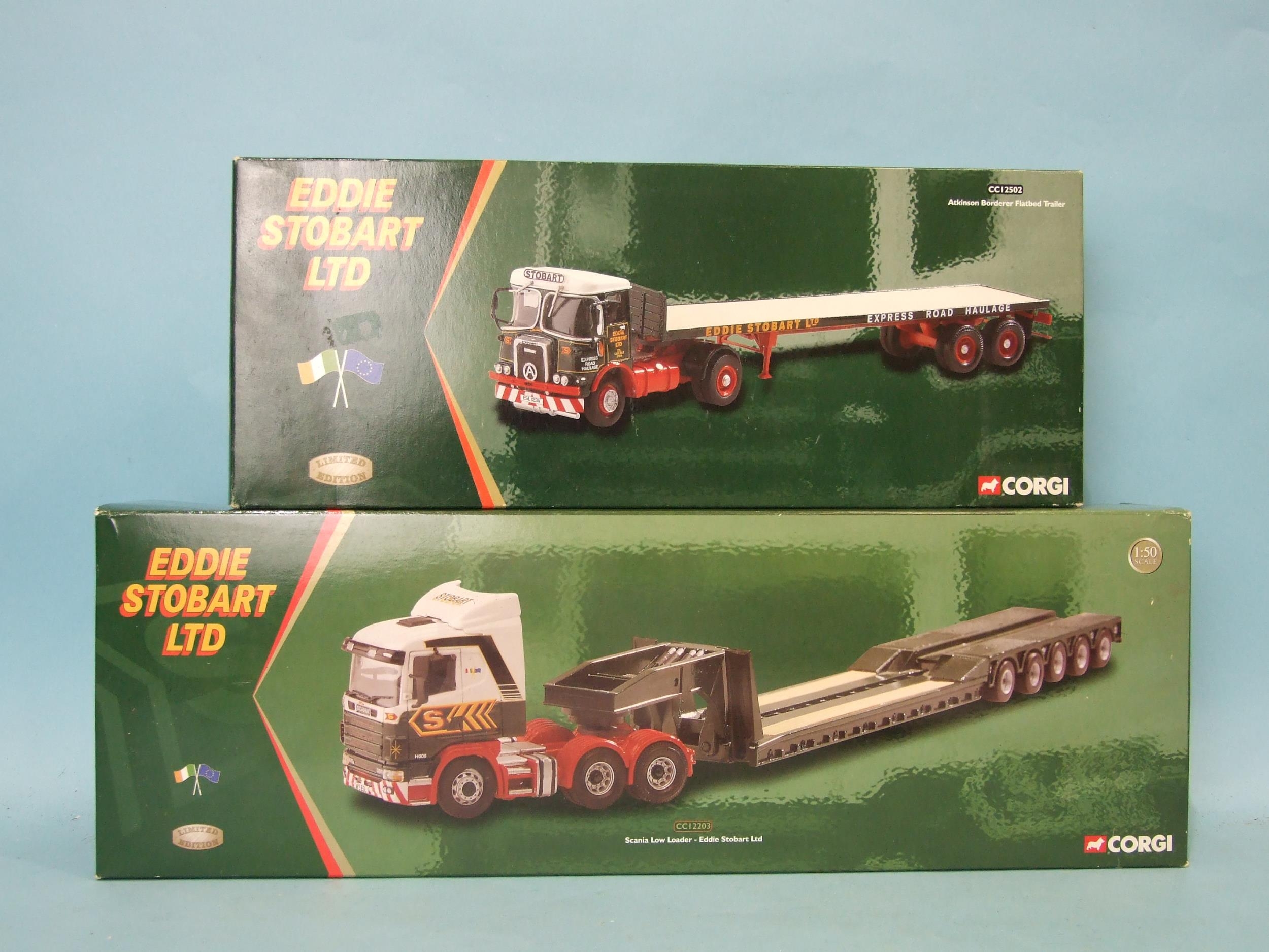 Corgi, "Eddie Stobart Ltd" limited editions: CC12203 Scania Low Loader and CC12502 Atkinson Borderer Flatbed Trailer, both boxed, (2).