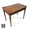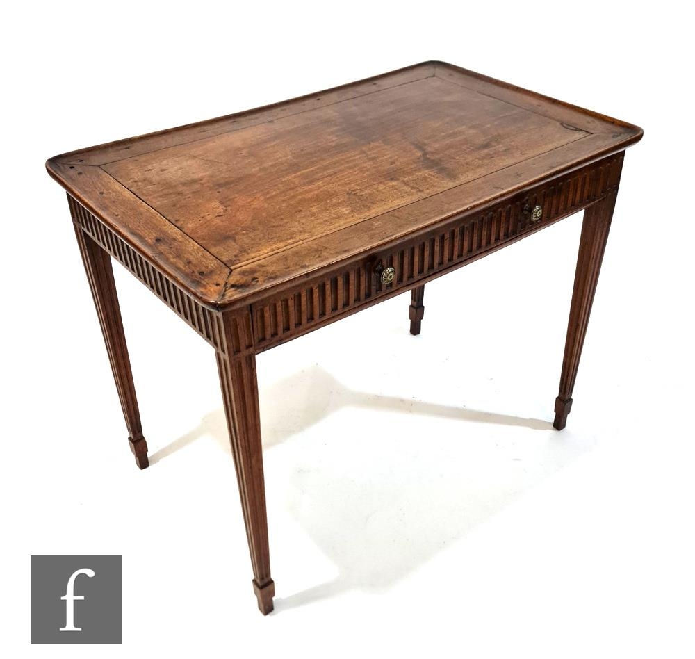 A late 18th Century mahogany silver table, the rectangular top with dished rim over a lunette carved frieze fitted with a single drawer, raised to conforming tapered legs with peg feet, some damage.