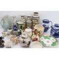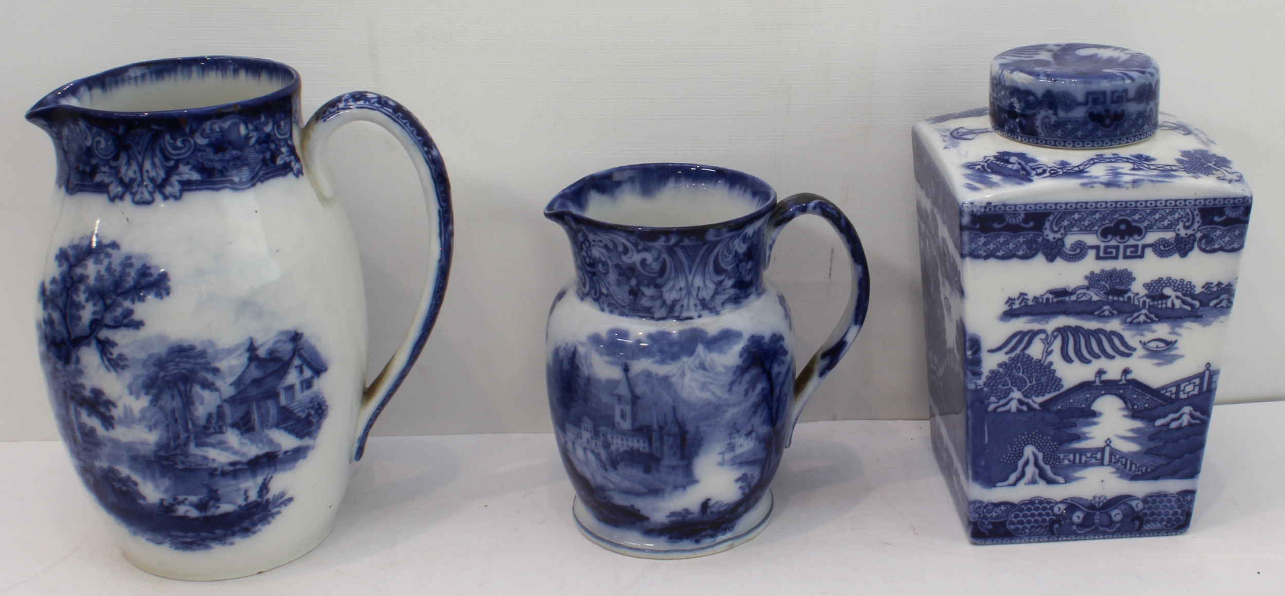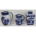two blue-and-white jugs and a Willow pattern tea caddy;