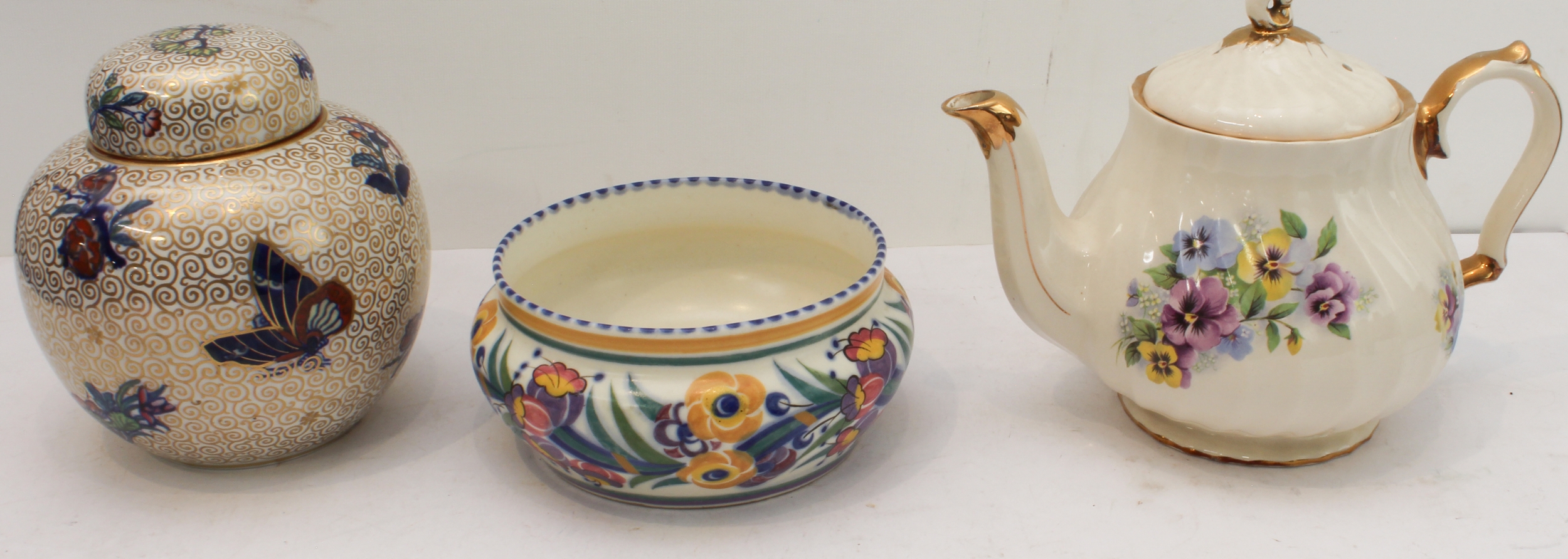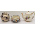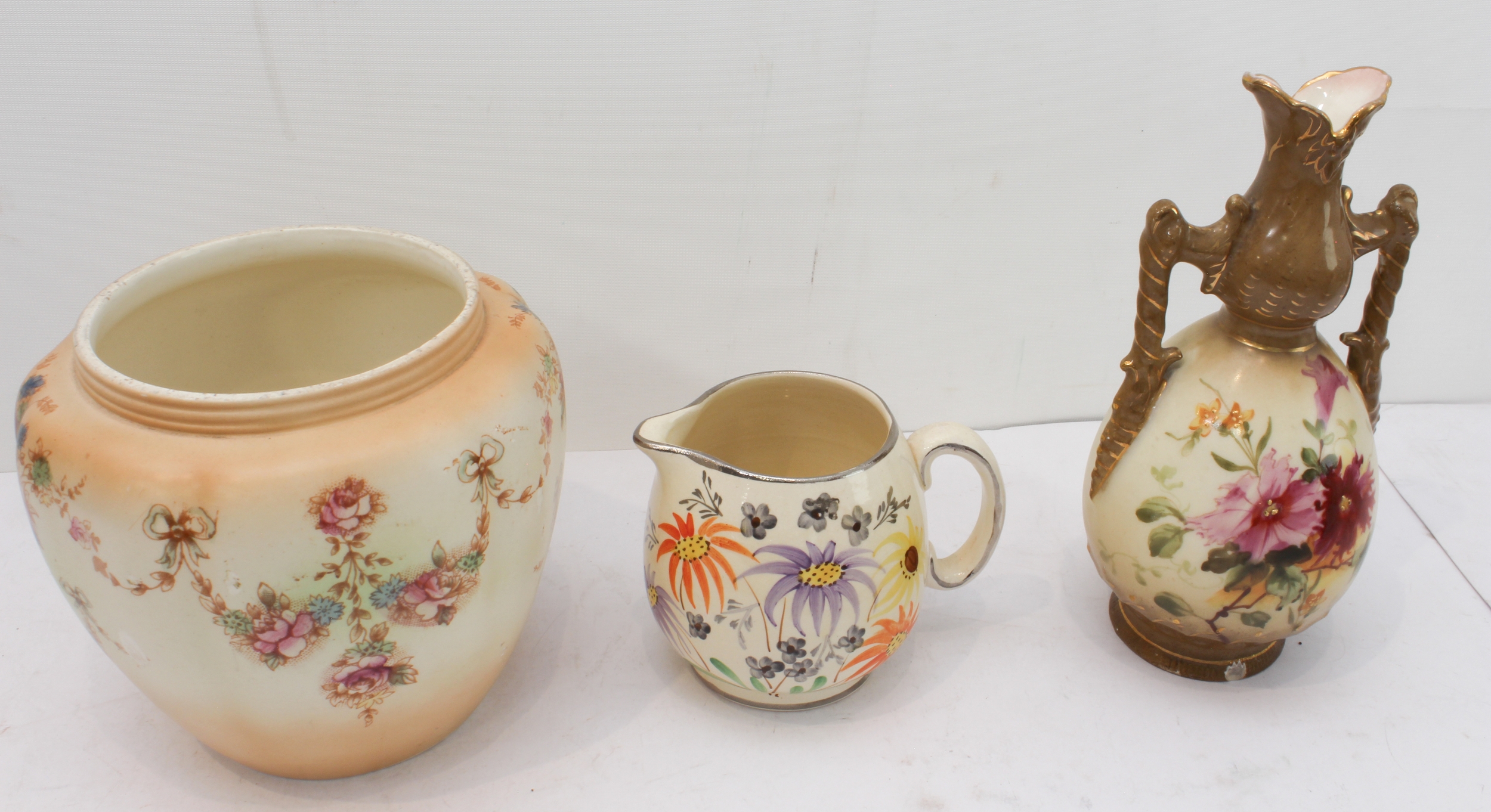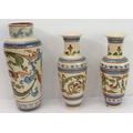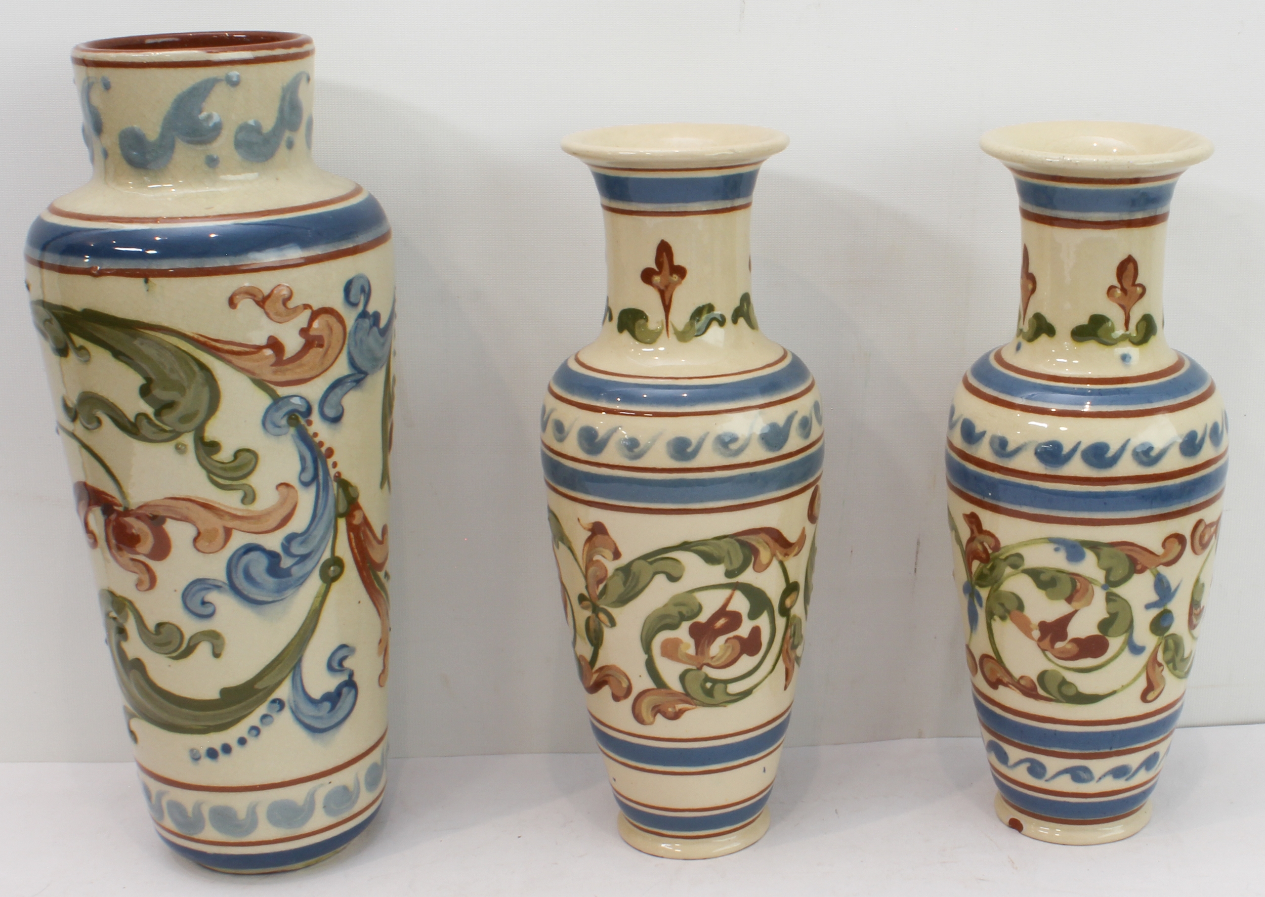 a pair of Devonware-style vases (25 cm high) and one other vase (30 cm high).