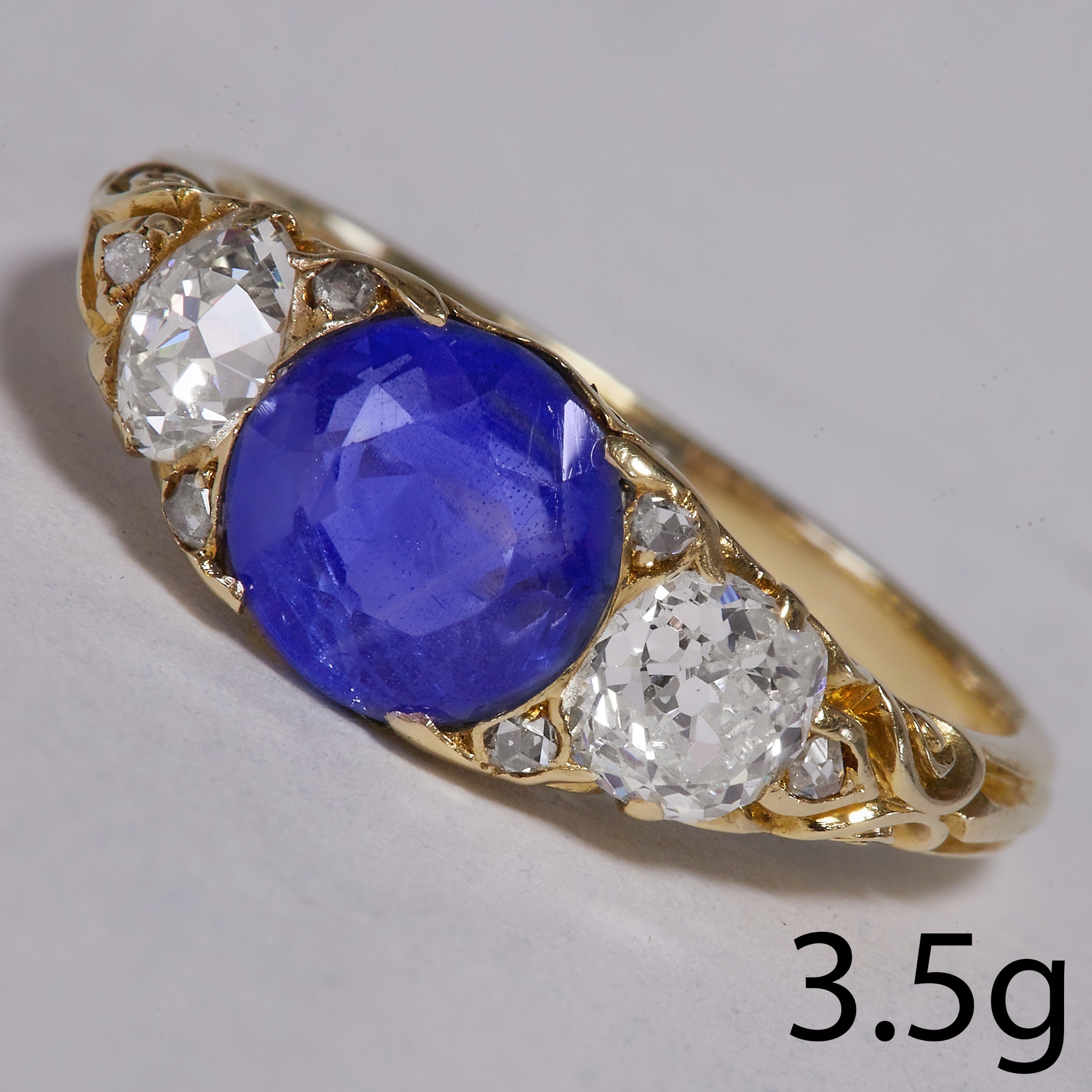 VICTORIAN SAPPHIRE AND DIAMOND THREE STONE RING.