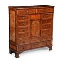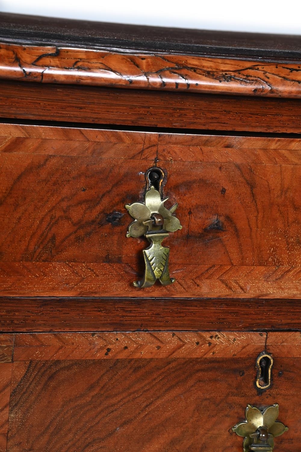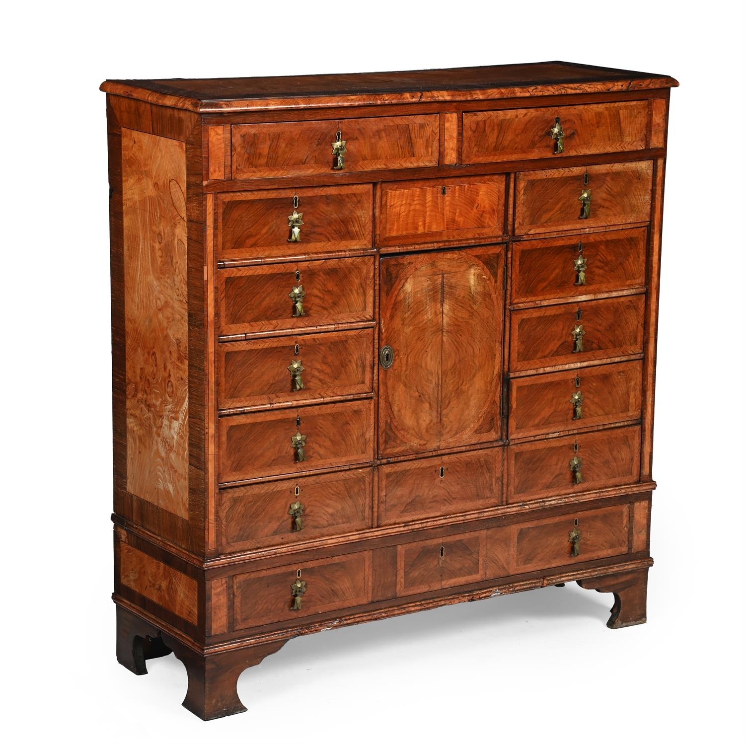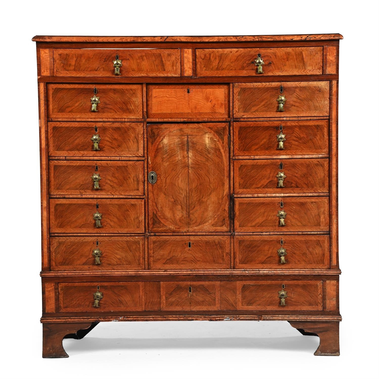 PLEASE NOTE: ALL LOTS ARE LOCATED AT SACKVILLE WEST STORAGE IN ANDOVER (SP10 3SA) AND ARE NOT AVAILABLE TO VIEW With wear, marks, knocks and scratches commensurate with age and useLosses to veneer, as well as some warping and lifting, please see imagesSome chips, splits and cracksHistoric signs of old wormSome signs of repair, notably to the drawer basesThe bottom drawer section and feet are not fixed to the rest of the cabinetThough the figuring and timber is of a high quality, there are likely many later elements, including the hardwareThe panel to the reverse has come apart from the main body of the cabinet and would need refixing prior to use in a domestic settingOverall solid and stable, and of useful proportionsADDITIONAL IMAGES: Please 'Ask a Question' to request additional images for this lot.