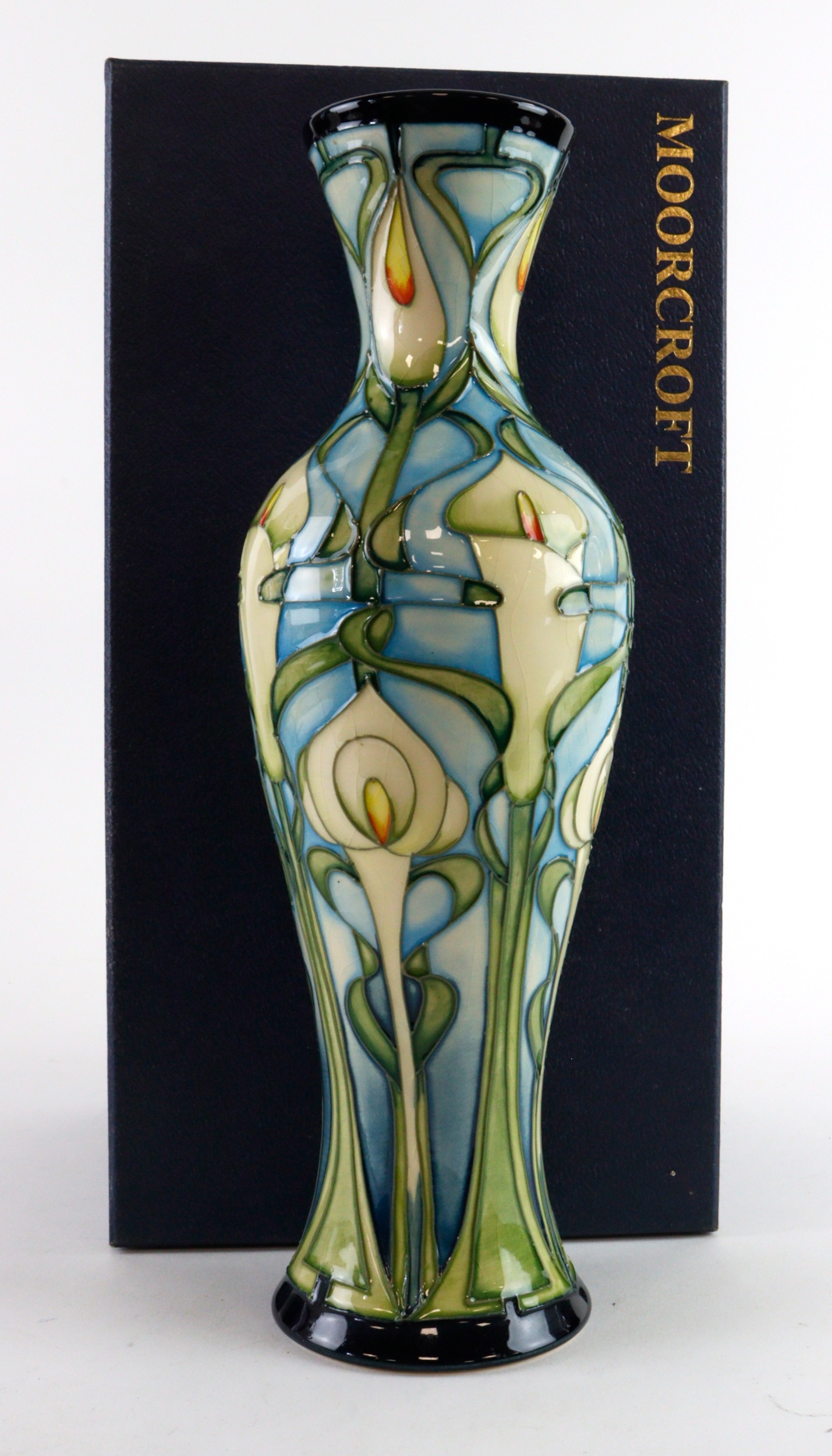 Moorcroft 'Calla Lily' pattern vase, dated 2001, makers marks to base, crazing to glaze, height 31cm approx., contained in a Moorcroft box
