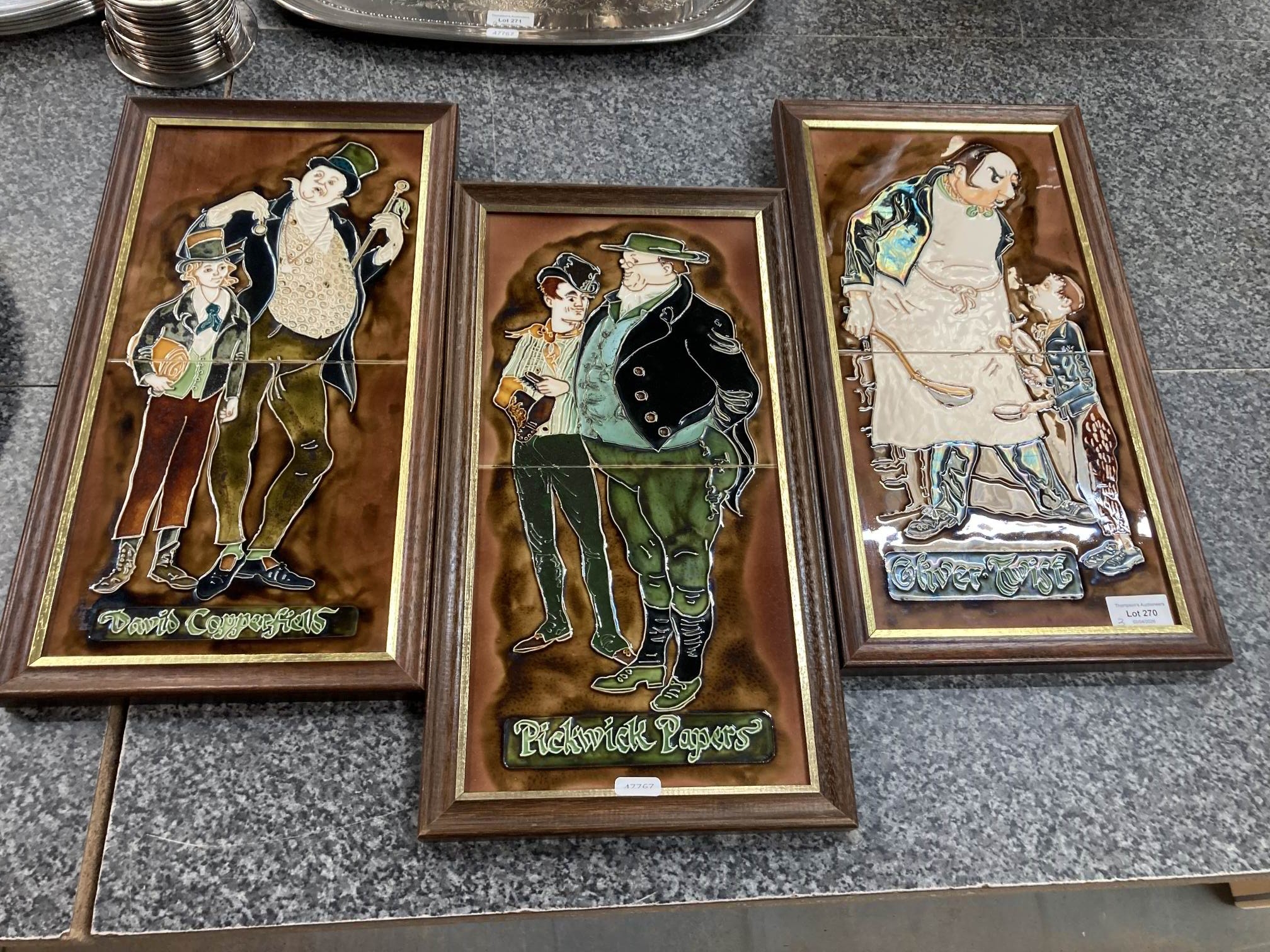 3 framed tiled plaques - David Copperfield, Pickwick Papers & Oliver Twist 44x24