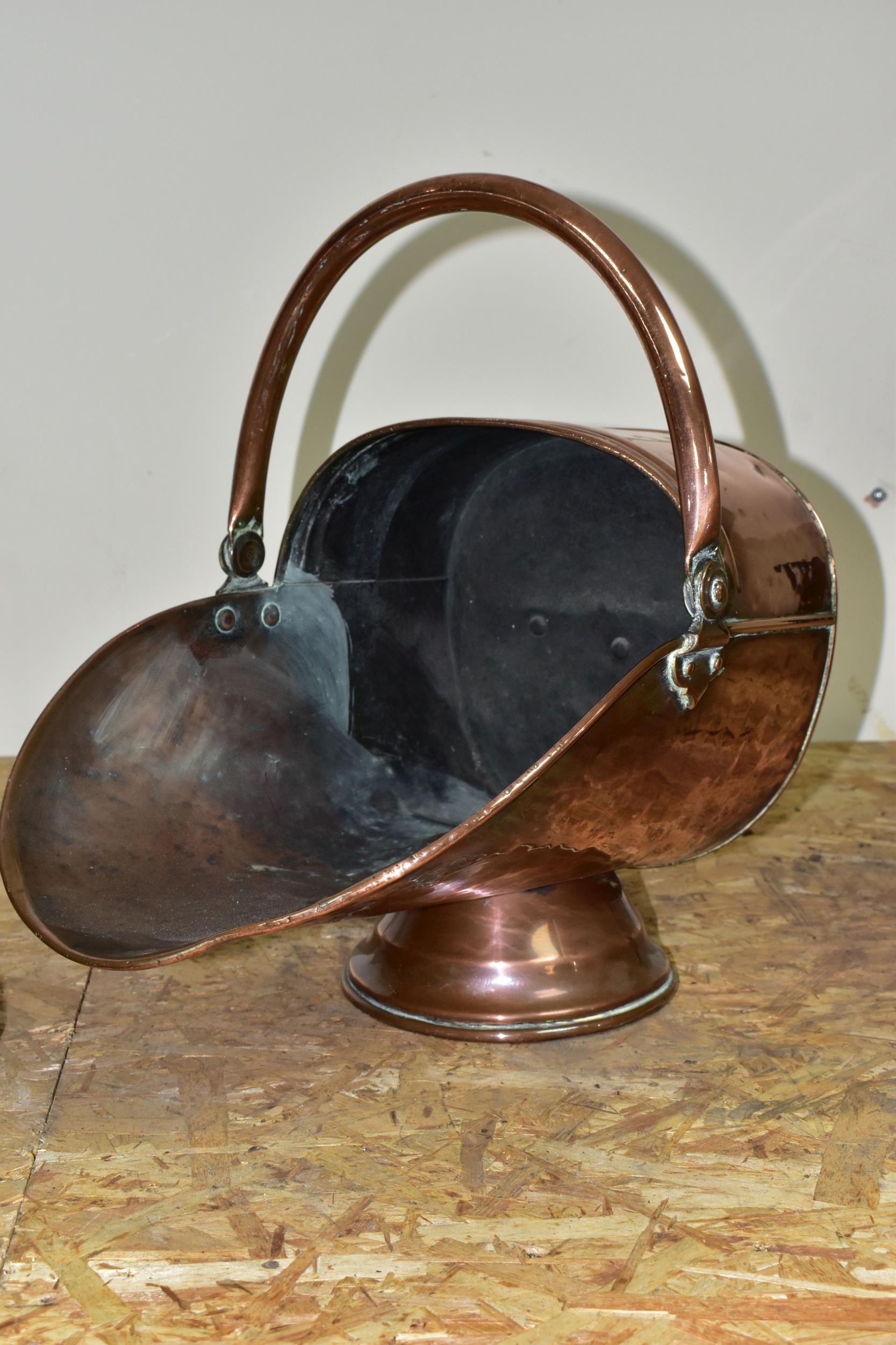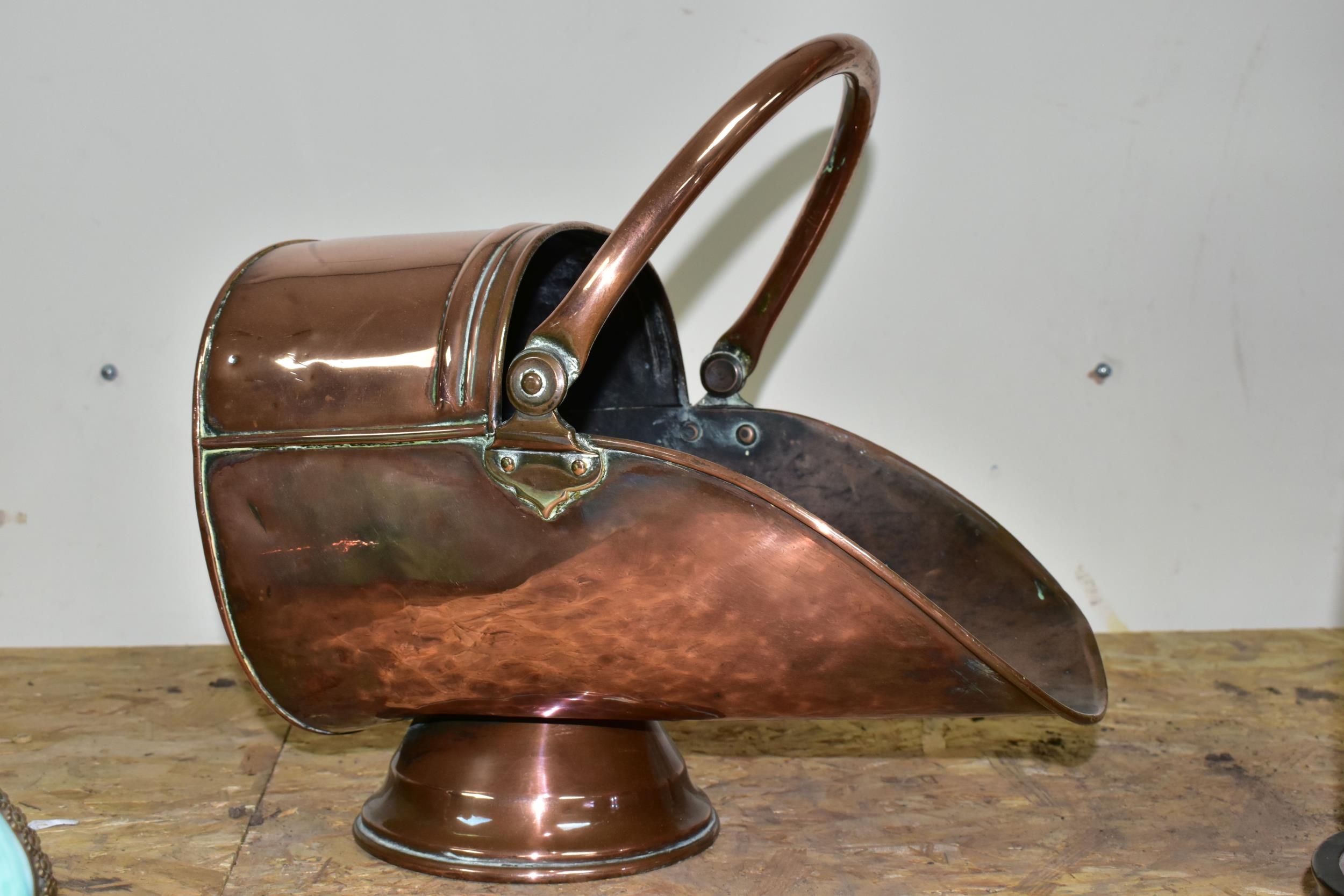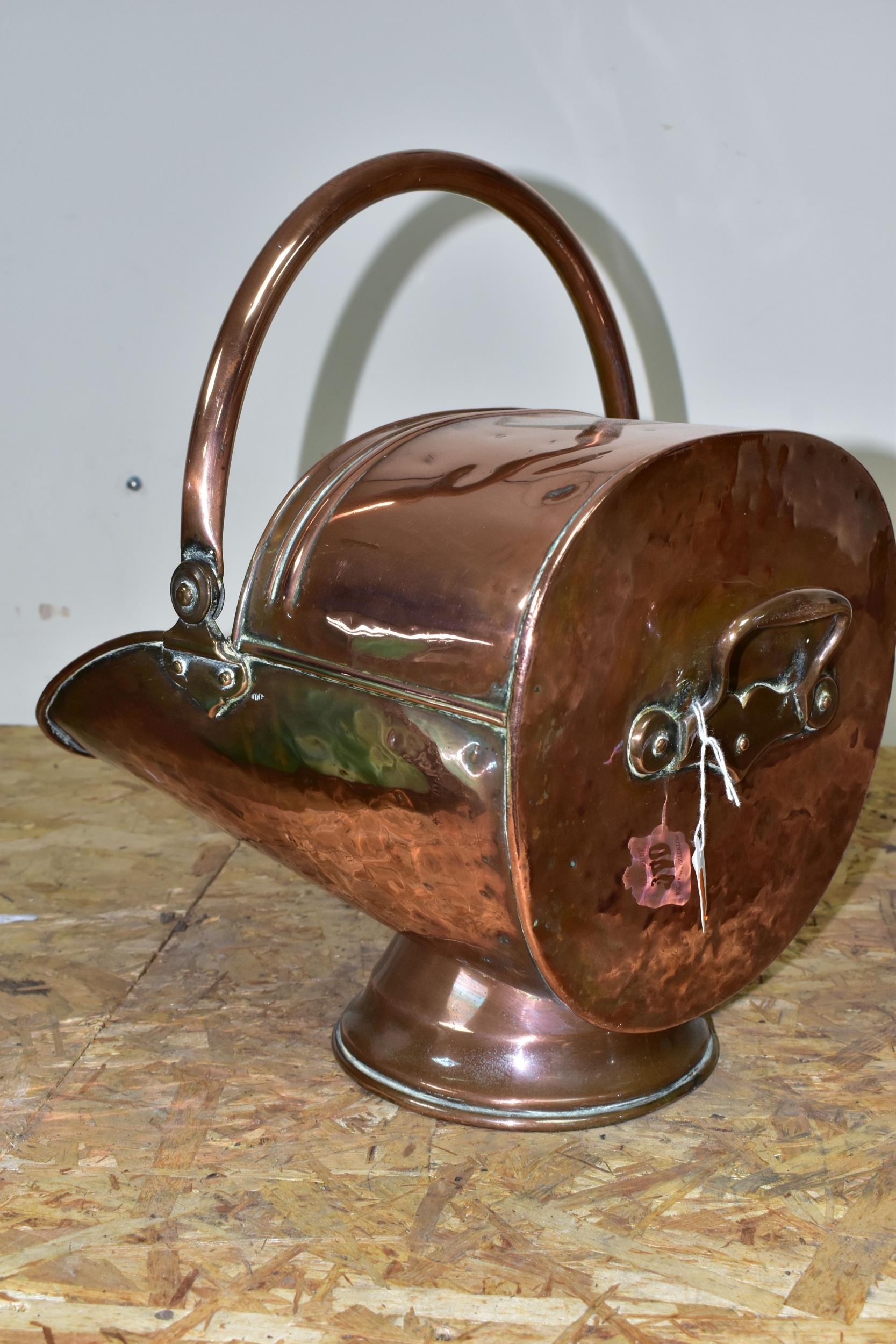 A VICTORIAN COPPER COAL SCUTTLE, copper handles, height 29cm x length 37cm (1) (Condition Report: a few dents and scuffs due to age)