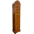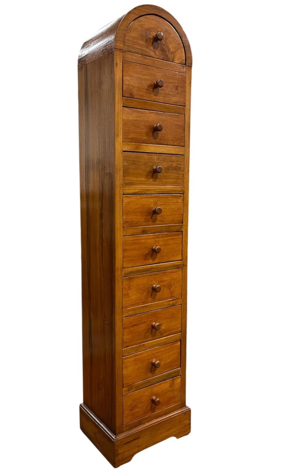 A HARDWOOD TEN DRAWER TALLBOY of rectangular arched form on platform support 140cm (h) x 29cm (w) x 23cm (d)