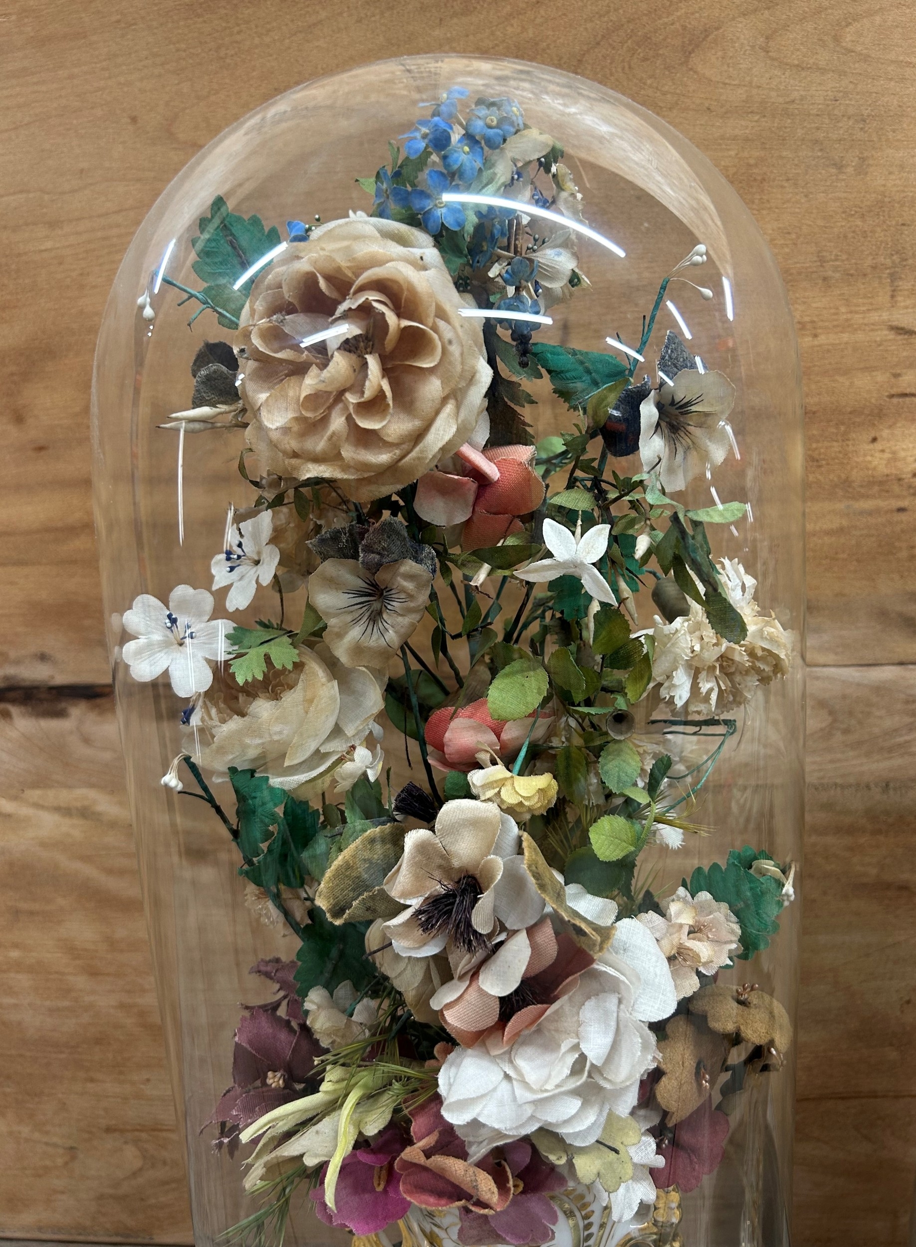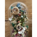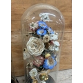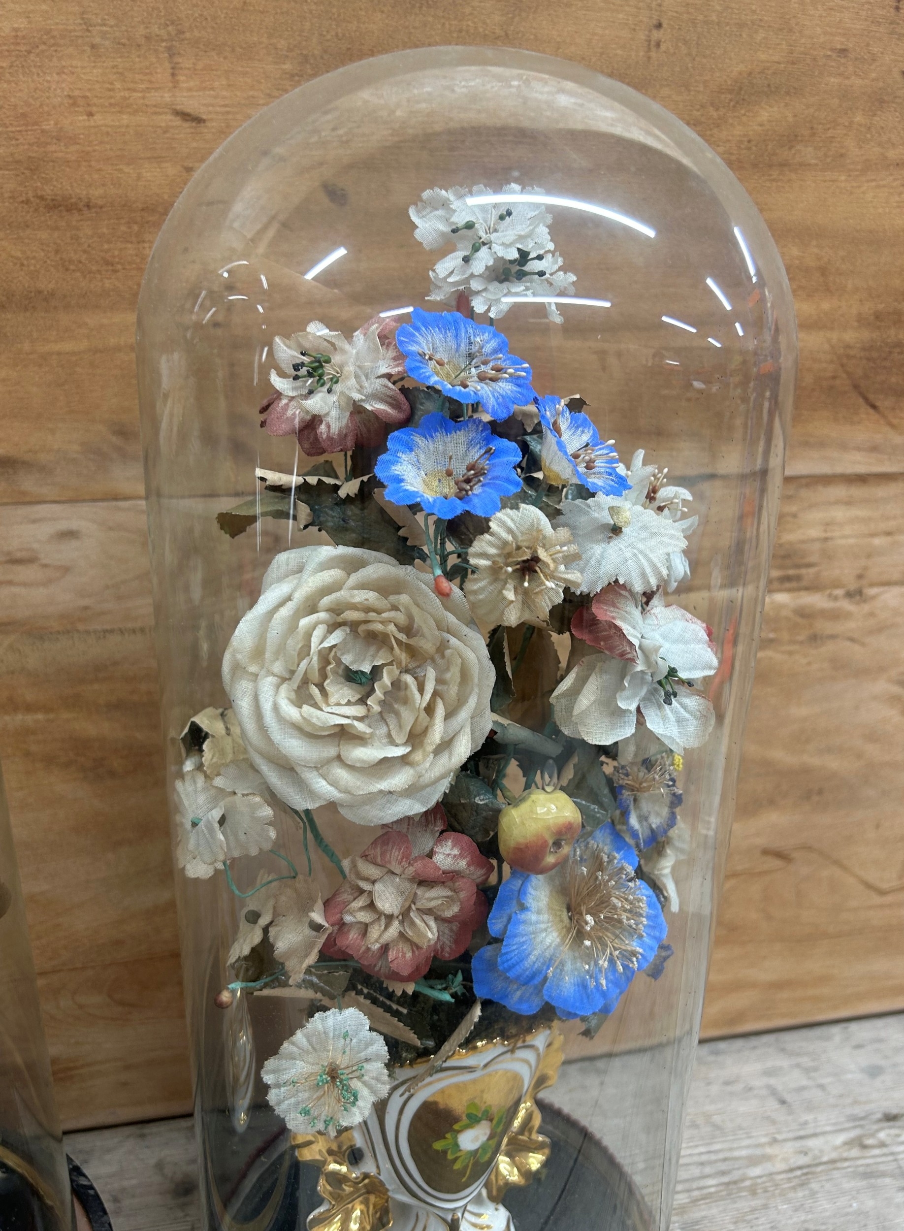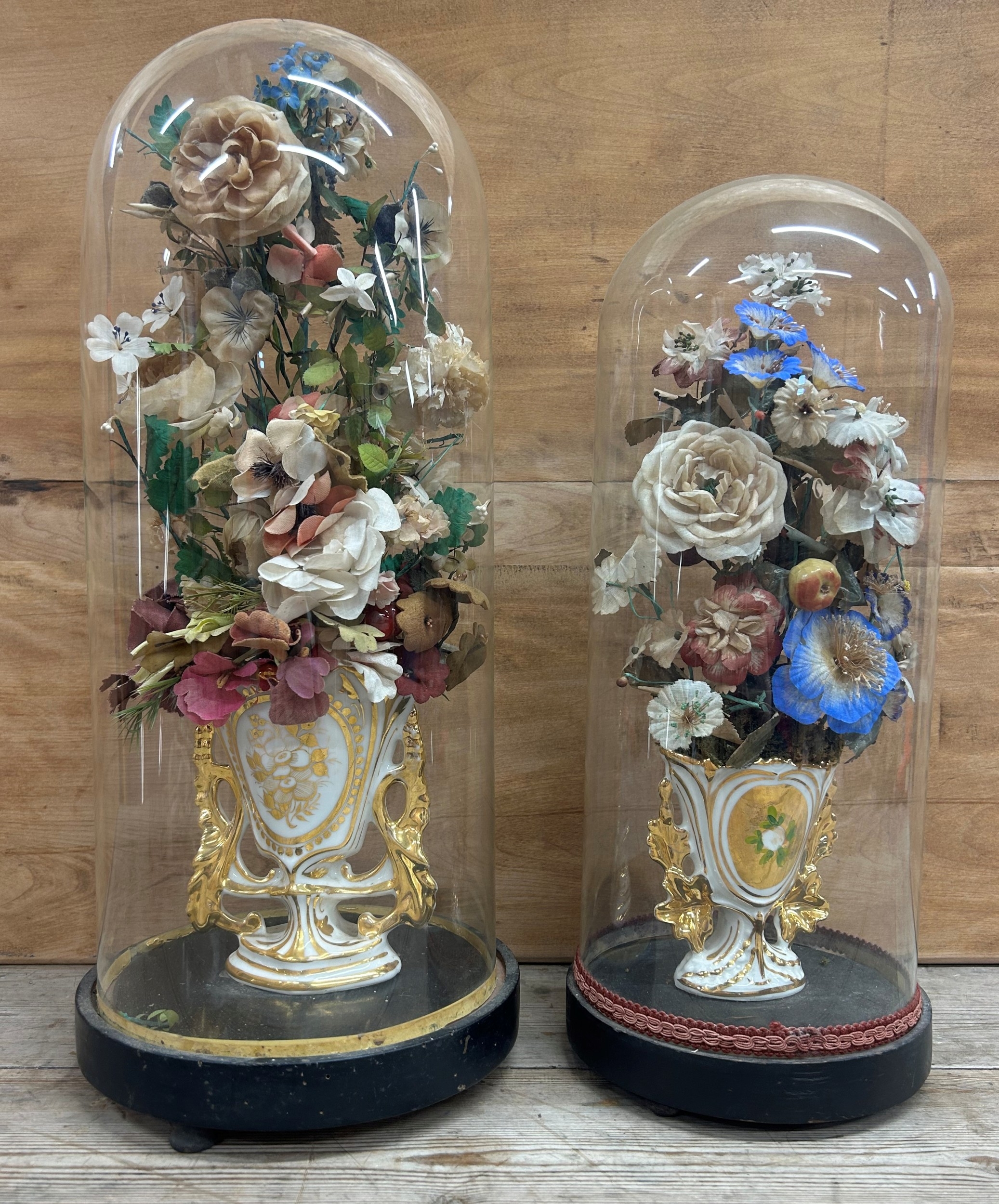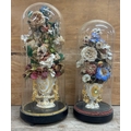 Pair of antique French Globe De Maire floral displays held in glass dome, largest H 53cm