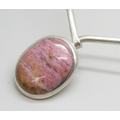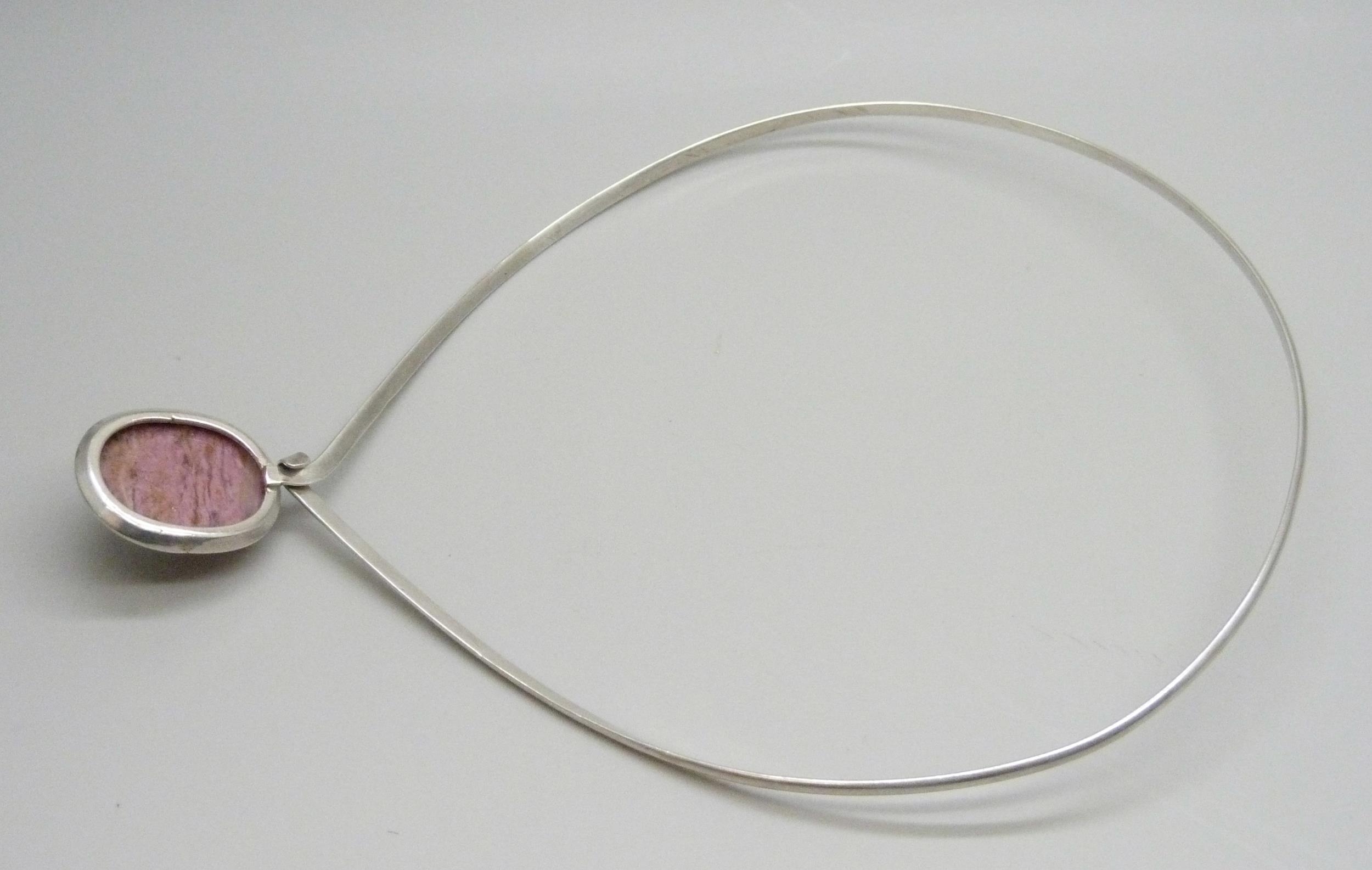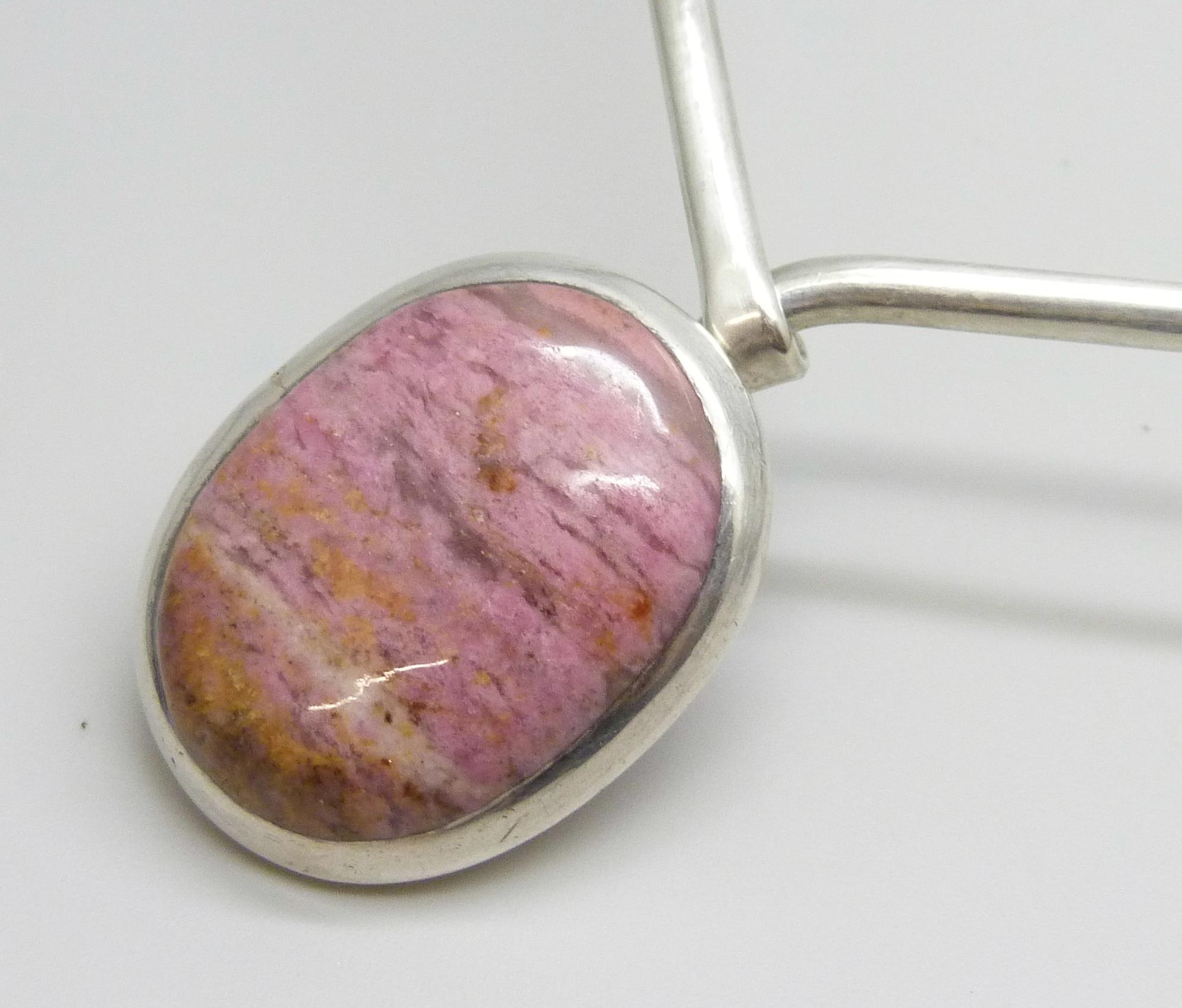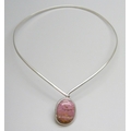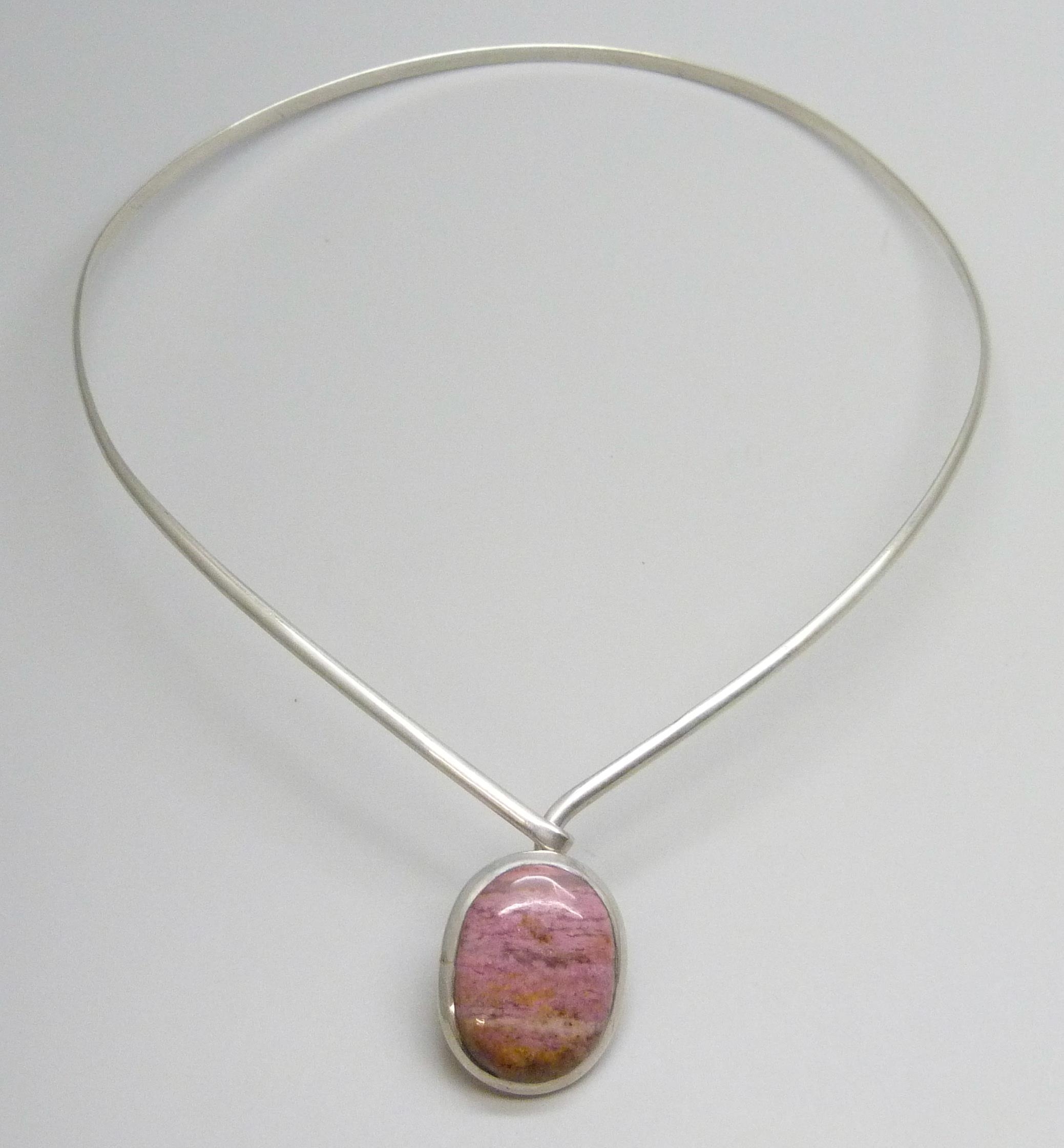 A silver torque necklace set with a cabochon pink gemstone, 32g, 3.1cm pendant