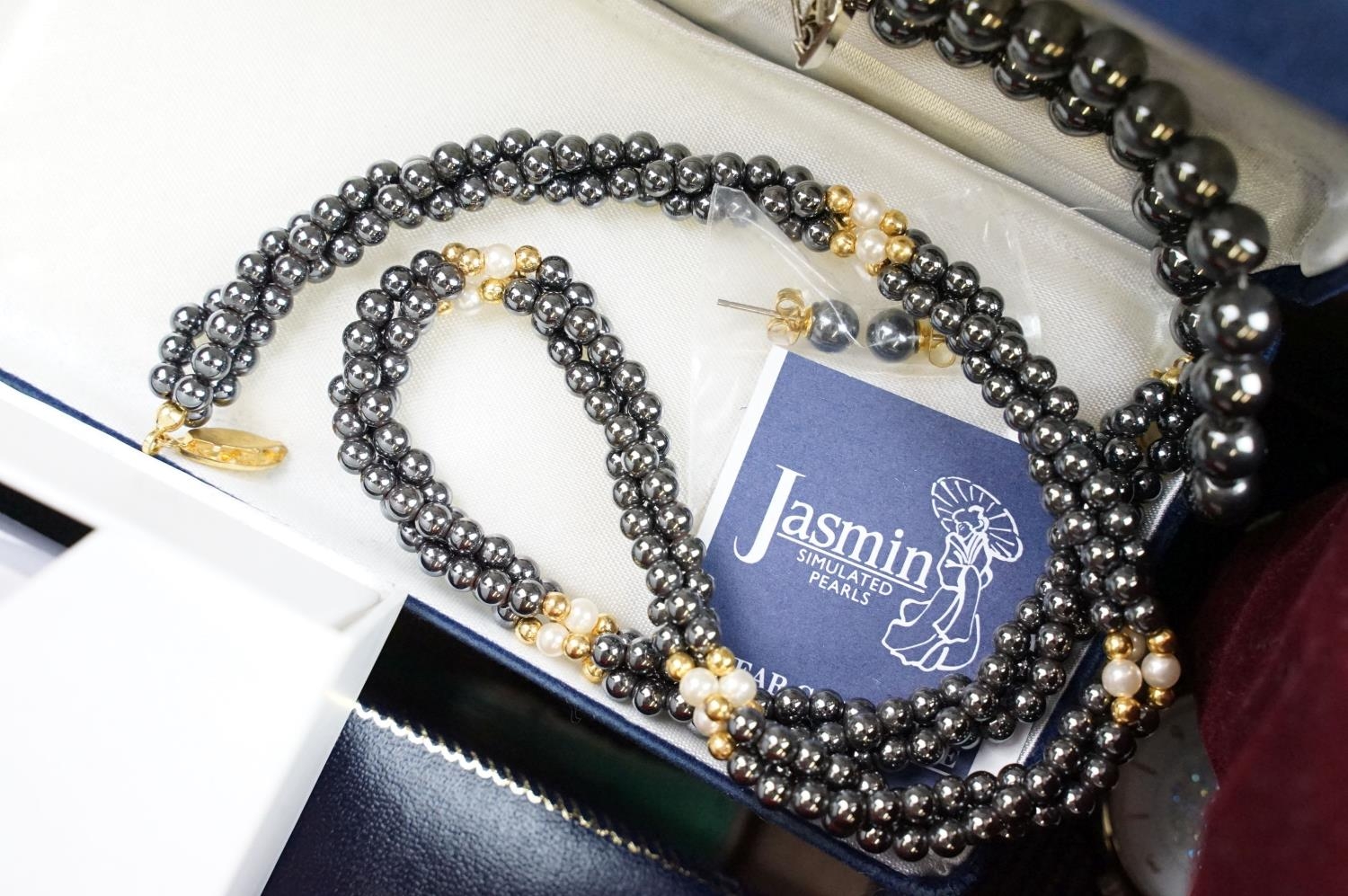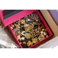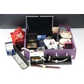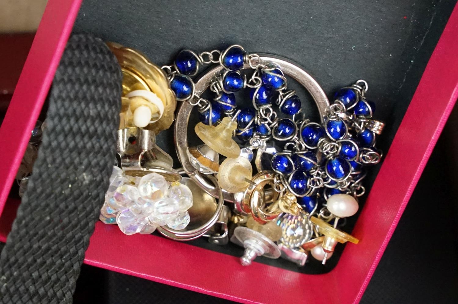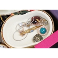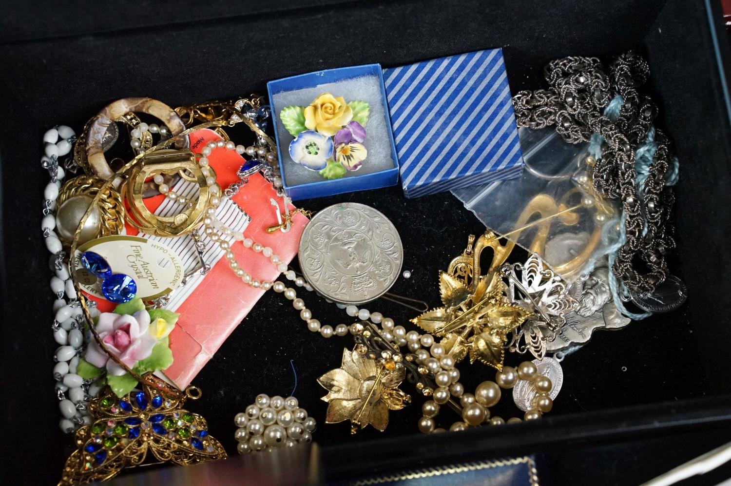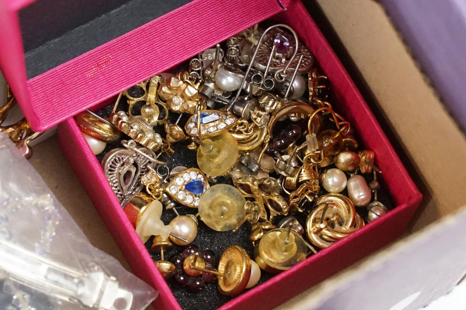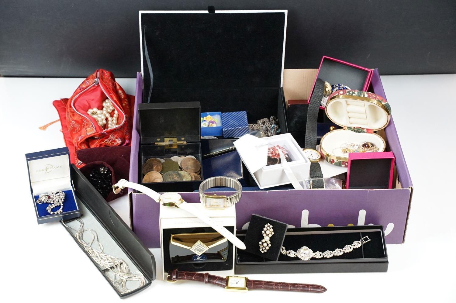 A large collection of mainly contemporary costume jewellery together with some vintage, to include gold and silver examples and together with wristwatches and a selection of coins. (2 boxes)