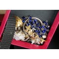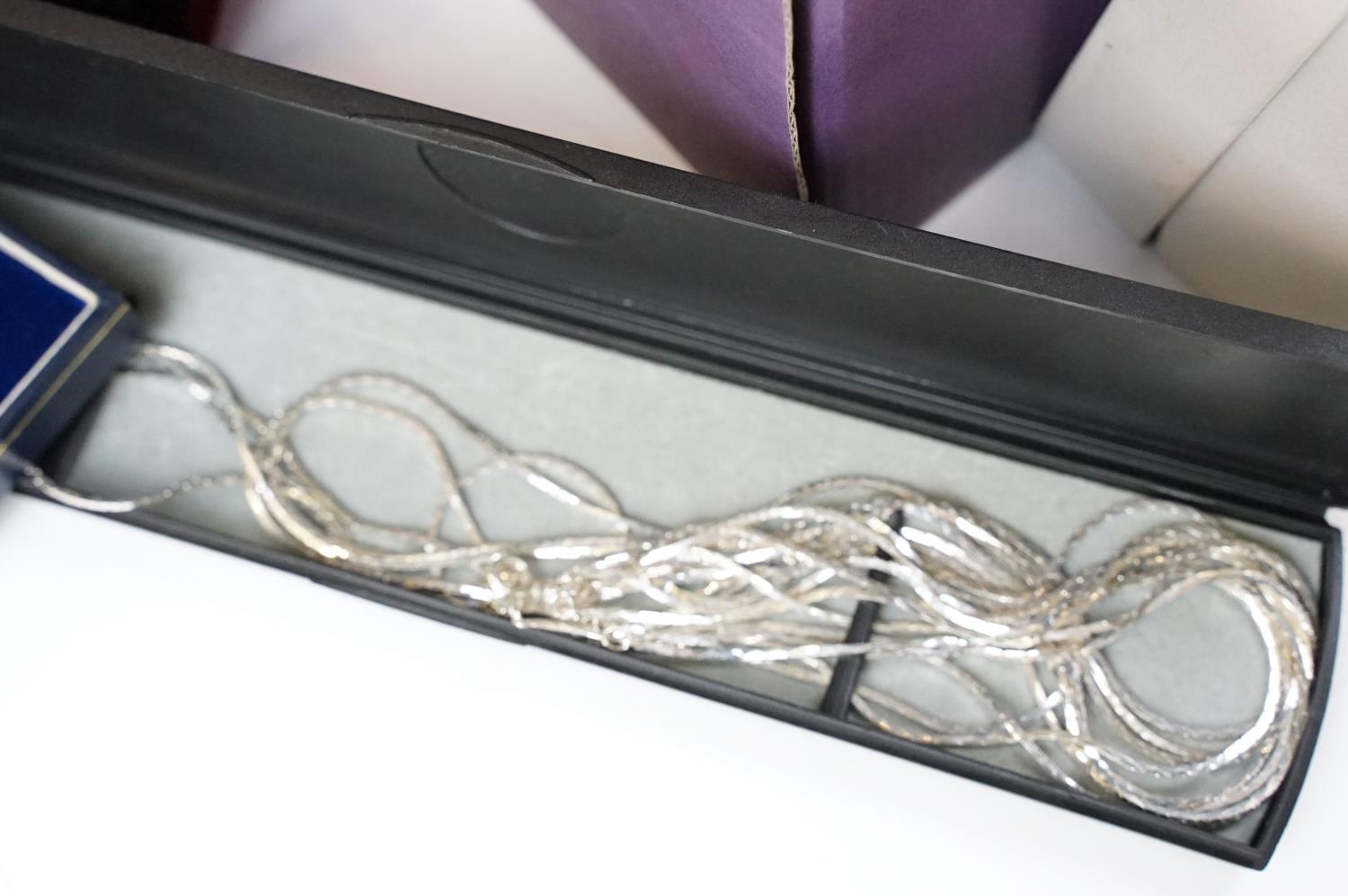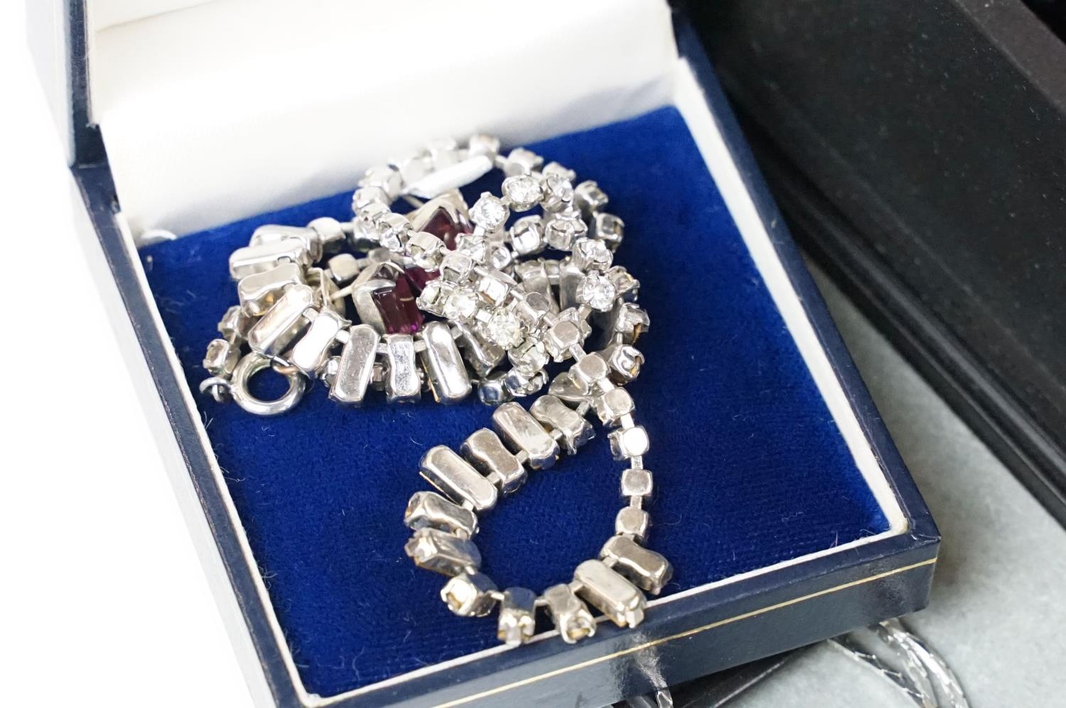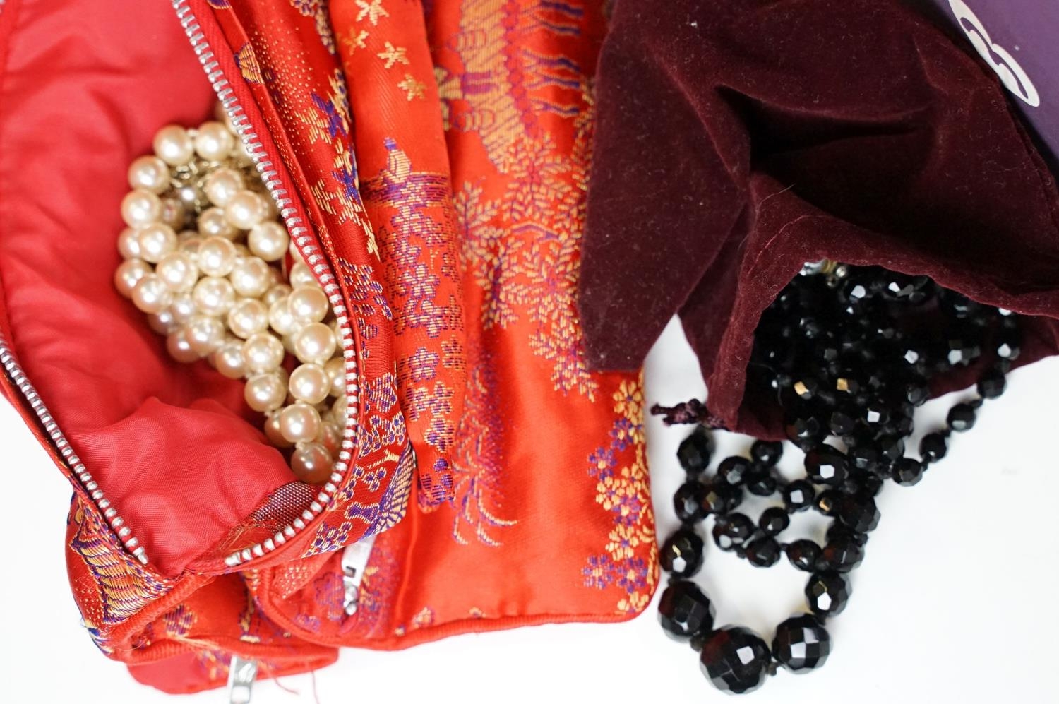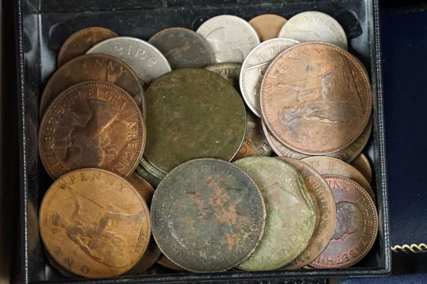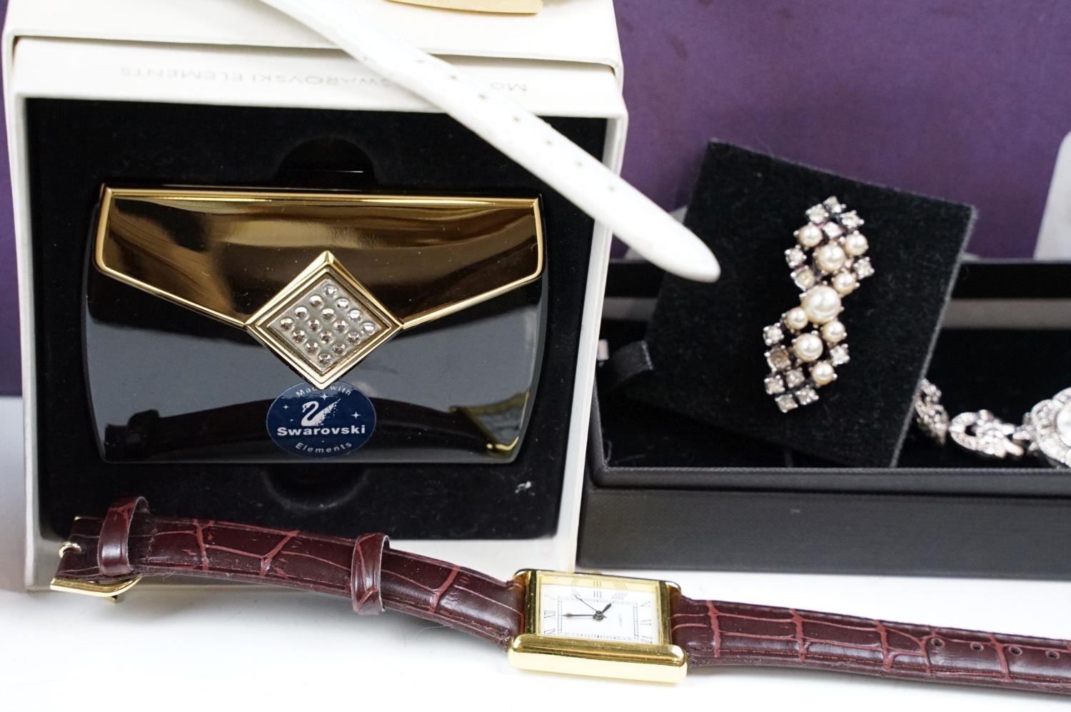 A large collection of mainly contemporary costume jewellery together with some vintage, to include gold and silver examples and together with wristwatches and a selection of coins. (2 boxes)