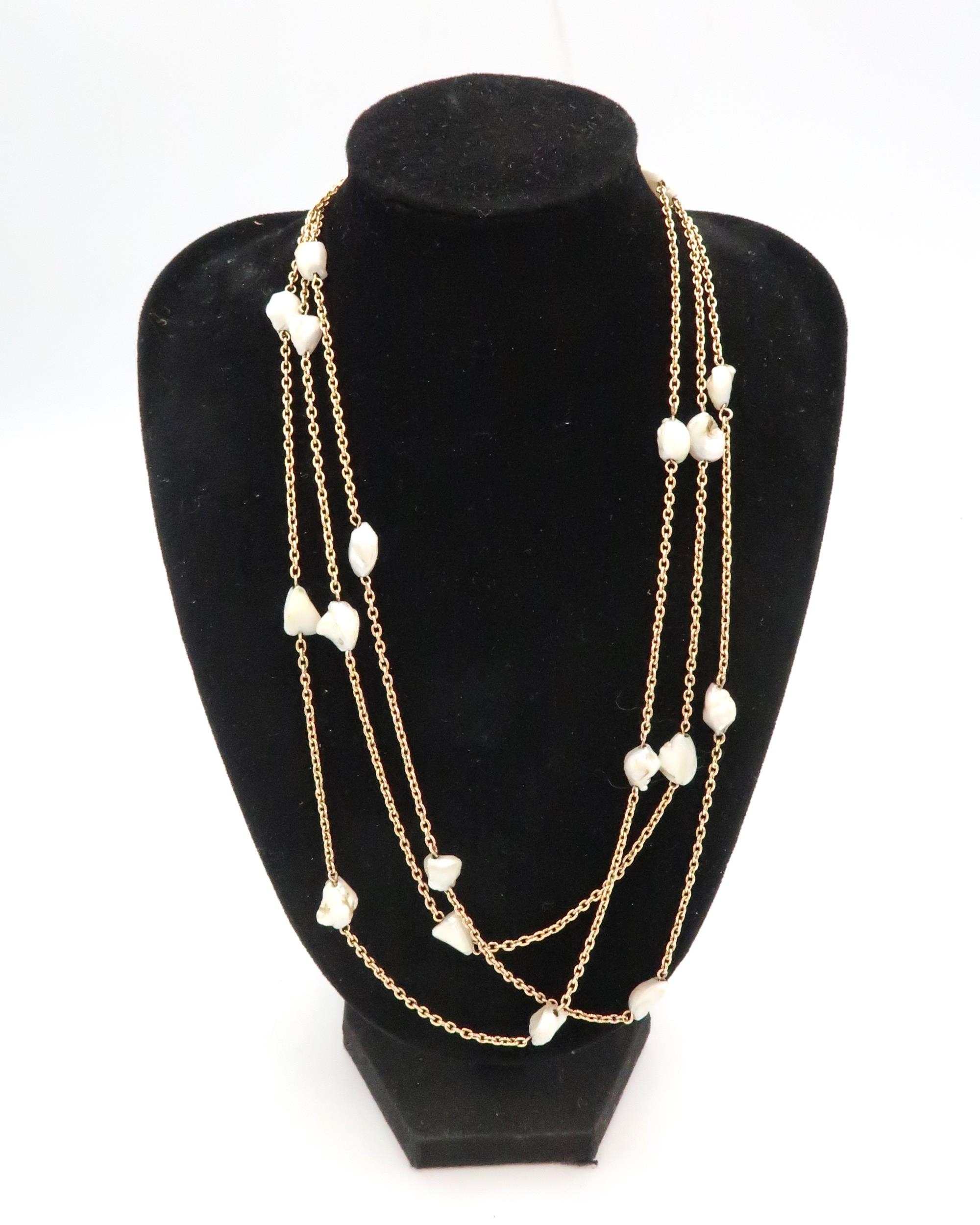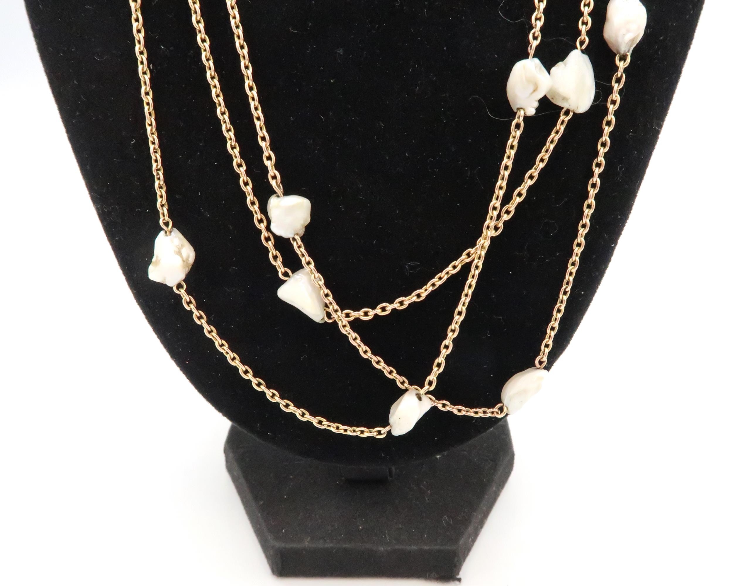 A muff chain with freshwater culture pearl spacer links. Tests gold 9ct. Weight 20.98 grams Length approx 1370mm