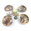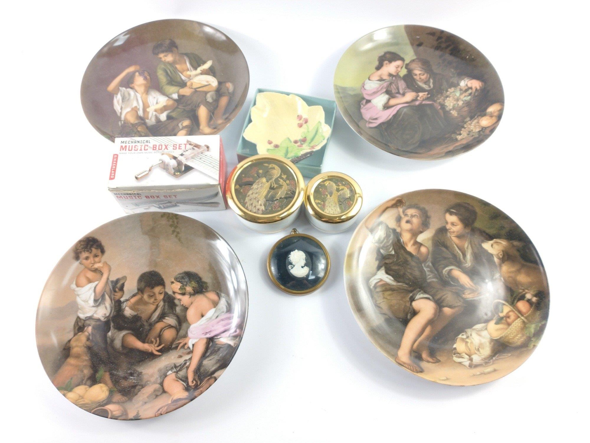 Two ART OF CHOKIN trinket boxes with lids with peacock design 10cm and 7cm diameter, a CARLTONWARE leaf-shaped dish 12cm long, a Lady in Cameo by PETER BATES (7.5cm dia), 4 LIMOGES feuillade wall plates 23cm diameter, and a mechanical music box set