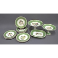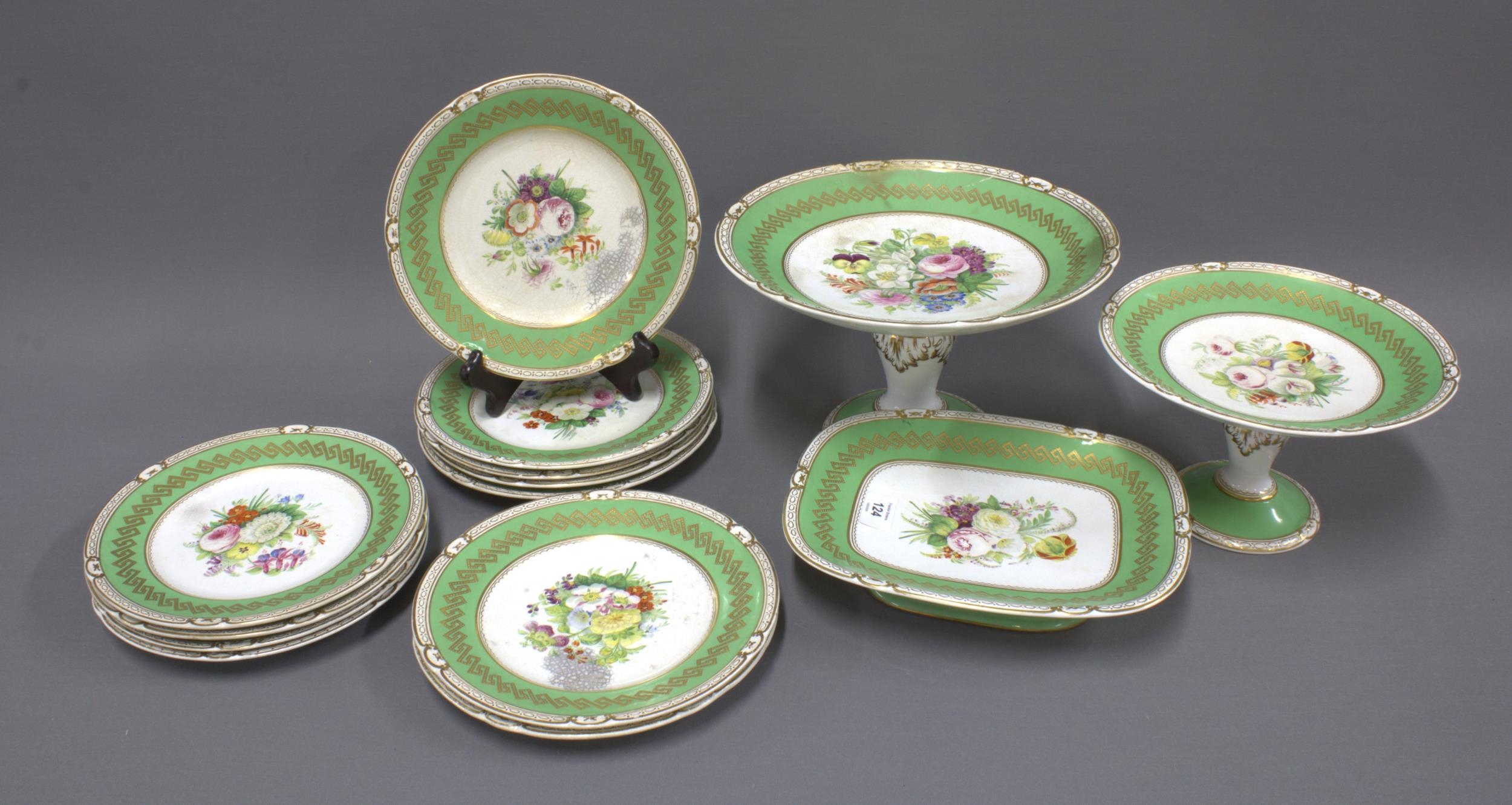 English dessert service with greek key border on a green ground, including plates and three pedestal serving dishes (14)