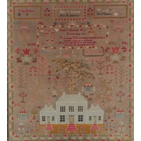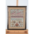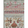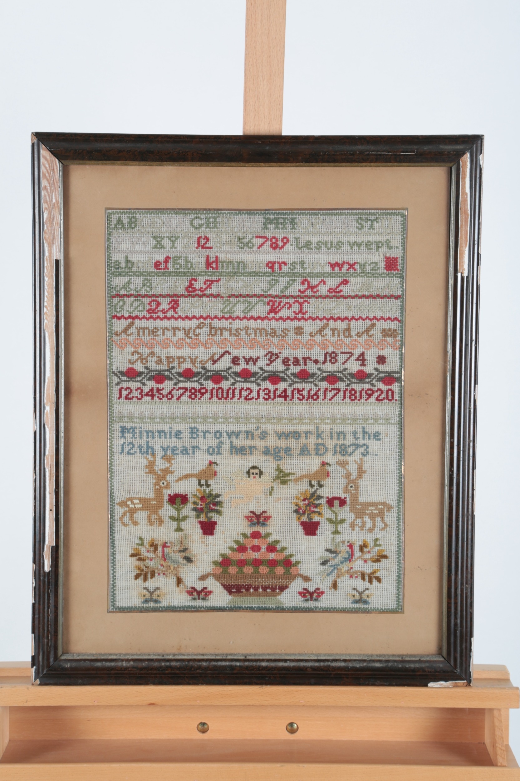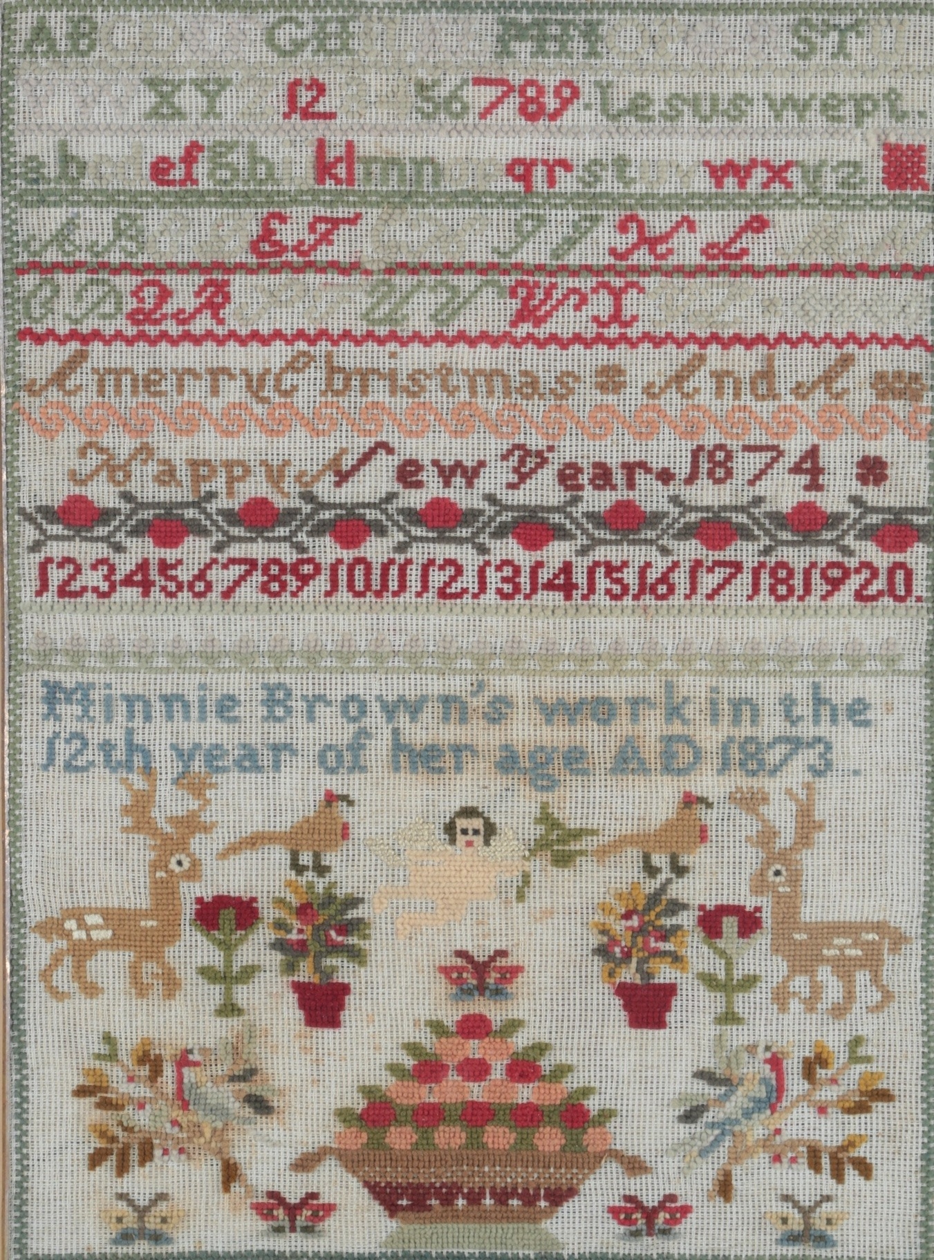 A 19th century wool worked sampler by Minnie Brown, aged twelve years, dated 1873. A colourful polychrome wool sampler, worked on a open weave ground, worked with rows of alphabet and numerals above large spot motifs of deer, birds, trees, a large basket of flowers and a central angel all worked within a cross stitch border, later glazed and framed. 30cm wide x 41cm high.