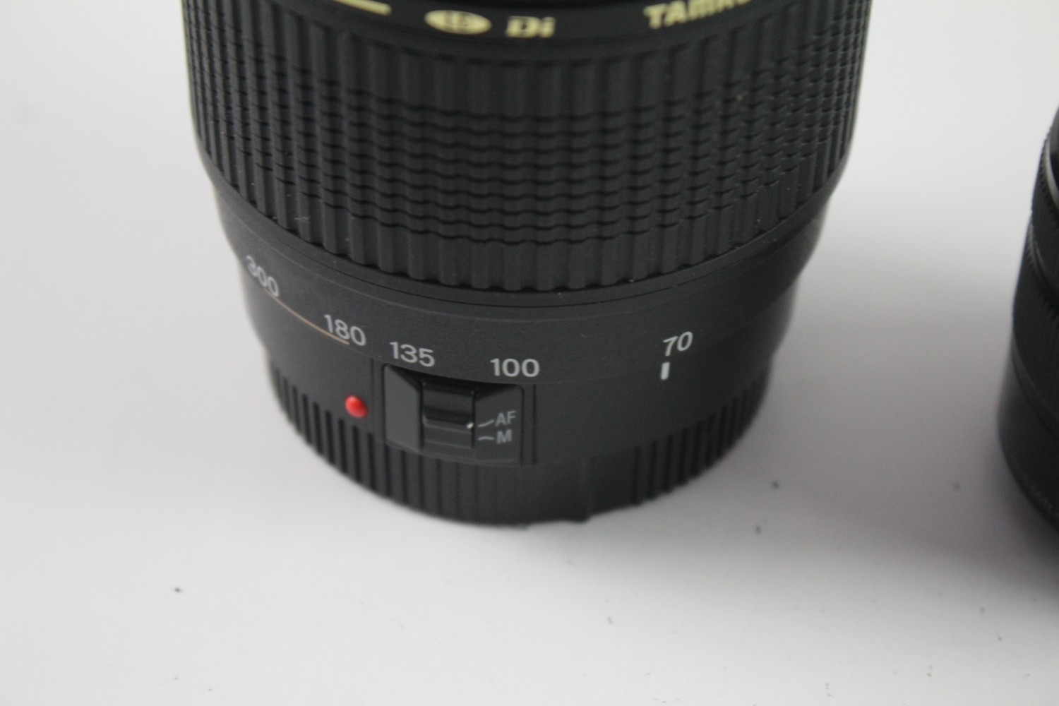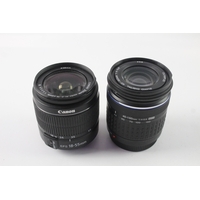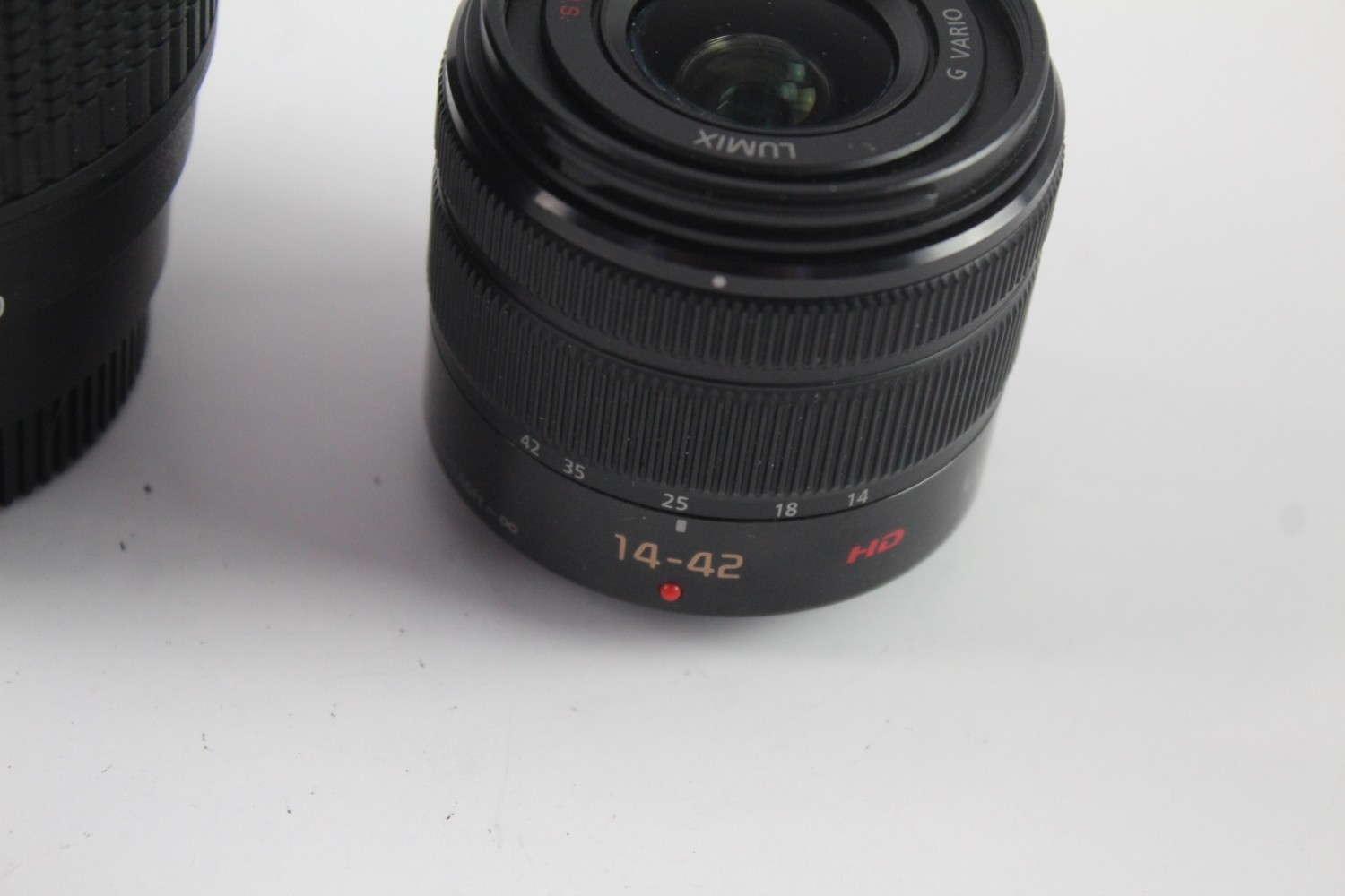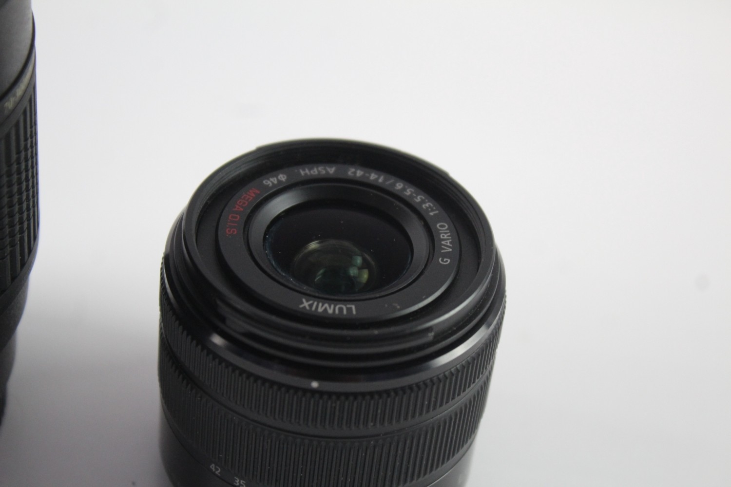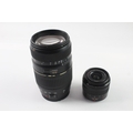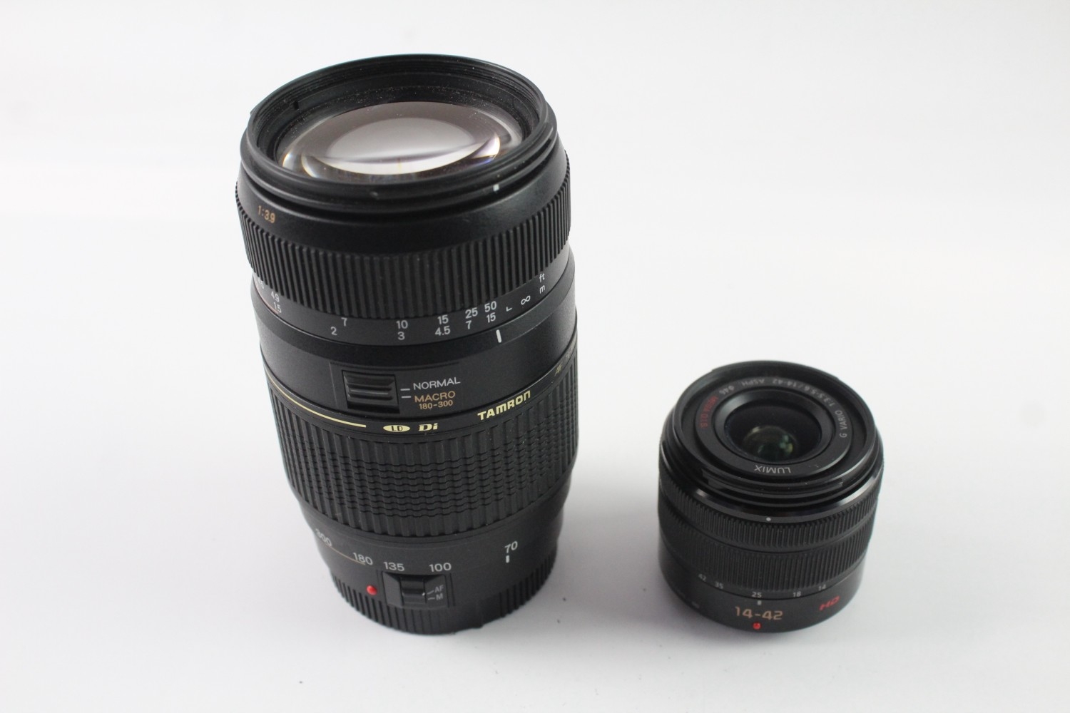 Two autofocus camera lenses, one Panasonic Lumix H-FS1442A Micro Four Thirds G Vario 1:3.5-5.6 14-42mm and one Tamron LD Di 1:4-5.6 70-300mm tele-macro for Canon AF