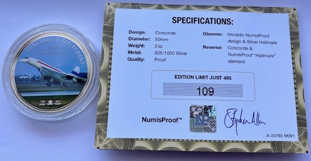 2013 Solid Silver Proof Concorde 10th Anniversary Commemorative Medallion,.925 Silver with colour print, Diameter 50mm, Weight 2oz, COA, Presentation box