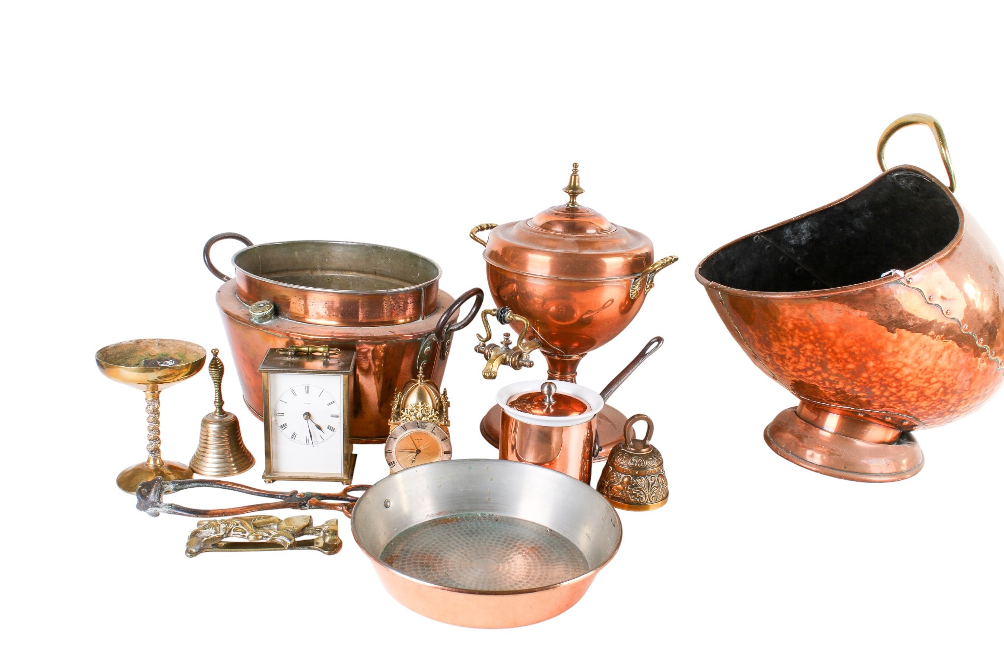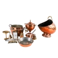 A collection of assorted vintage copper and brassware. Including a coal skuttle, a samovar, a pan, etc. Max. H32cm