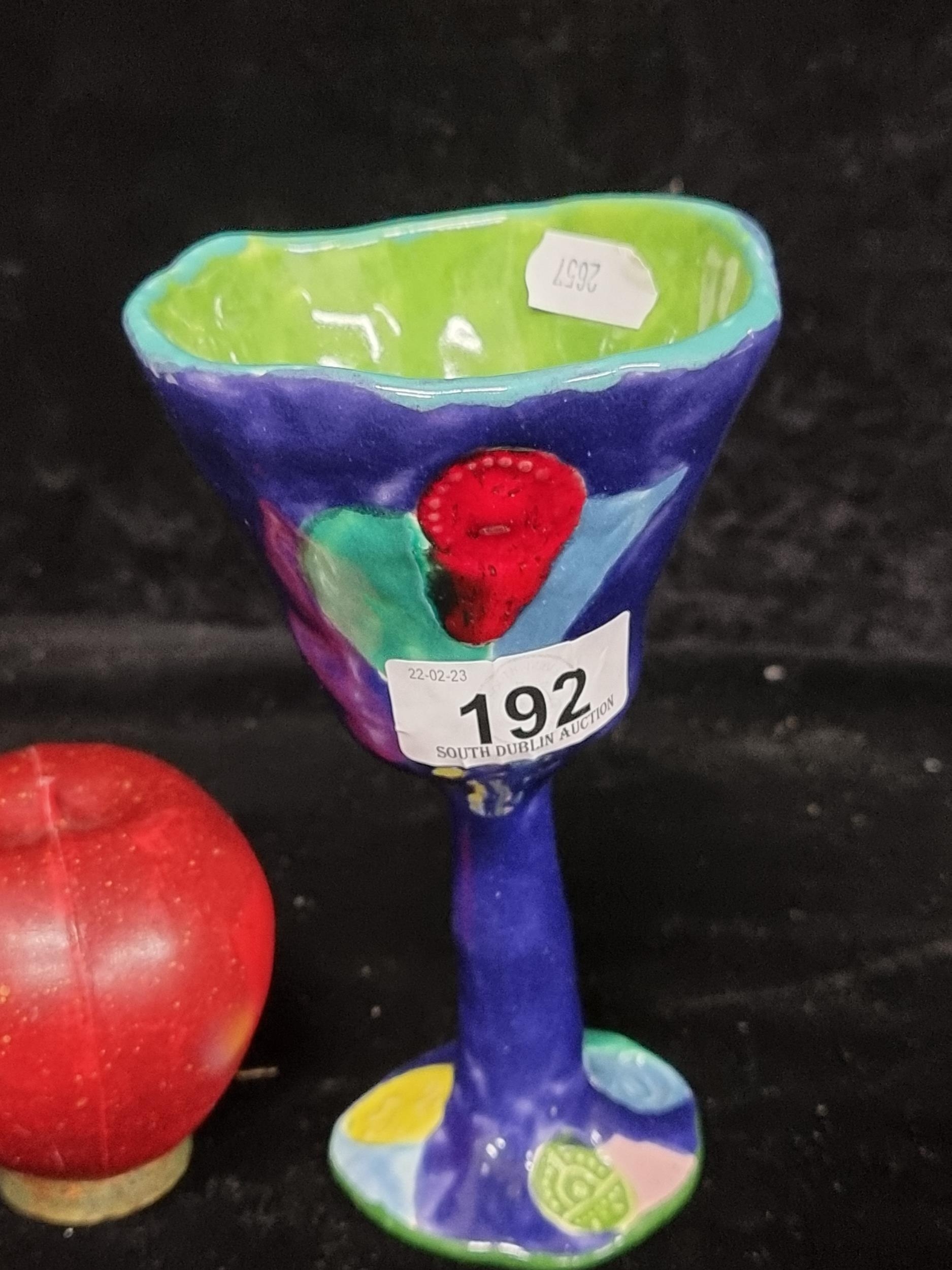 A lovely original John Ffrench ceramic drinking goblet. Hand painted in vibrant shades with abstracted motifs to sides. A striking and unusual addition for collector's of Ffrench's work. In very good condition.