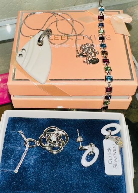 Belleek Living Pendant Necklace + Belleek Coloured Stone Bracelet + Carrick Silverware Pendant Necklace & Pr Of Earrings