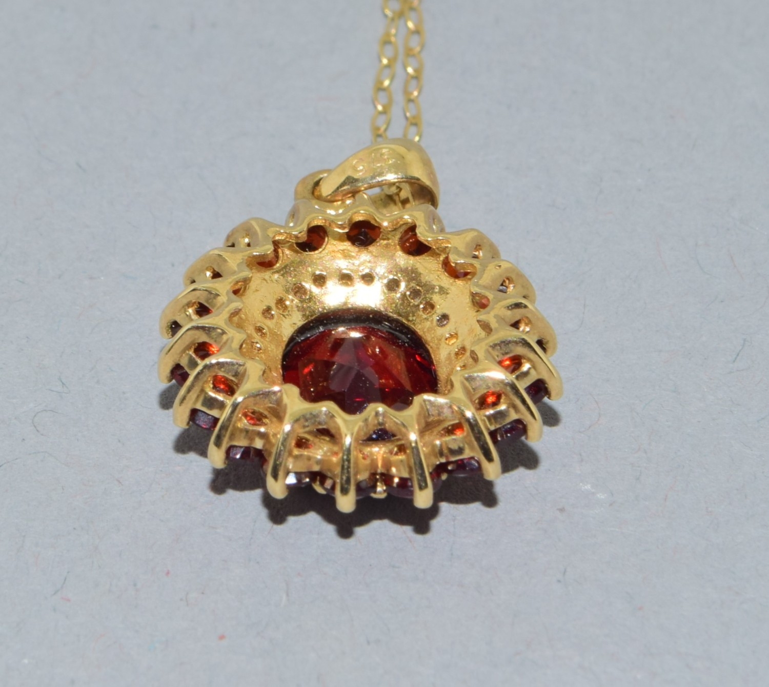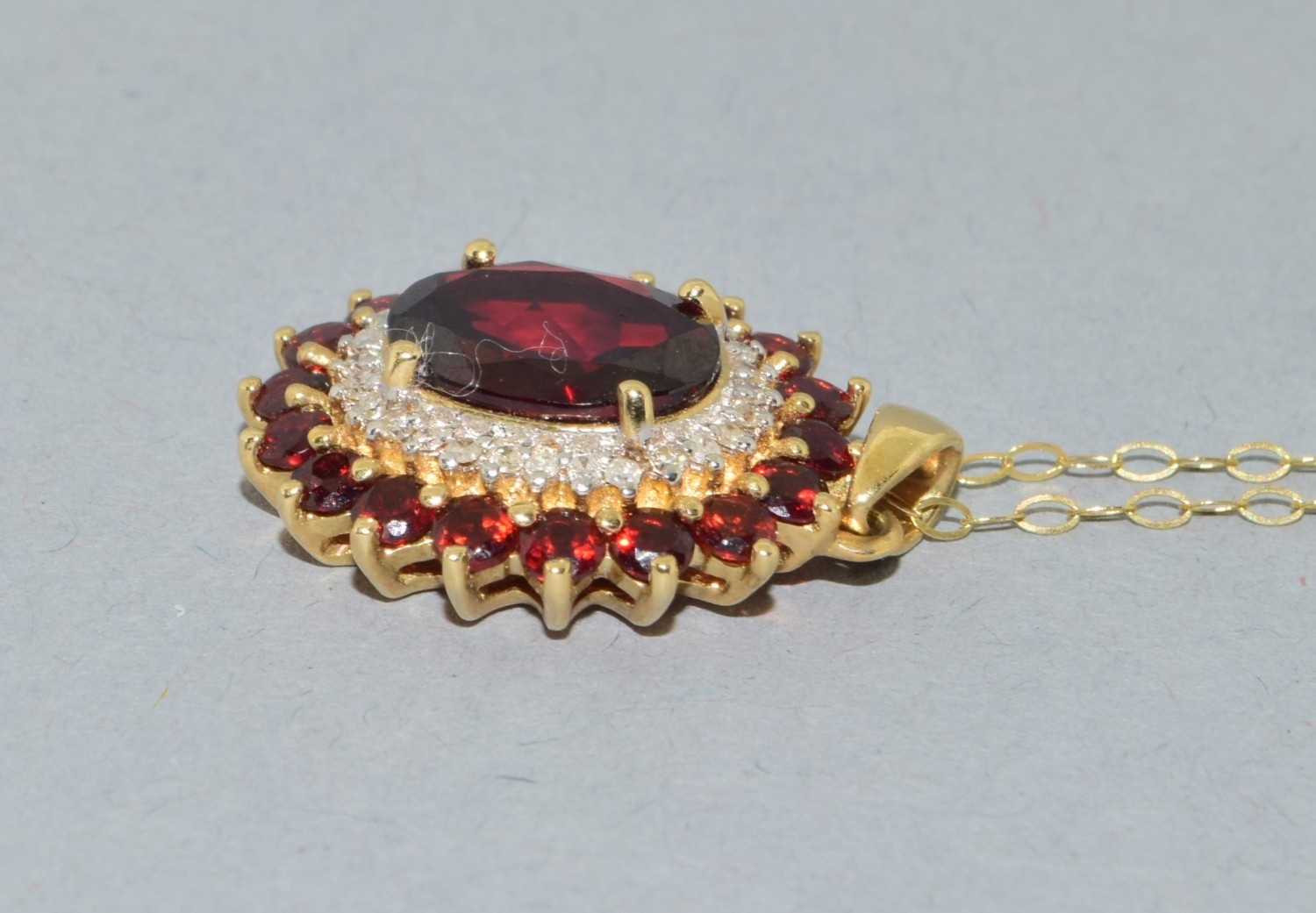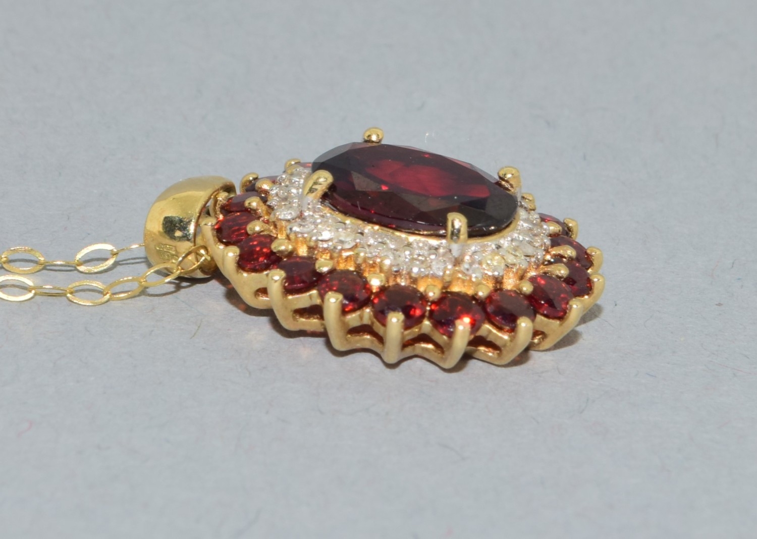 9ct gold Garnet and Diamond pendant necklace on a 9ct gold chain of 40cm long