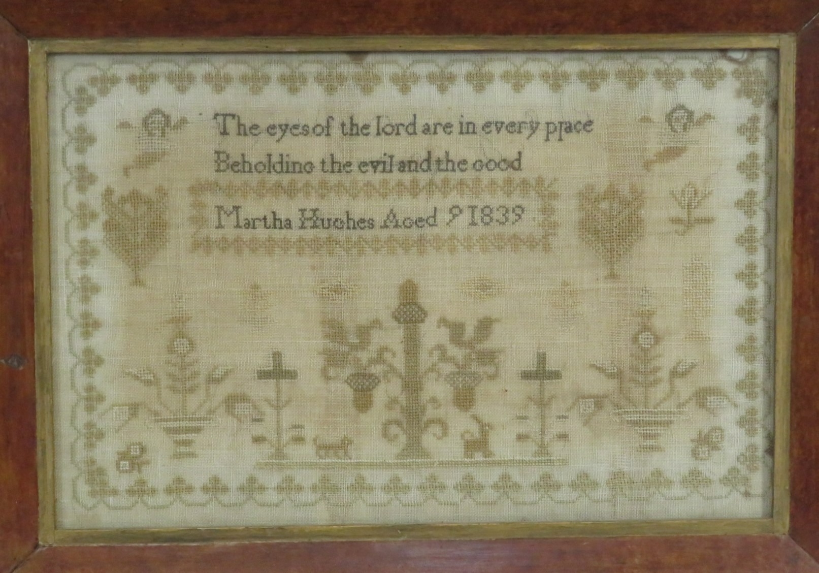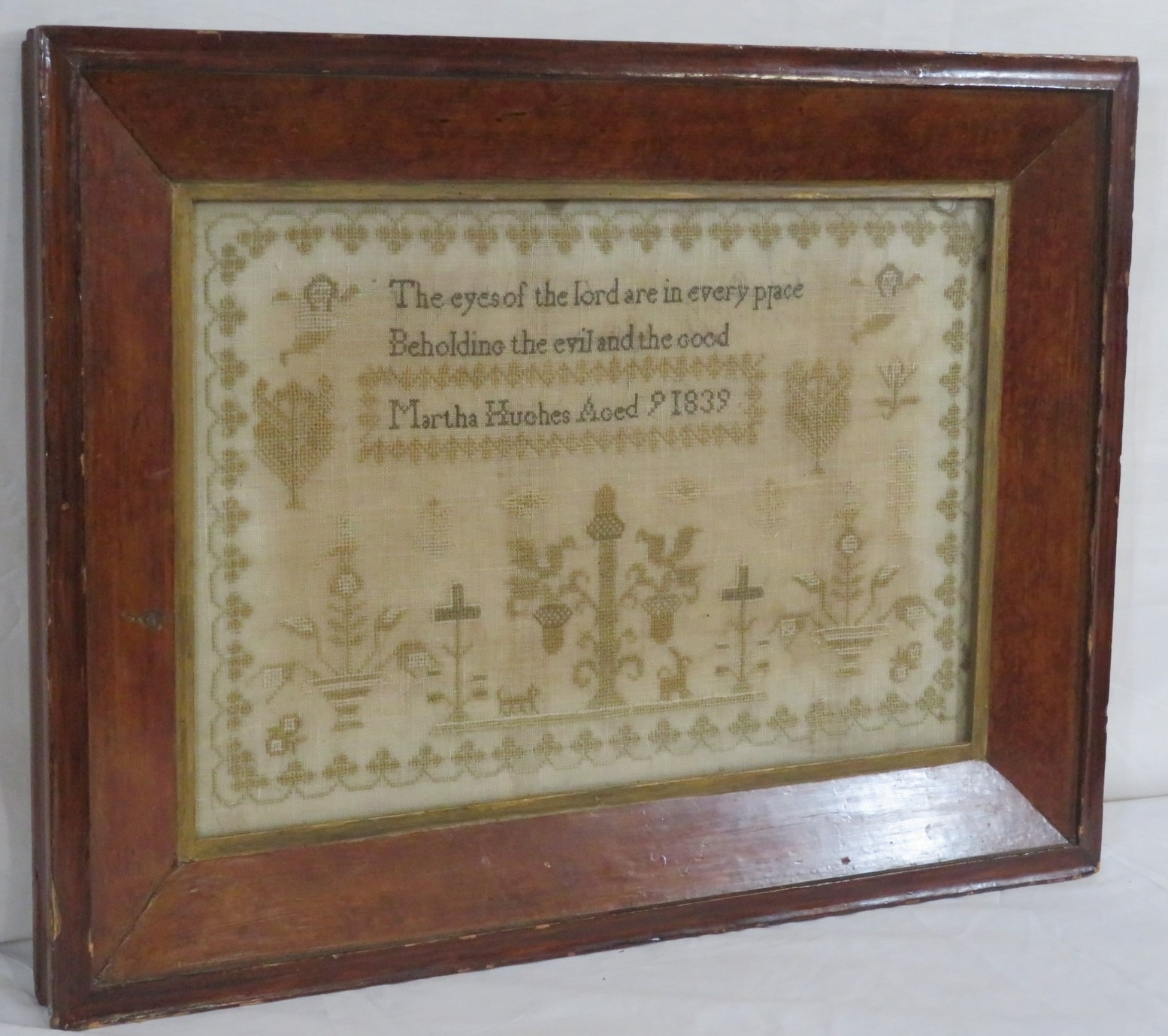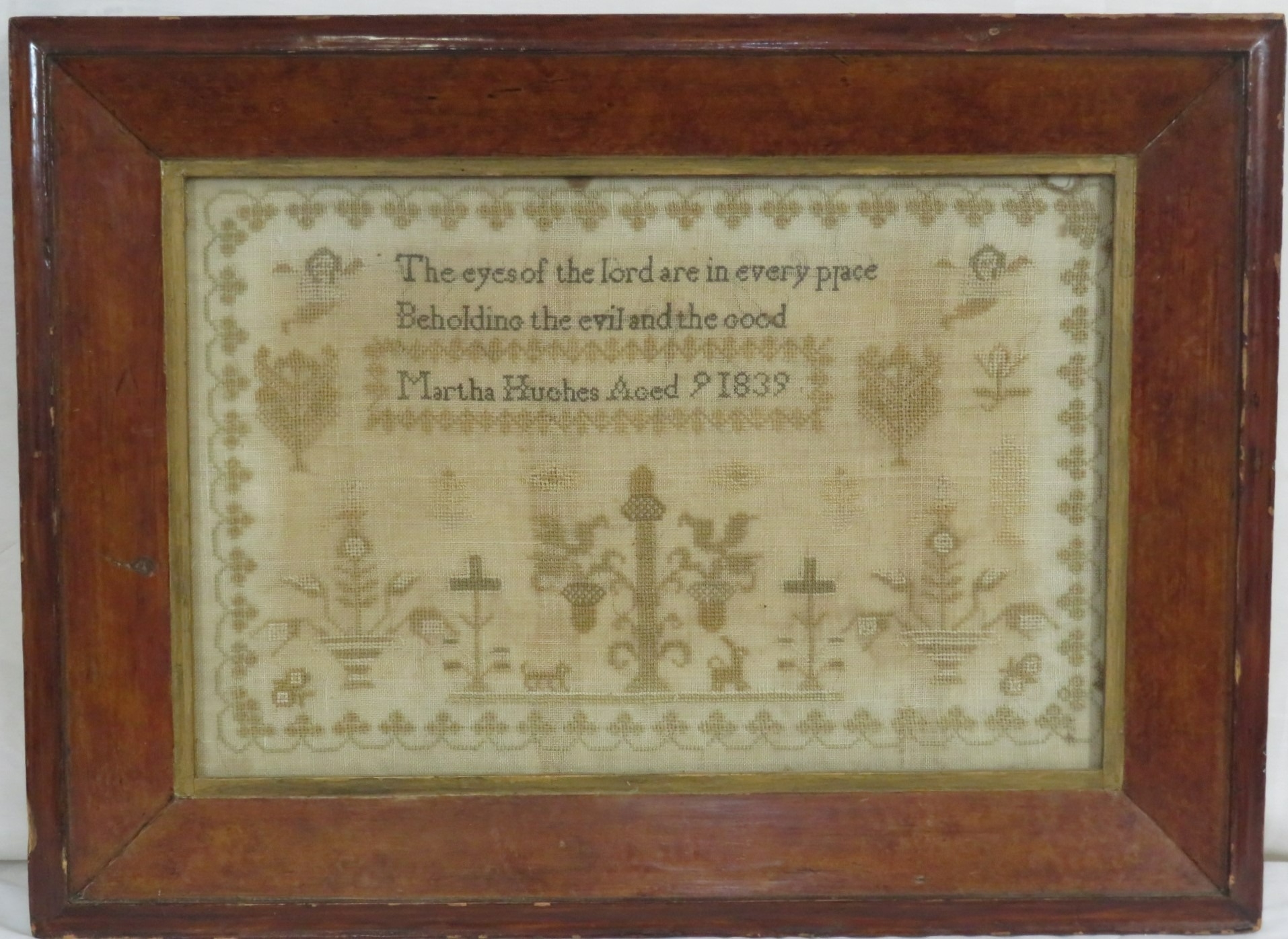 Victorian tester 'The eyes of the Lord...' by Martha Hughes, Aged 9, 1839, 28x43cm