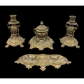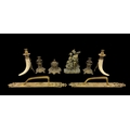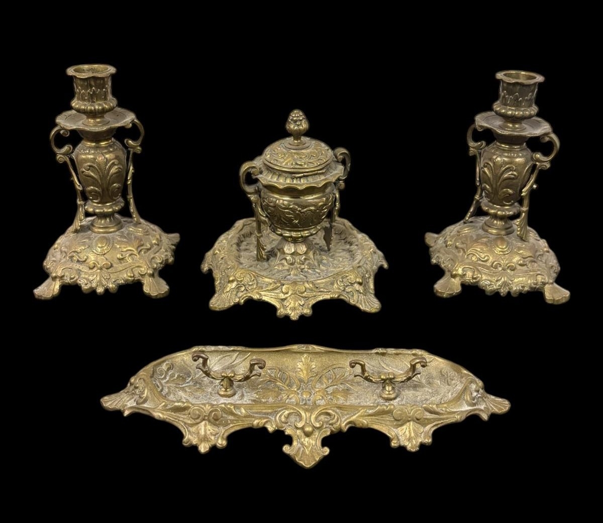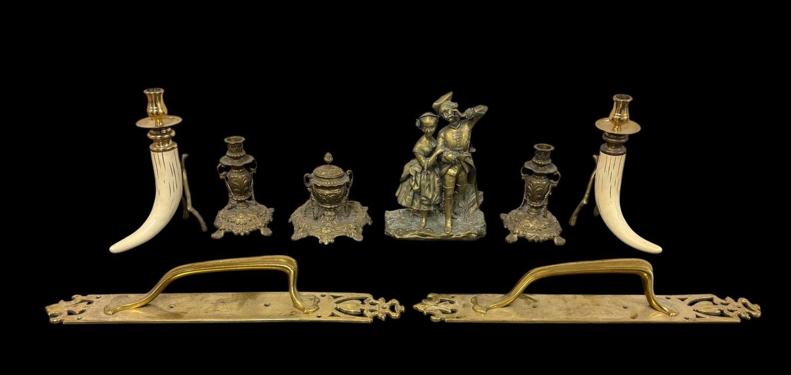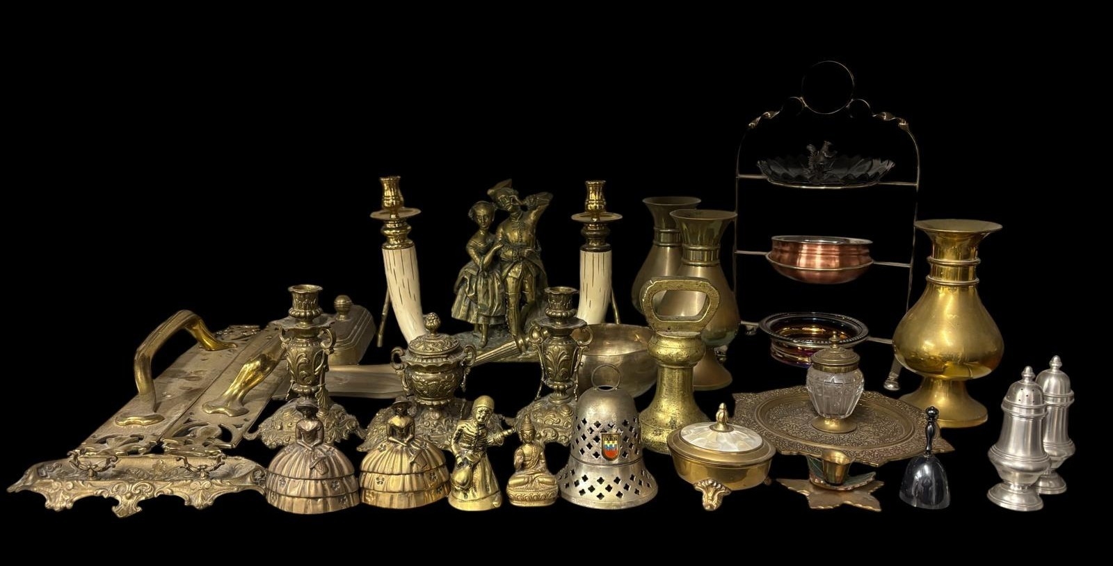 A LARGE COLLECTION OF BRASS AND GILT METAL to include a 19th century gilt bronze sculptural group depicting a young lady on the arm of a moustachioed gentleman, a 19th century gilt brass inkwell stand in the form of a Neo-Classical urn with matching pen rest, a similar pair of gilt brass candlesticks, a pair of Mid-Century brass and moulded resin candlesticks resembling horns, a pair of large brass escutcheon mounted door handles 50.5cm (h)