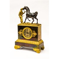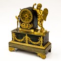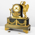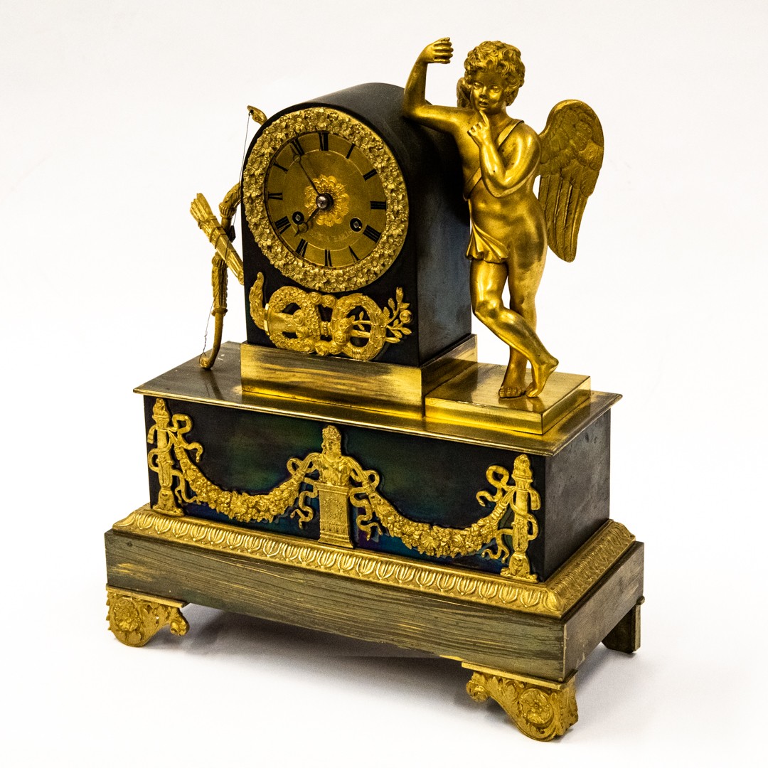 19th CENTURY FRENCH PATINATED AND GILT BRONZE CASED EMPIRE STYLE MANTLE CLOCK, the movement numbered 3590, striking on a bell with silk suspended pendulum, the dial, with roman numerals, inscribed Leroy a Paris, the case with flanking cupid, bow and quiver, 17 1/2in (44.5cm) high x 11 1/2in (29.2cm) wide