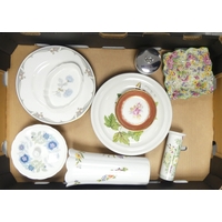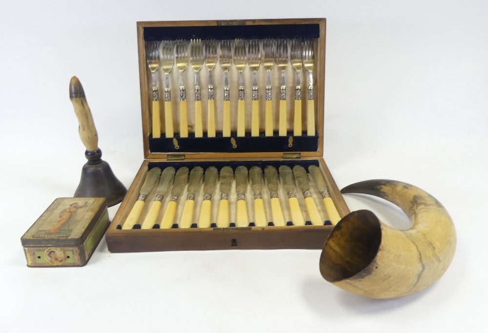 Vintage silver-plated fish knives and forks, powder horn, bell with taxidermy deer hoof handle and Salmon & Gluckstein cigarette tin. (4)