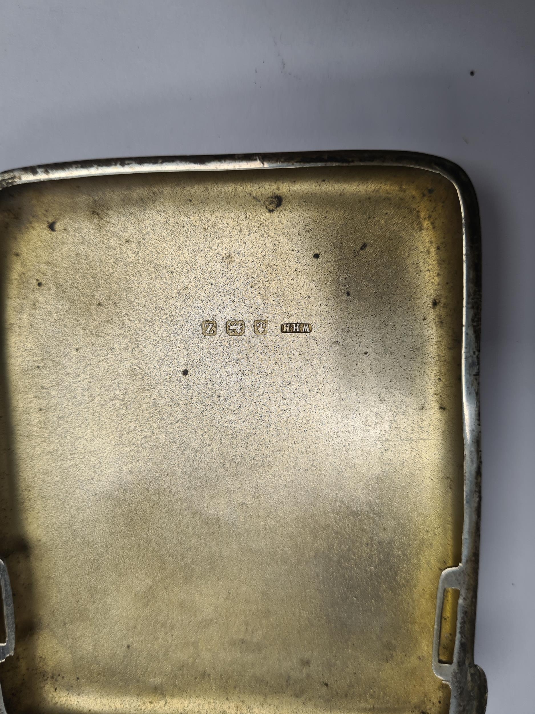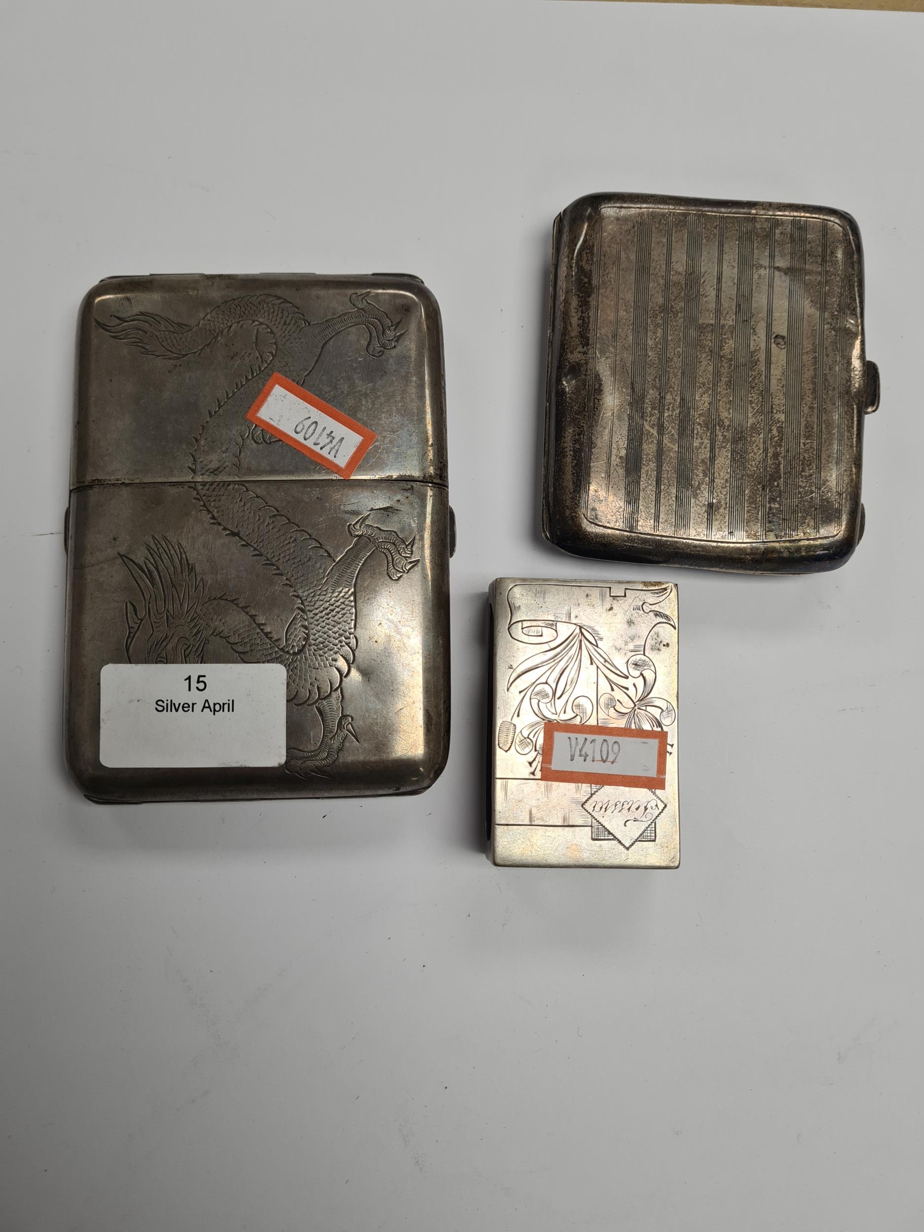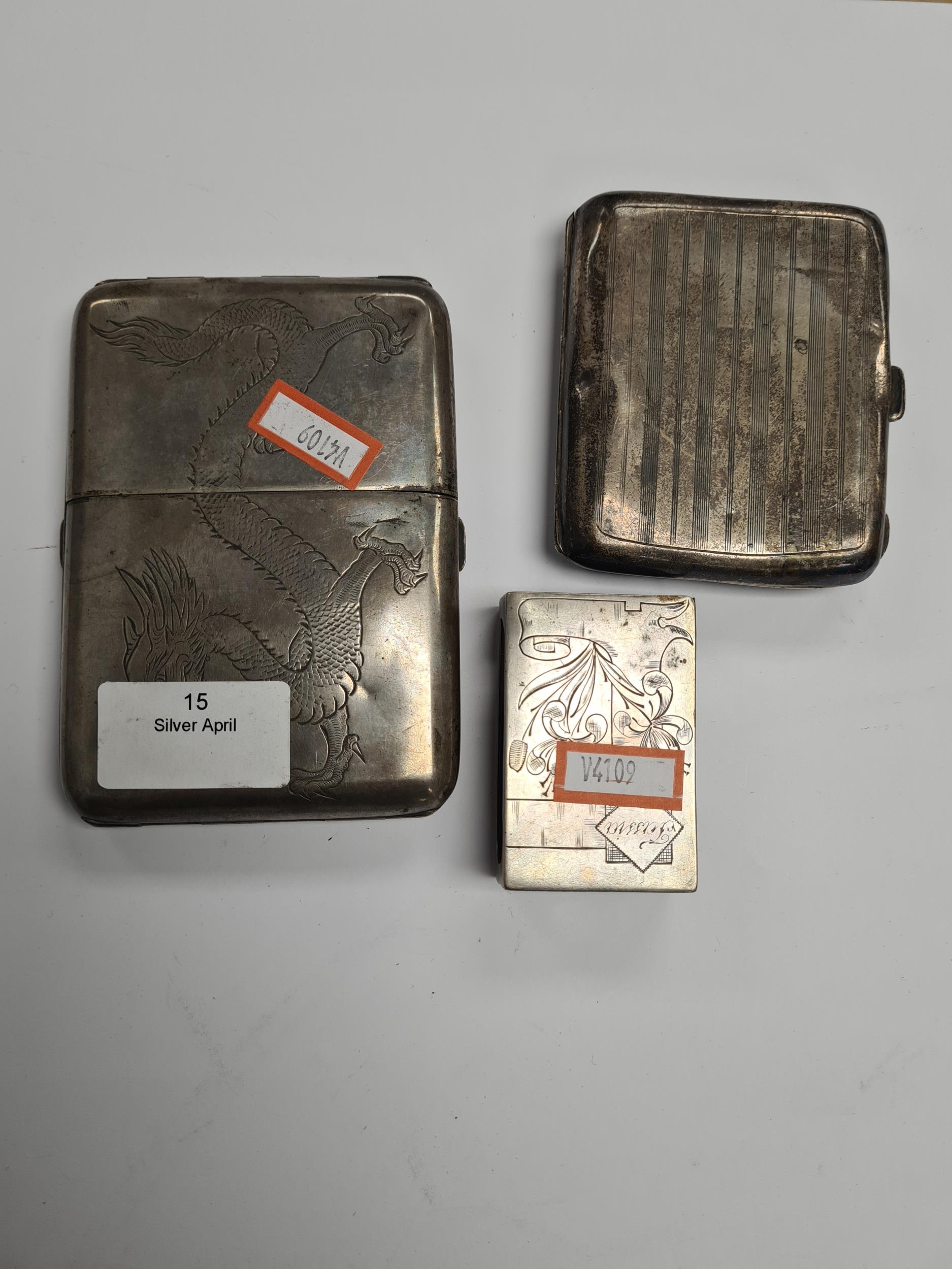 A cigarette case having gilt interior and engraved with a dragon on the exterior, marked AH800 inside. With another cigarette case, by W H Haseler Ltd. Approx 7.22ozt. Condition Report: Some denting