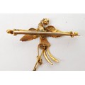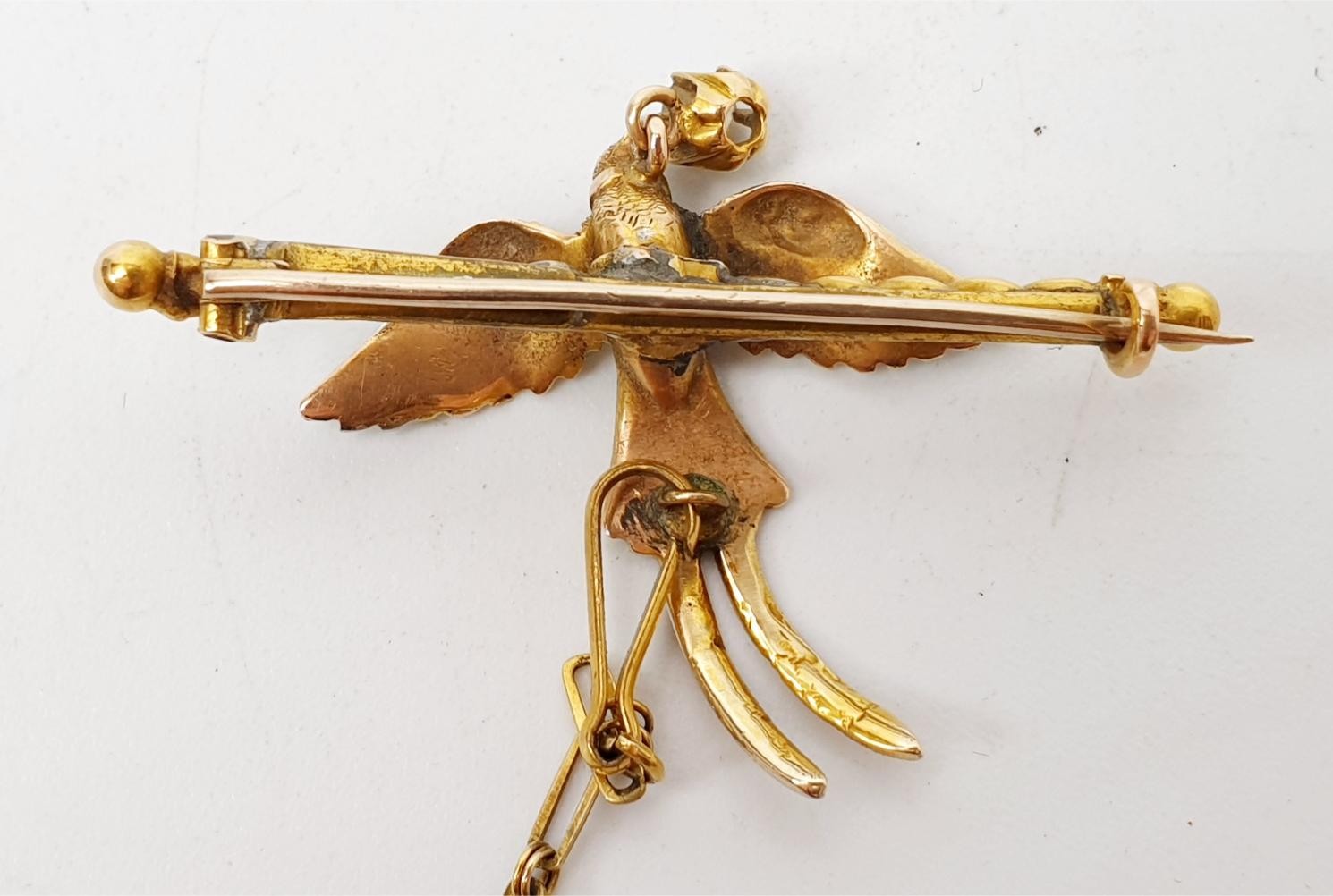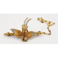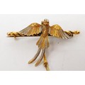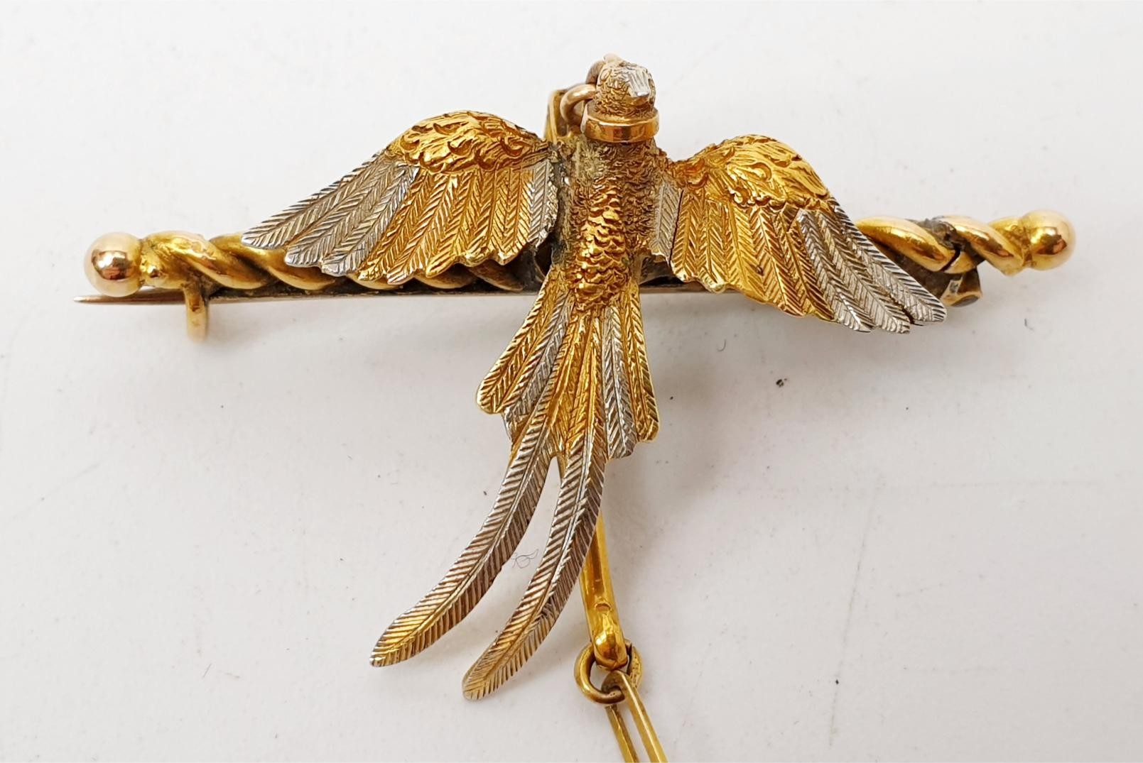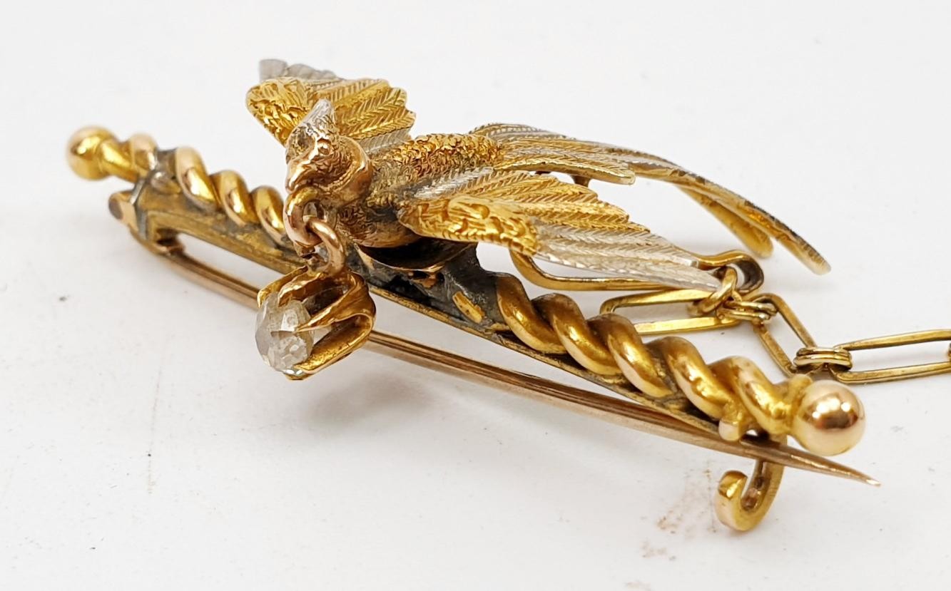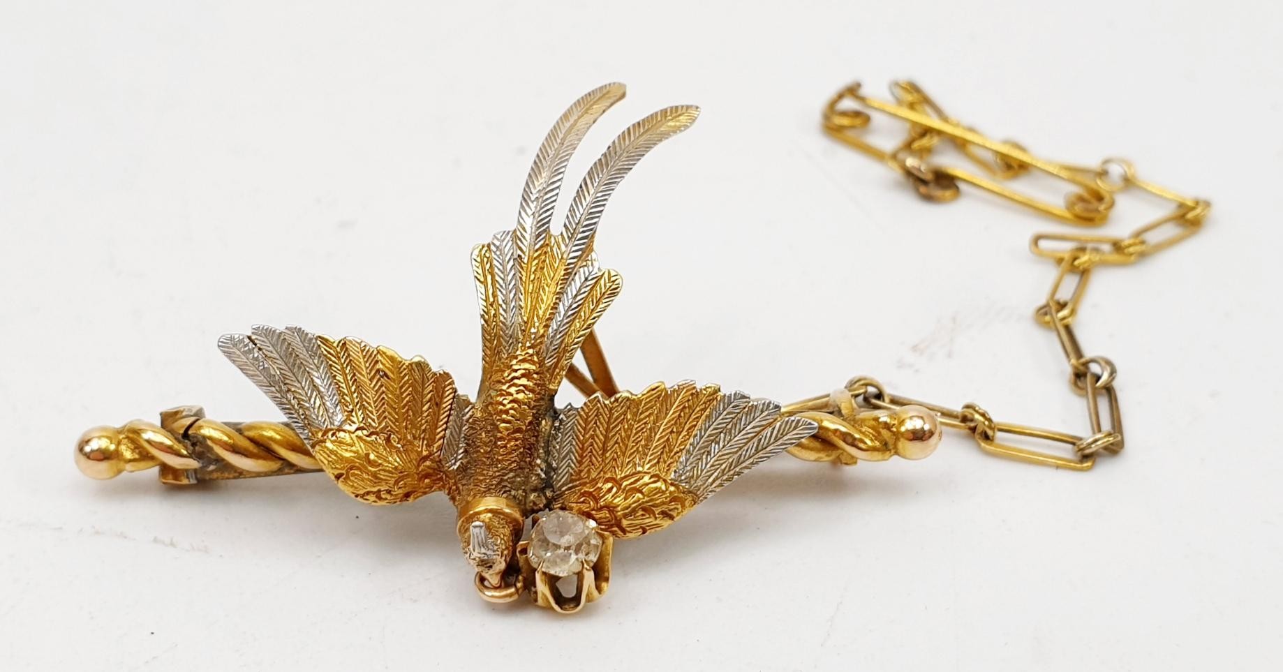 A yellow and white metal brooch in the form of a pheasant in flight having a collar with a diamond suspended from it, gross weight 6.3g, length 4cm. UK shipping £14.
