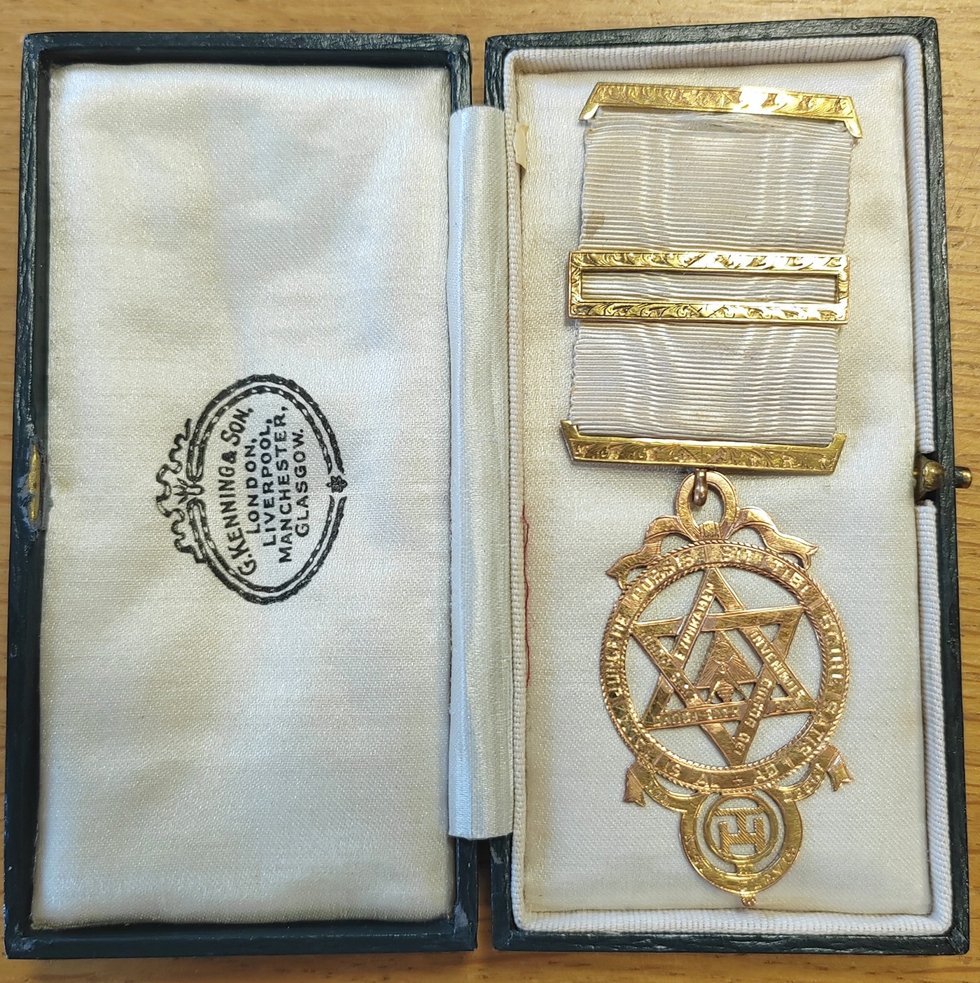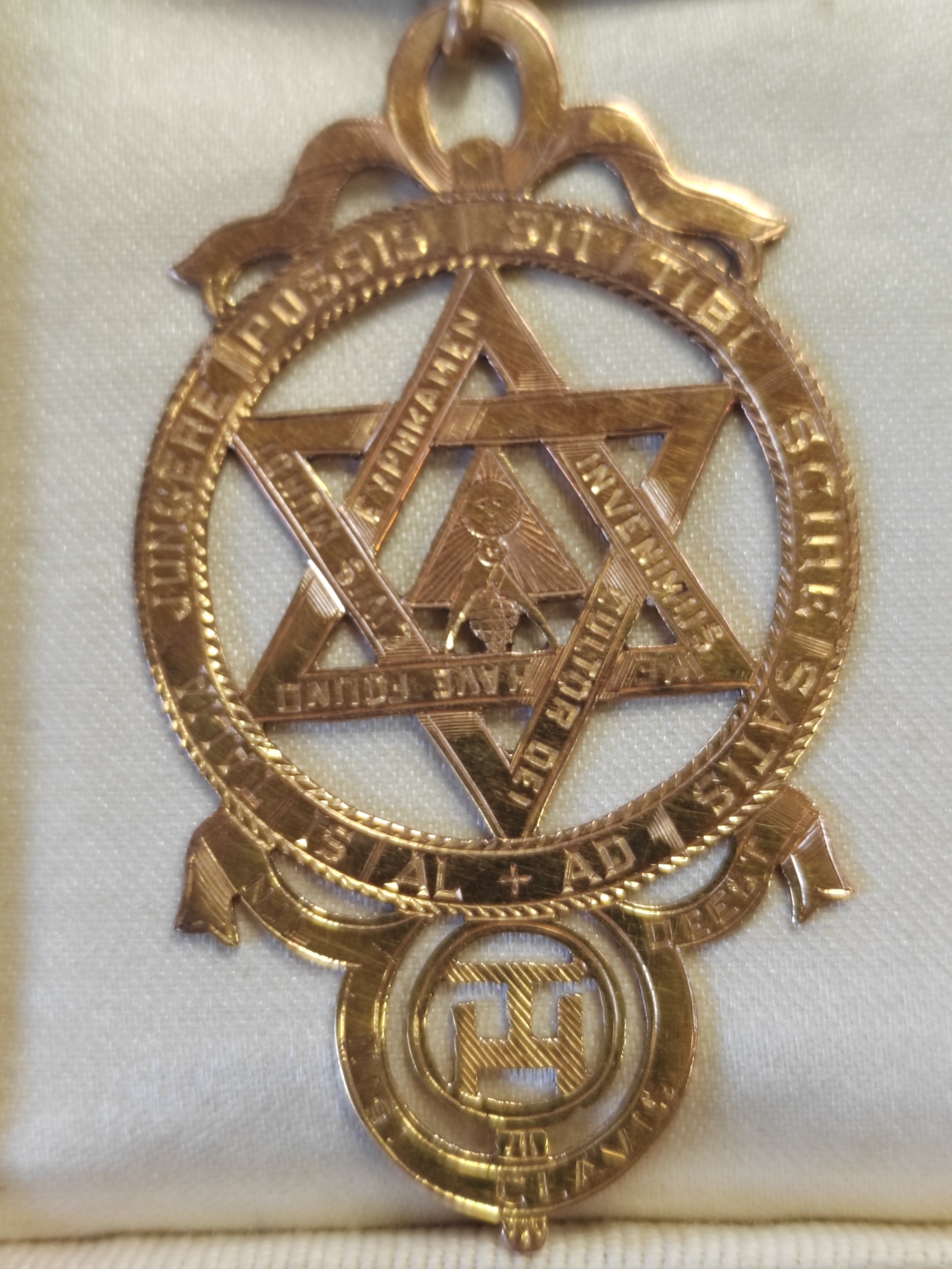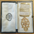9ct gold Past MEZ Chapter Jewel masonic medal dated march 1904 with stamp marks, weight with pin removed 8.1g boxed extremely fine. (Y)