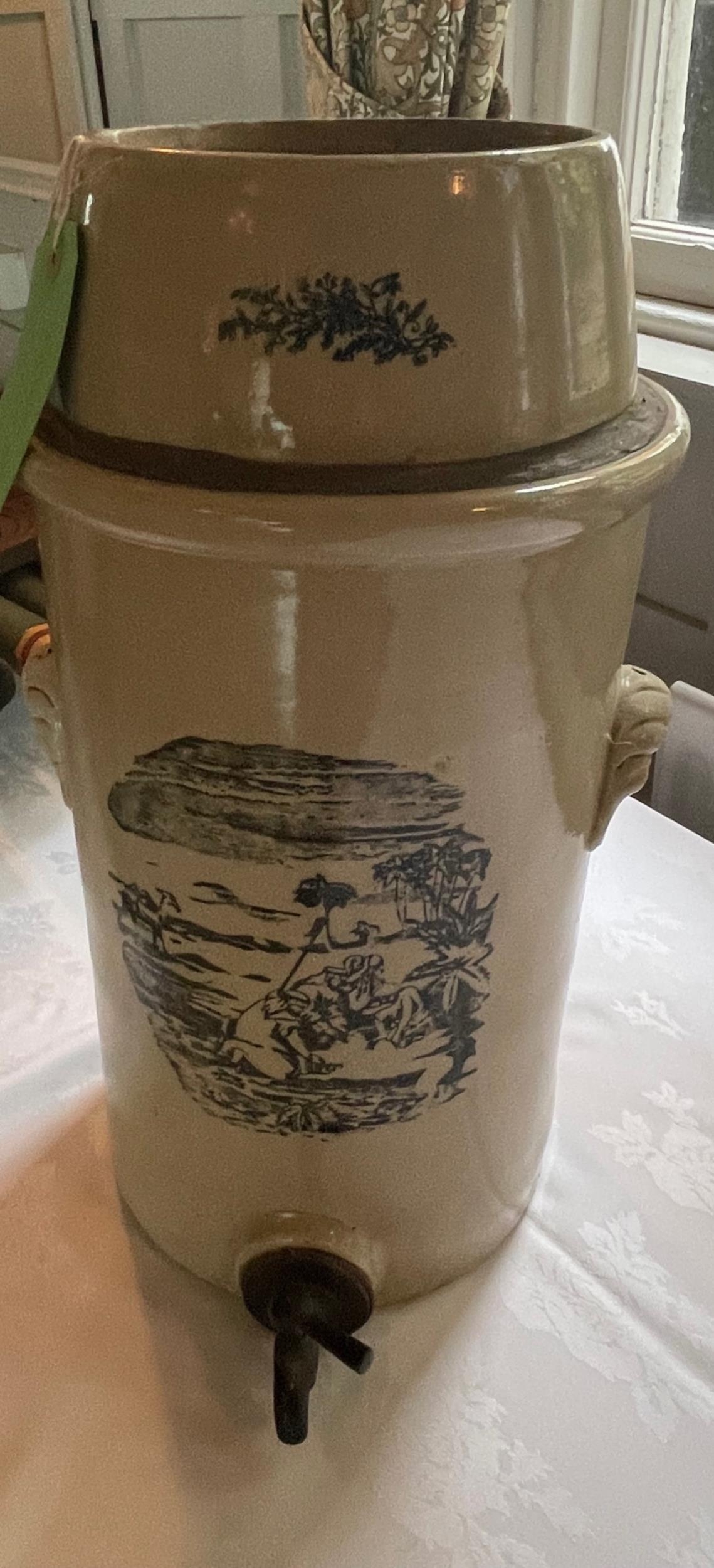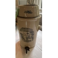 An ANTIQUE large glazed pottery container with tap - for pouring and storing beer - came from an old INN - with pirate scenes featured - stands 2ft tall approx