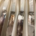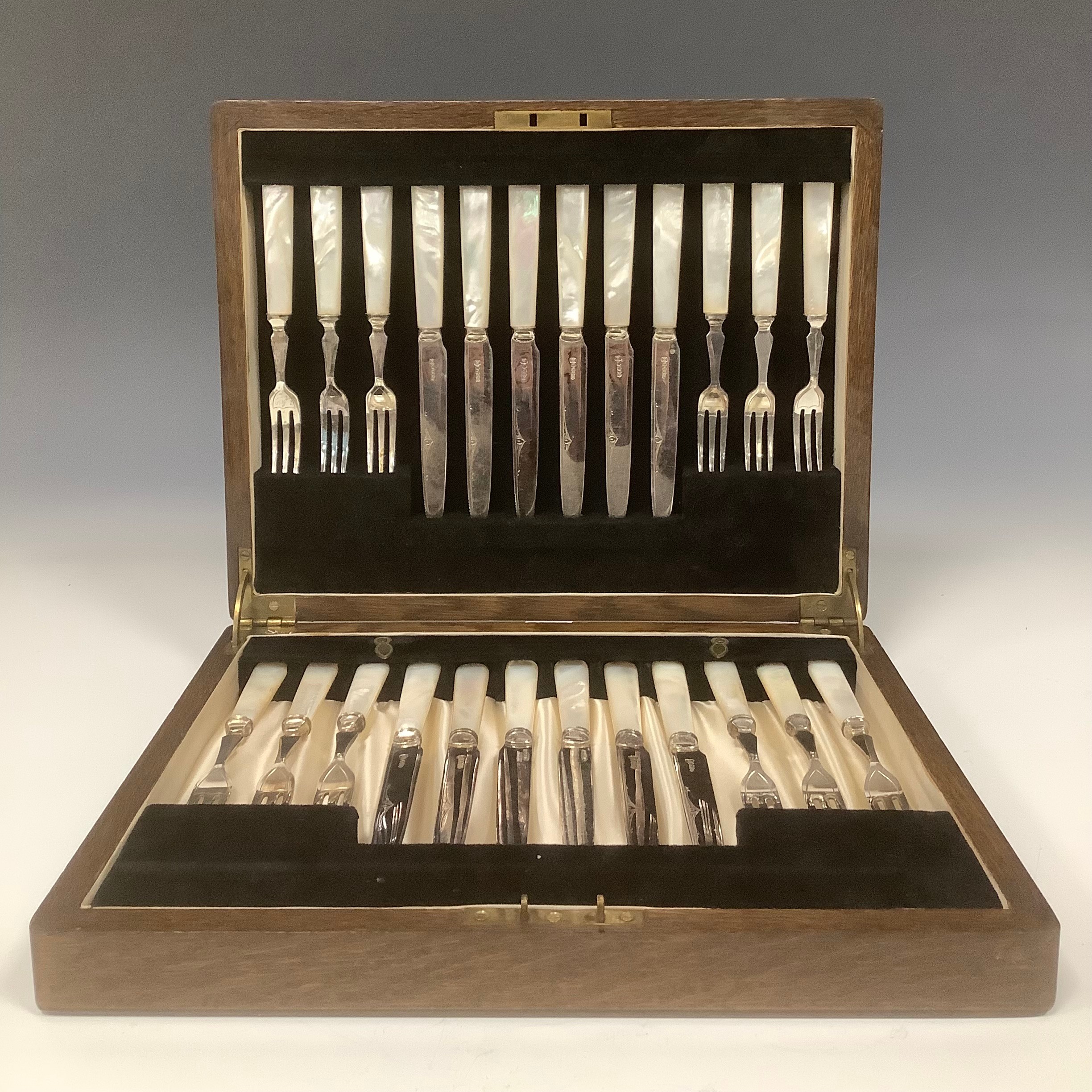An early 20th century E.P.N.S and faux mother of pearl fruit service, comprising twelve pairs of knives and forks, the oak ccanteen box 29cm wide