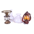 Two converted oil lamps. Including a brass example with white shade and a chimney, etc. Largest H51cm