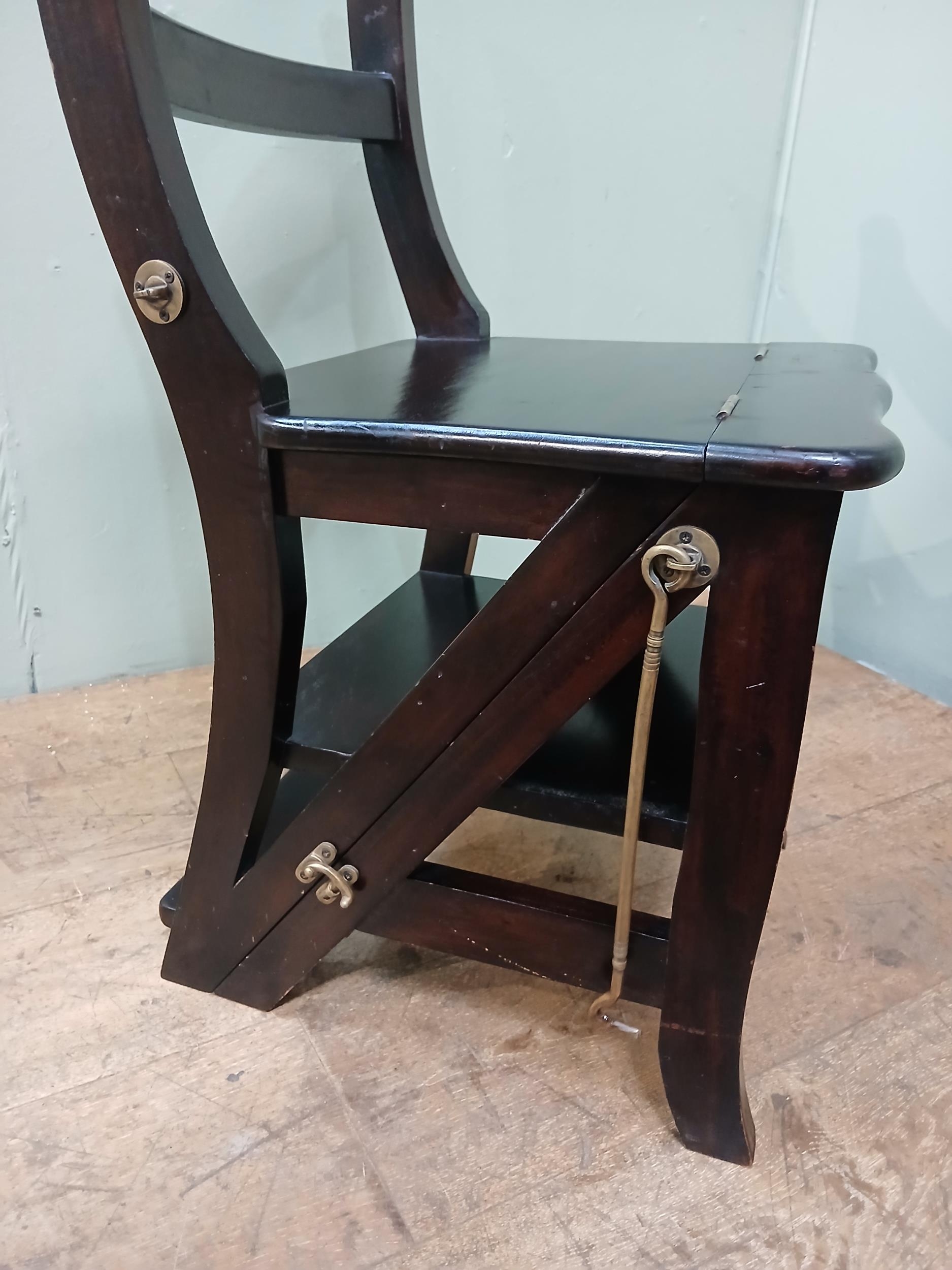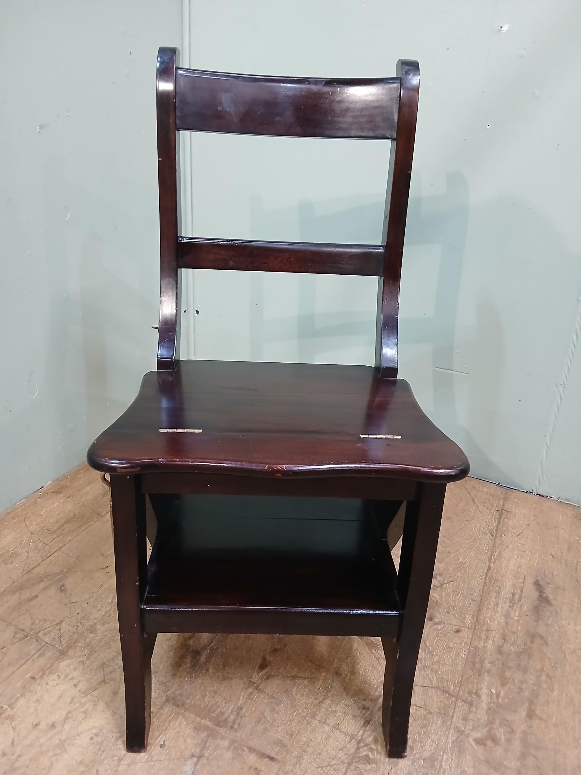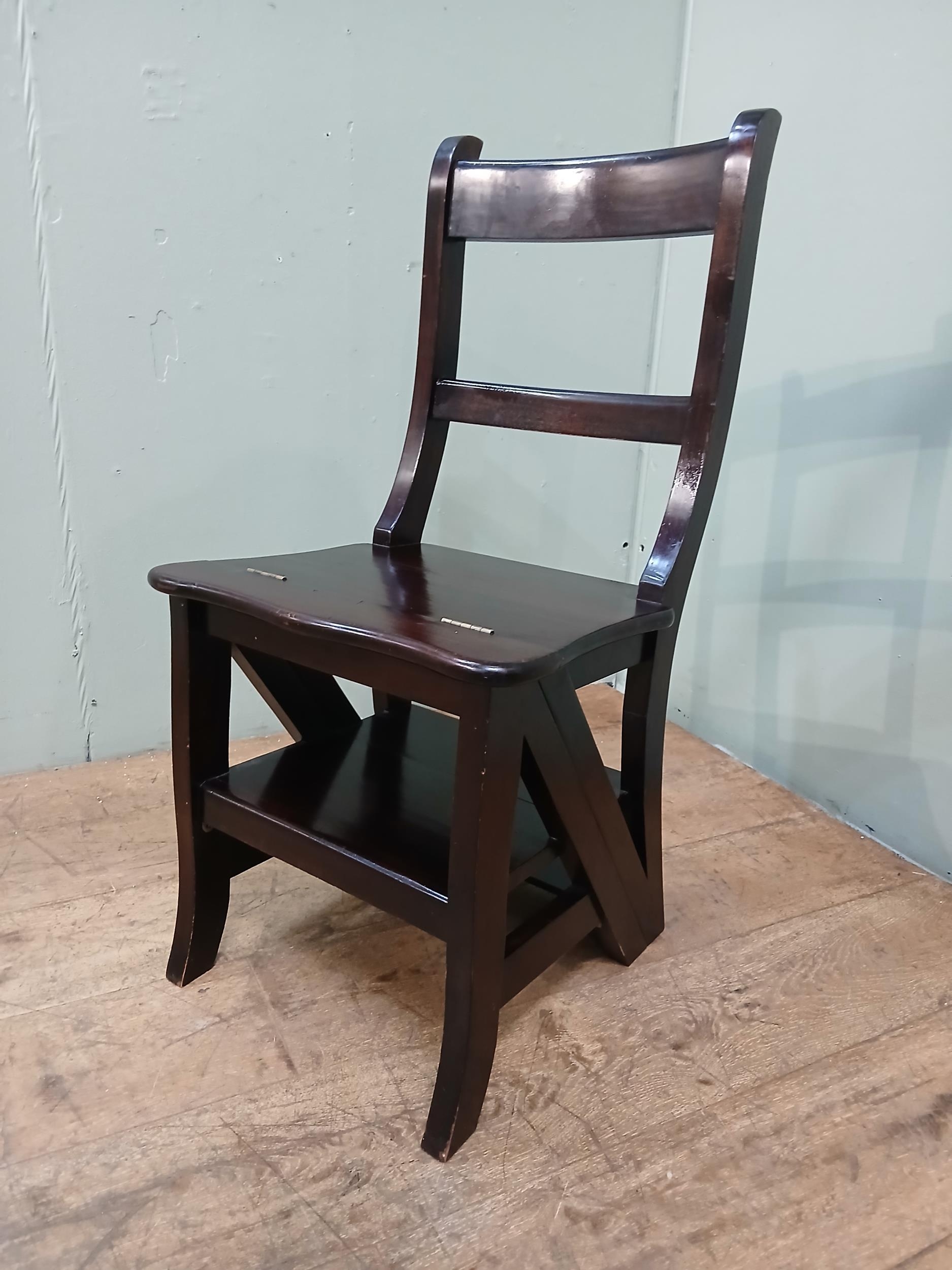 Mahogany metamorphic library chair. {H 87cm x W 43cm xx D 39cm Ladder H 88cm x W 42cm x D 66cm }. NOT AVAILABLE TO VIEW IN PERSON.