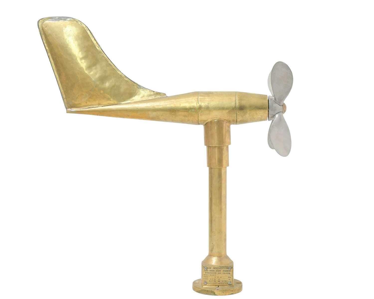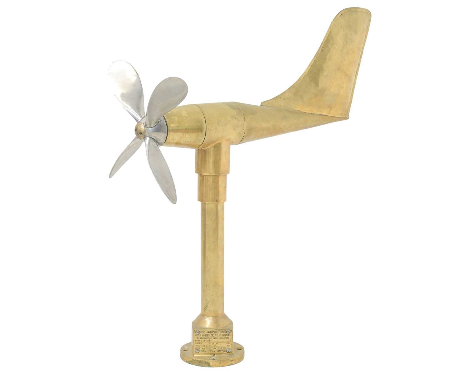 A model 'N-162D' brass anemometer. Made in Bergen, Norway, this piece features a brass column and an aluminium four-blade propeller, with a brass tail fin. The plaque on the column dates the piece to October 1992, and it measures 76cm in height.