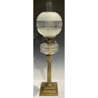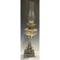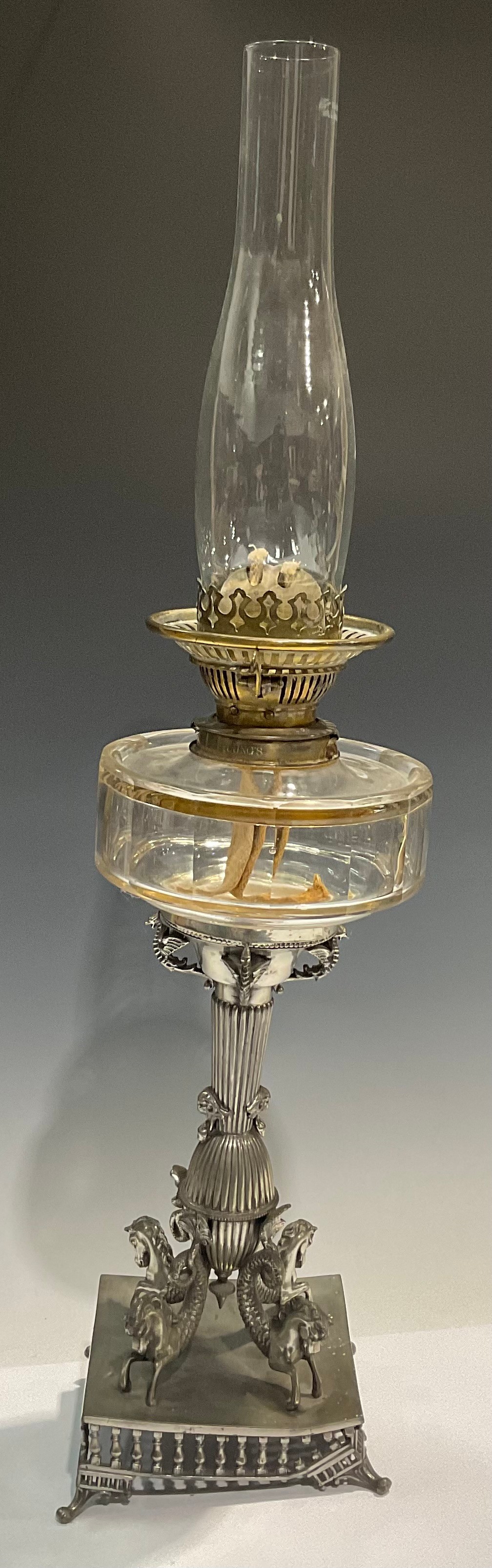 A late 19th century pewter oil lamp, the square base cast with mythical seahorses, clear glass reservoir, globular acid etched shade, glass chimney, 67cm high overall