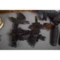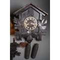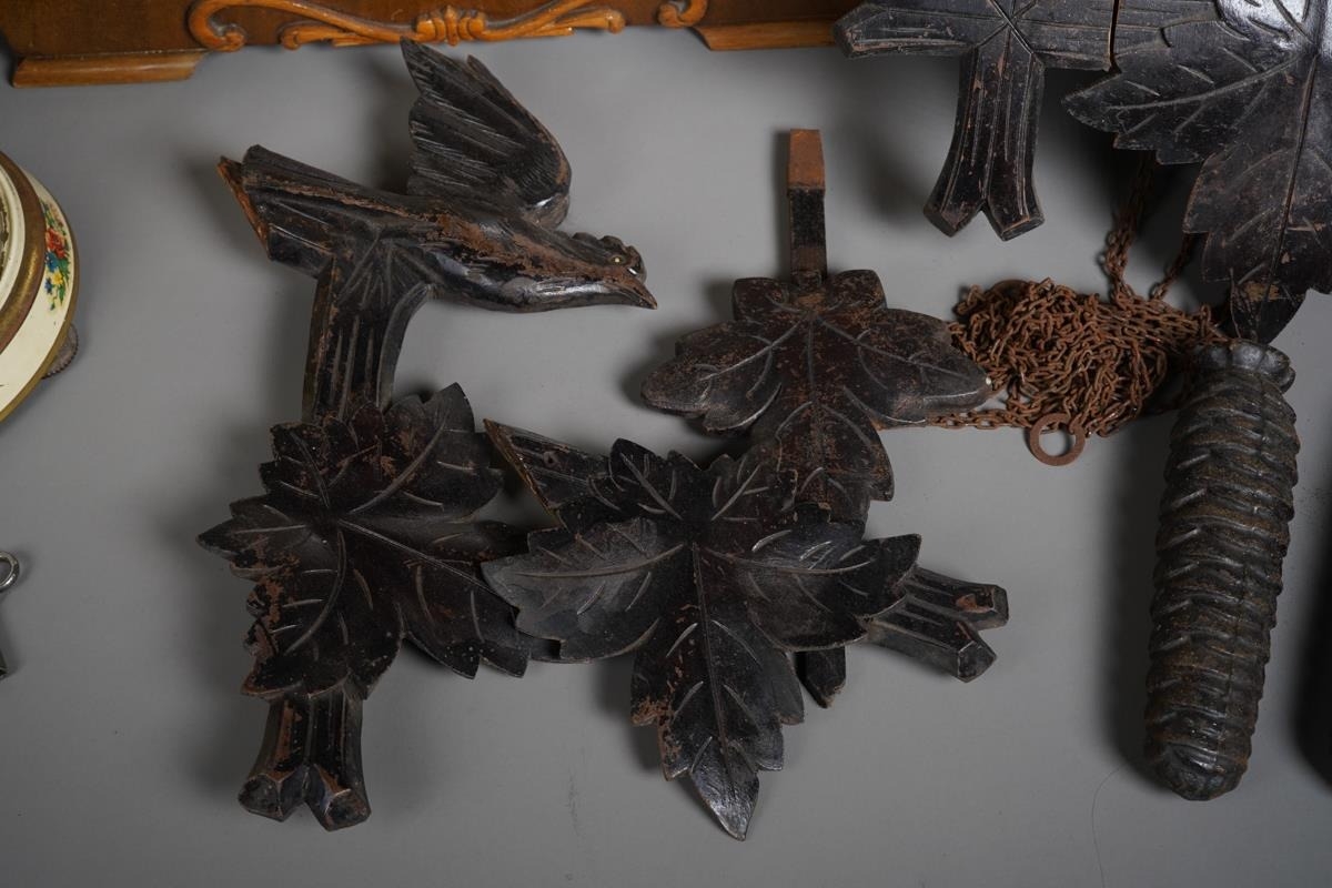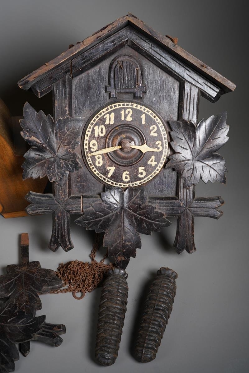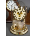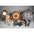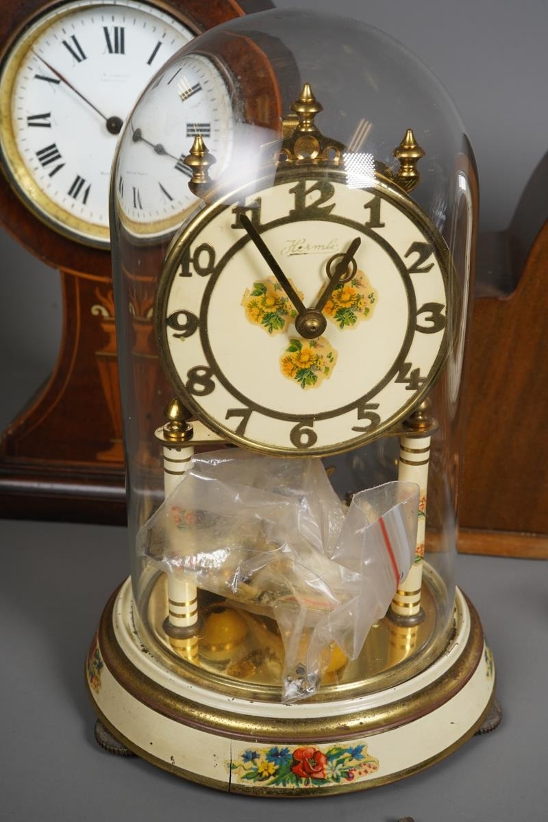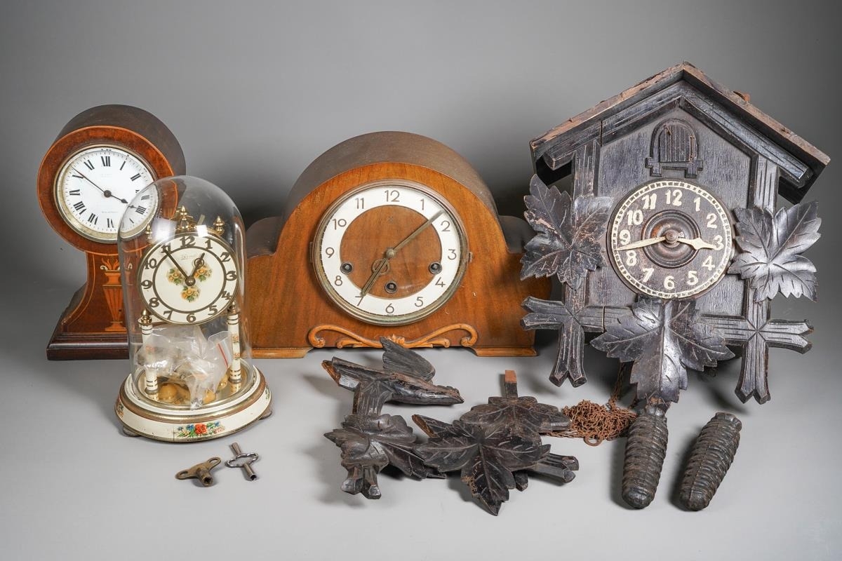 Four various 20th century wall and mantel clocks, comprising an Edwardian balloon shaped mahogany and inlaid mantel clock, a German cuckoo clock in need of restoration, a Hermle floral anniversary clock under a glass dome and a 1940's dome top mantel clock (4)