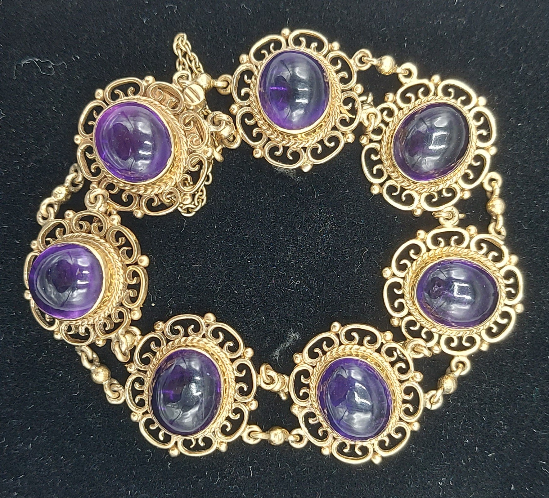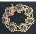 A 9ct gold linked bracelet set with seven cabochon Amethysts within pierced surrounds, 28.1g