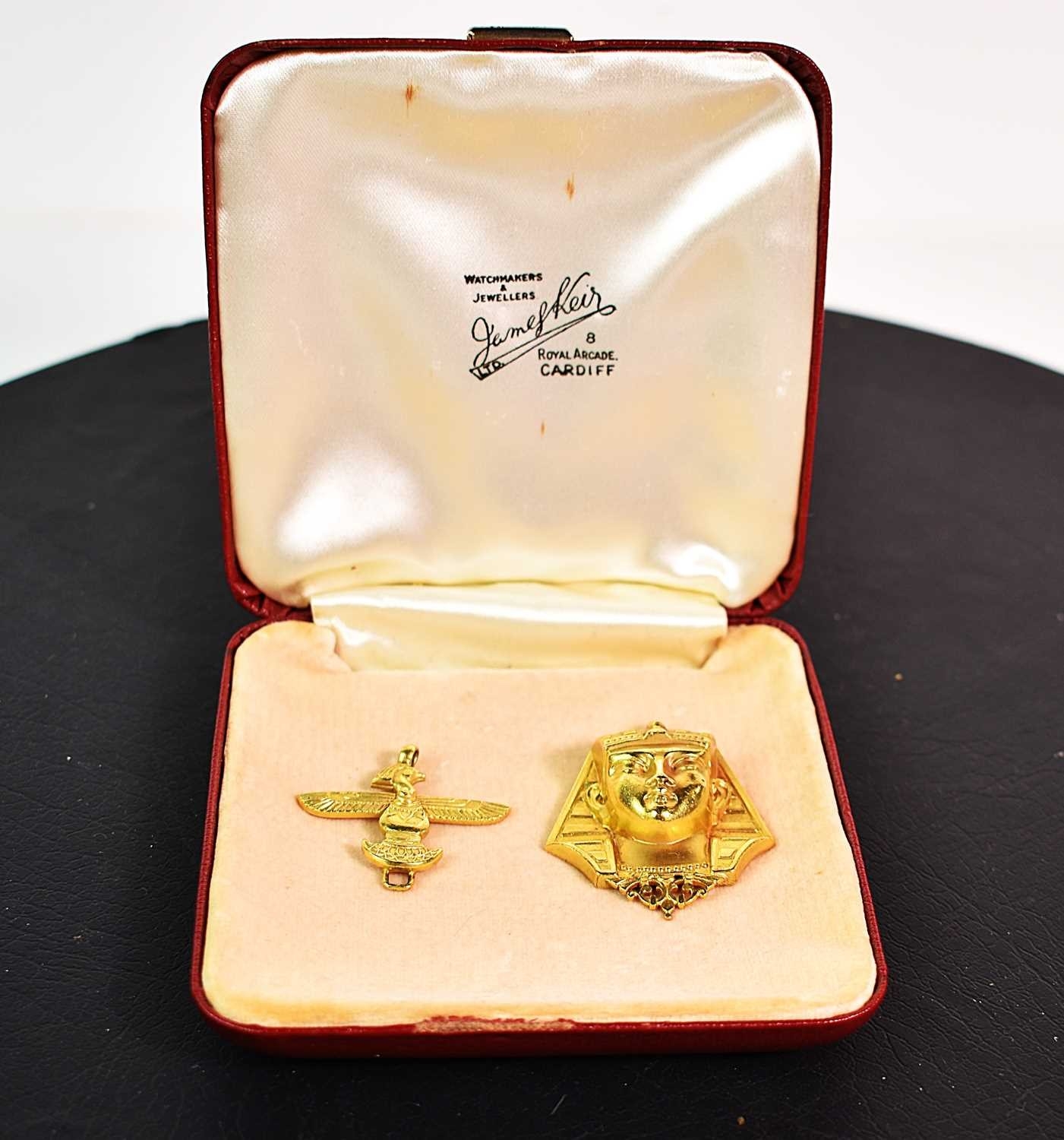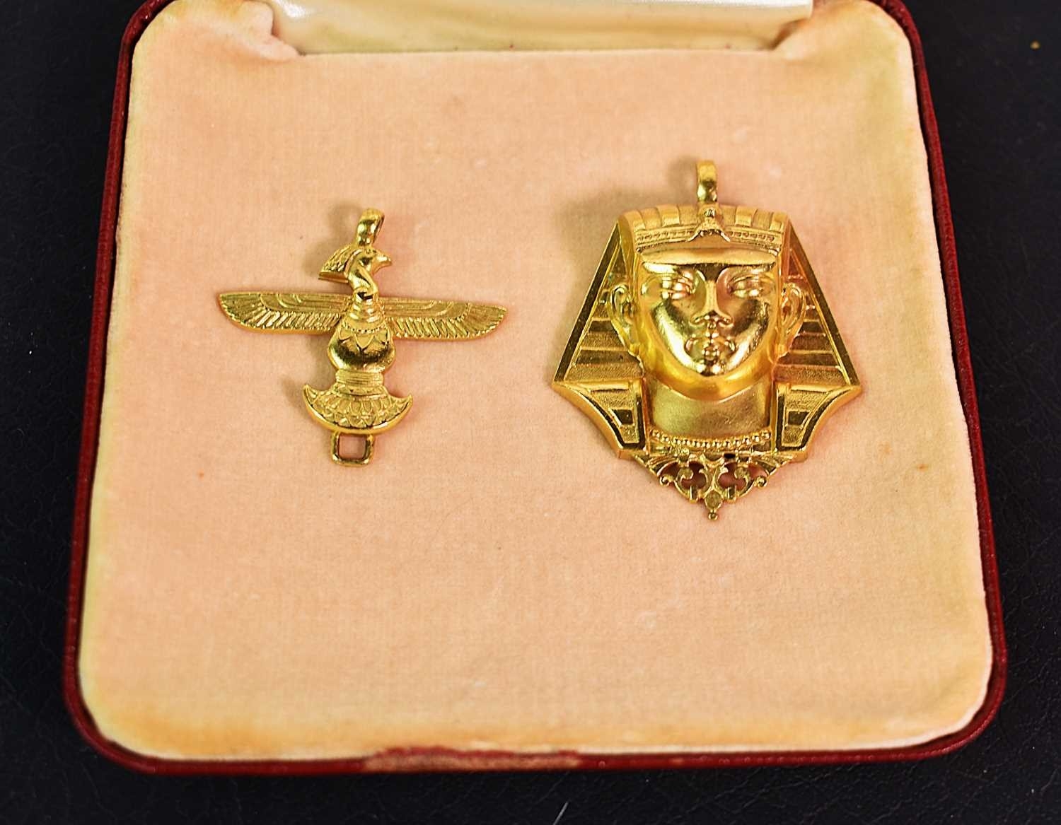 A gold plated vintage pendant in the form of a pharaohs head, together with a further Egyptian pendant in the form of an eagle with outspread wings 3.2cm wide.