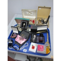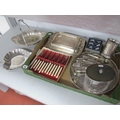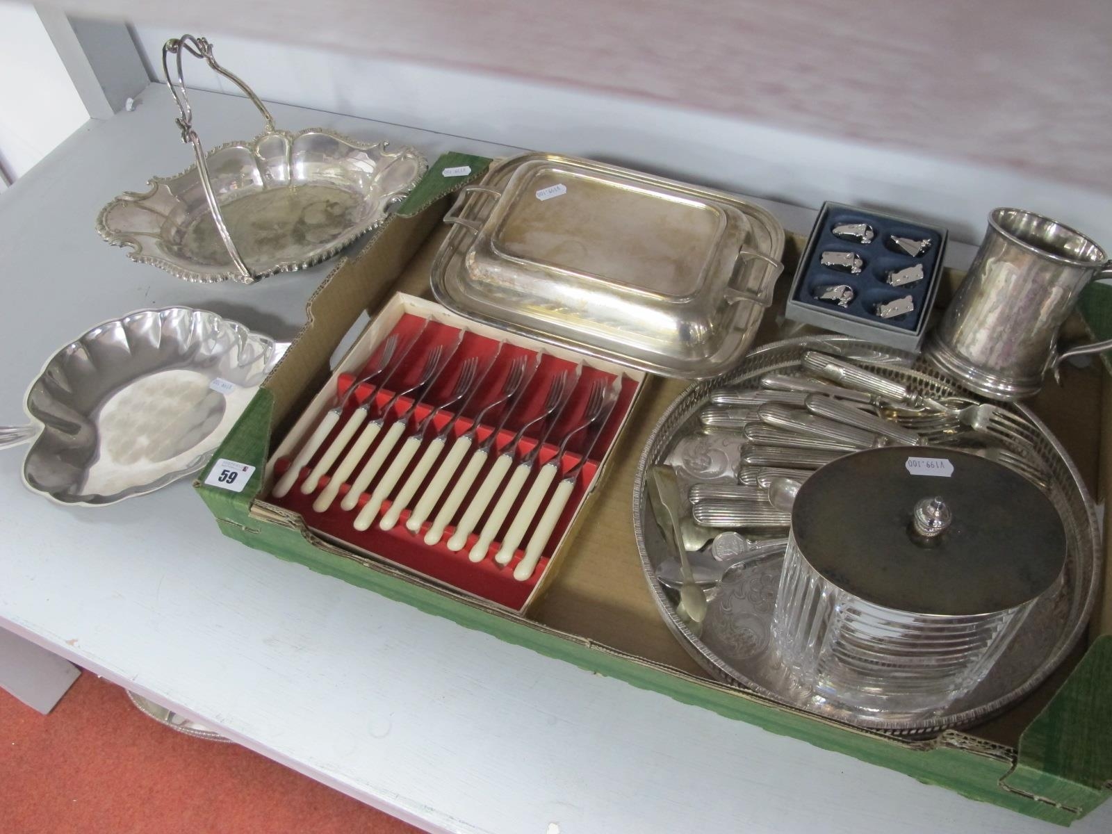 An Art Deco Style Cut Glass Biscuit Box, with oval plated lid, a plated entree dish, boxed set of fish knives and forks, novelty cheese menu holders, a XIX Century mug, decorative plated dish, circular plated tray, further cutlery etc.